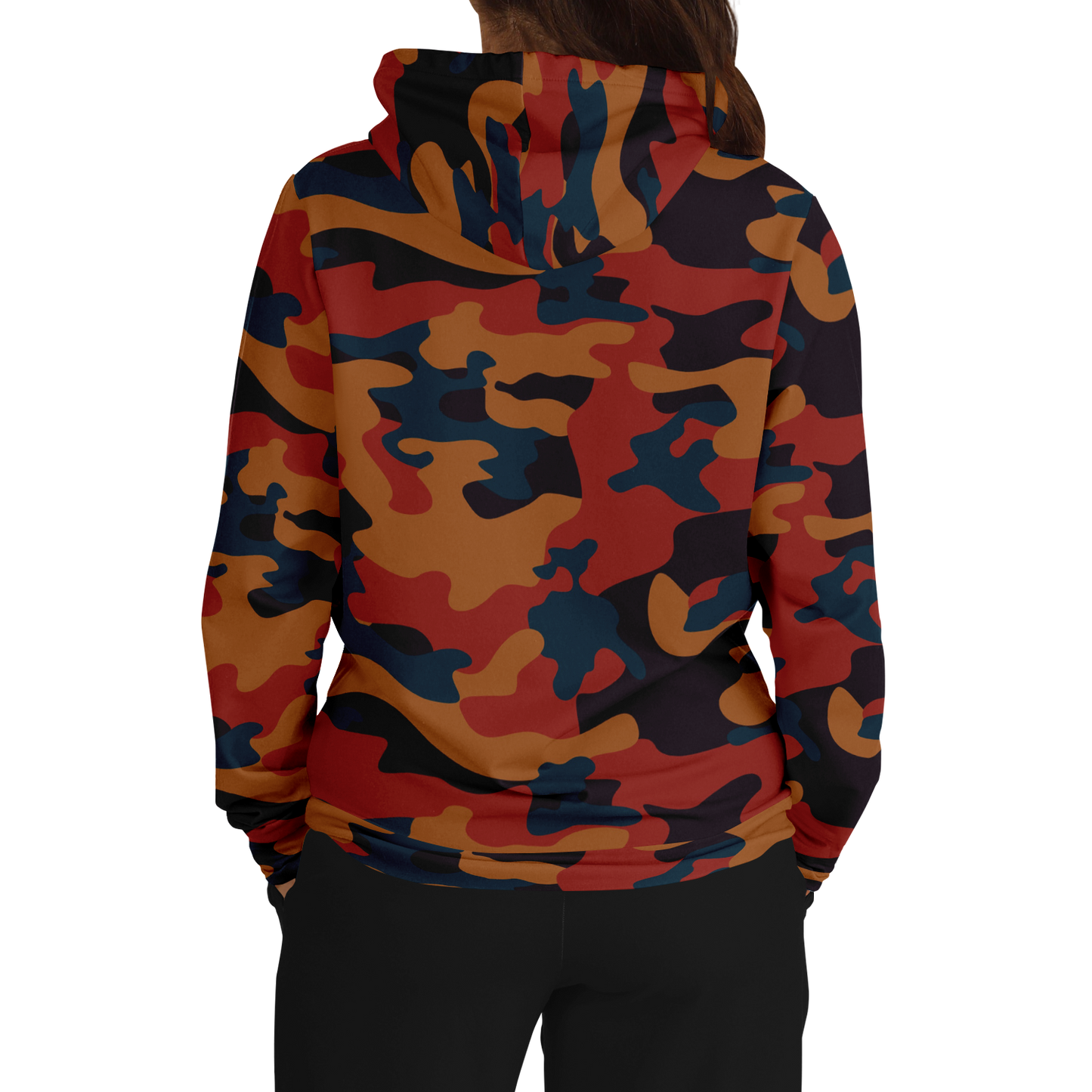The Camo Hoodie is a versatile and stylish addition to your wardrobe. Made from high-quality materials, this hoodie features a unique combination of brown, prussian blue, and auburn camouflage, perfect for outdoor enthusiasts and fashion-forward individuals alike. Stay warm and comfortable while standing out in style with the Camo Hoodie.