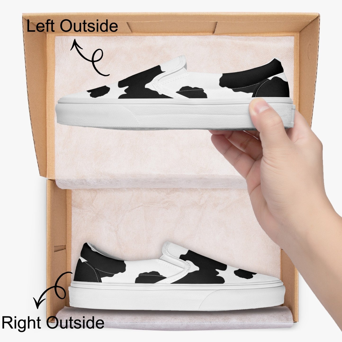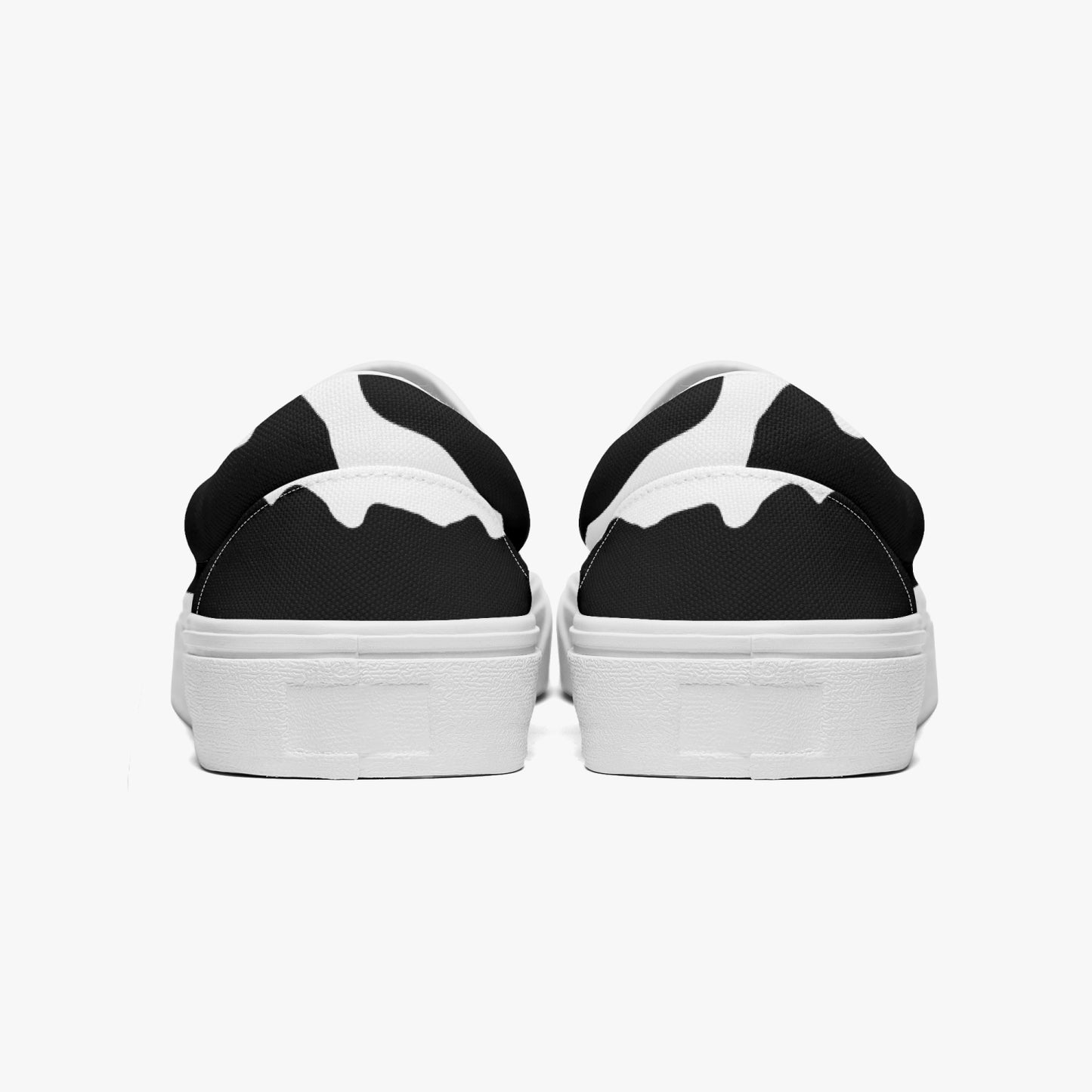 These Camo Slip-On Shoes feature a unique Black & White Cow Print design. Made for comfort and style, these shoes are perfect for any casual occasion. The camo pattern adds a trendy touch, while the slip-on design makes them easy to wear. Perfect for those who want to make a bold statement with their footwear.