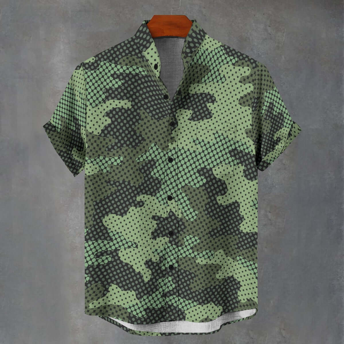 Step into the modern age with our Green Pixel Camo Short Sleeve Shirt For Men. Crafted from high-quality cotton, this shirt offers a soft and comfortable feel, all while adhering to sustainable fashion practices. The sleek small stand-collar design adds a touch of modern refinement, and the unique curved hem provides a contemporary and playful silhouette. This distinctive green pixel camo shirt pairs perfectly with casual pants, allowing you to effortlessly showcase your unique and forward-thinking style. Get yours now!