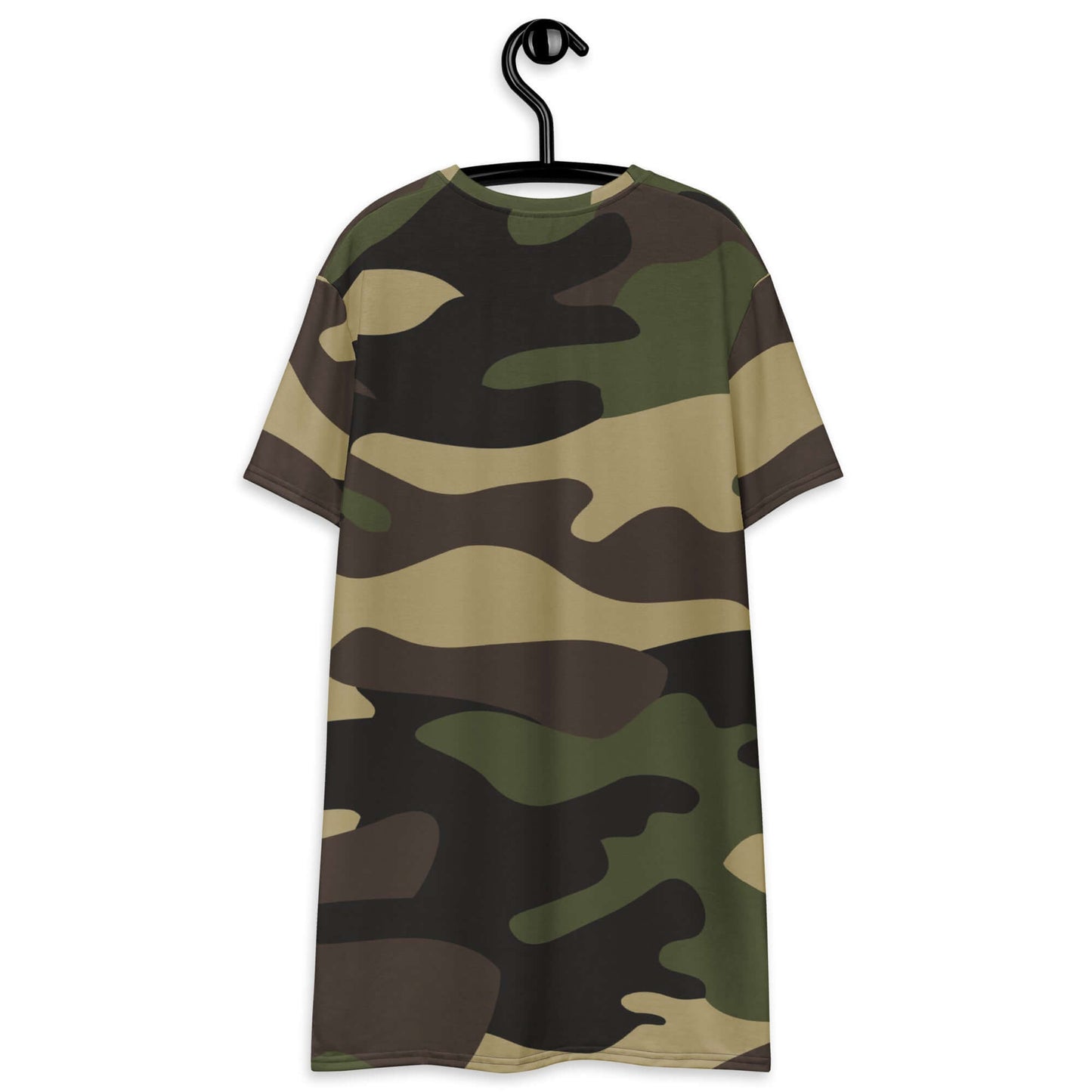 This T-shirt dress features a classic green camouflage print, perfect for adding a touch of edginess to your wardrobe. With its comfortable and versatile design, it can be dressed up or down for any occasion. Made with high-quality materials, it guarantees both style and comfort.
