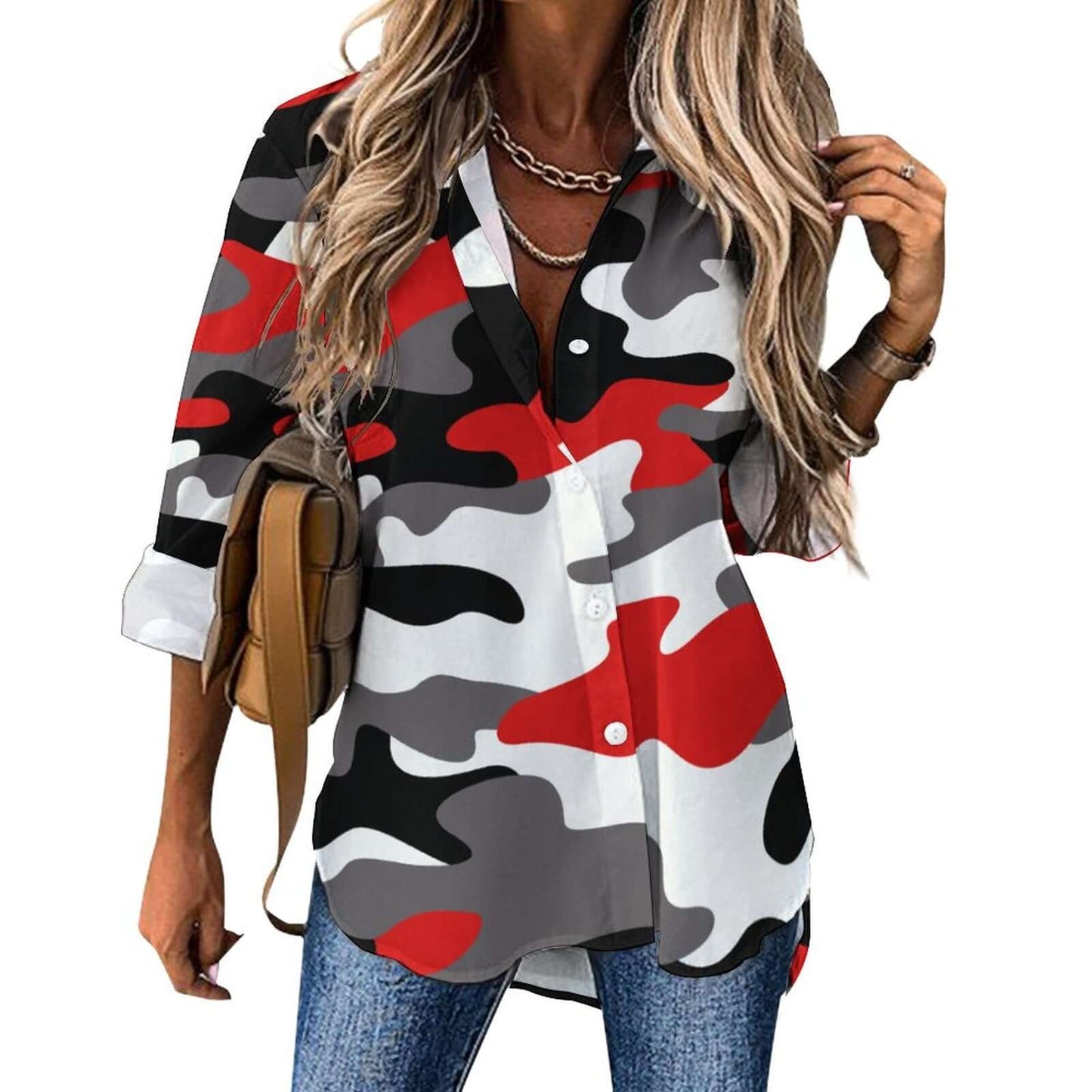 This women's button-up camo shirt is the perfect blend of style and functionality. Featuring a bold red, black, and white color scheme, it is made with high-quality materials for comfort and durability. The button-up design allows for easy on and off, making it a versatile addition to any wardrobe. Stay fashion-forward with this statement piece.