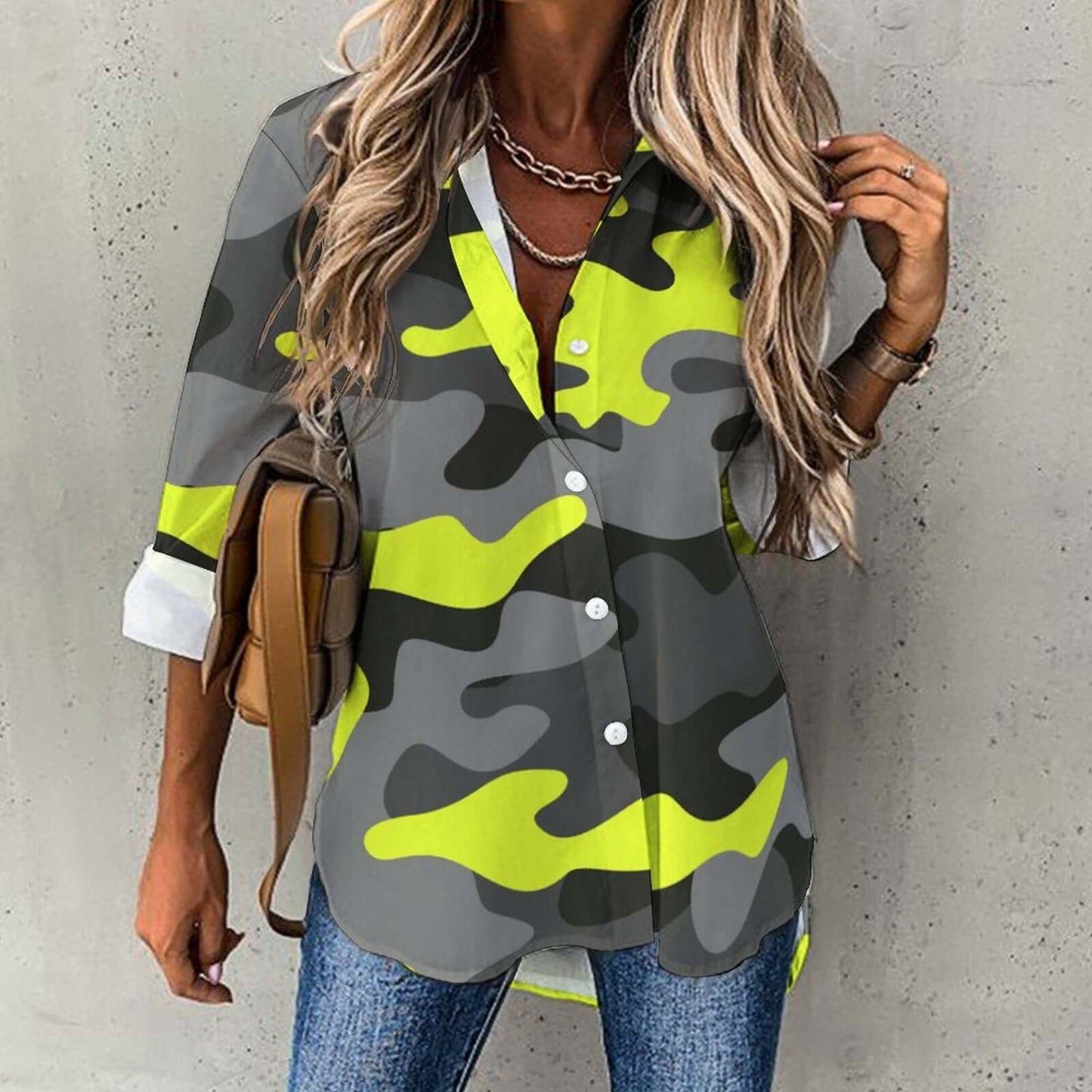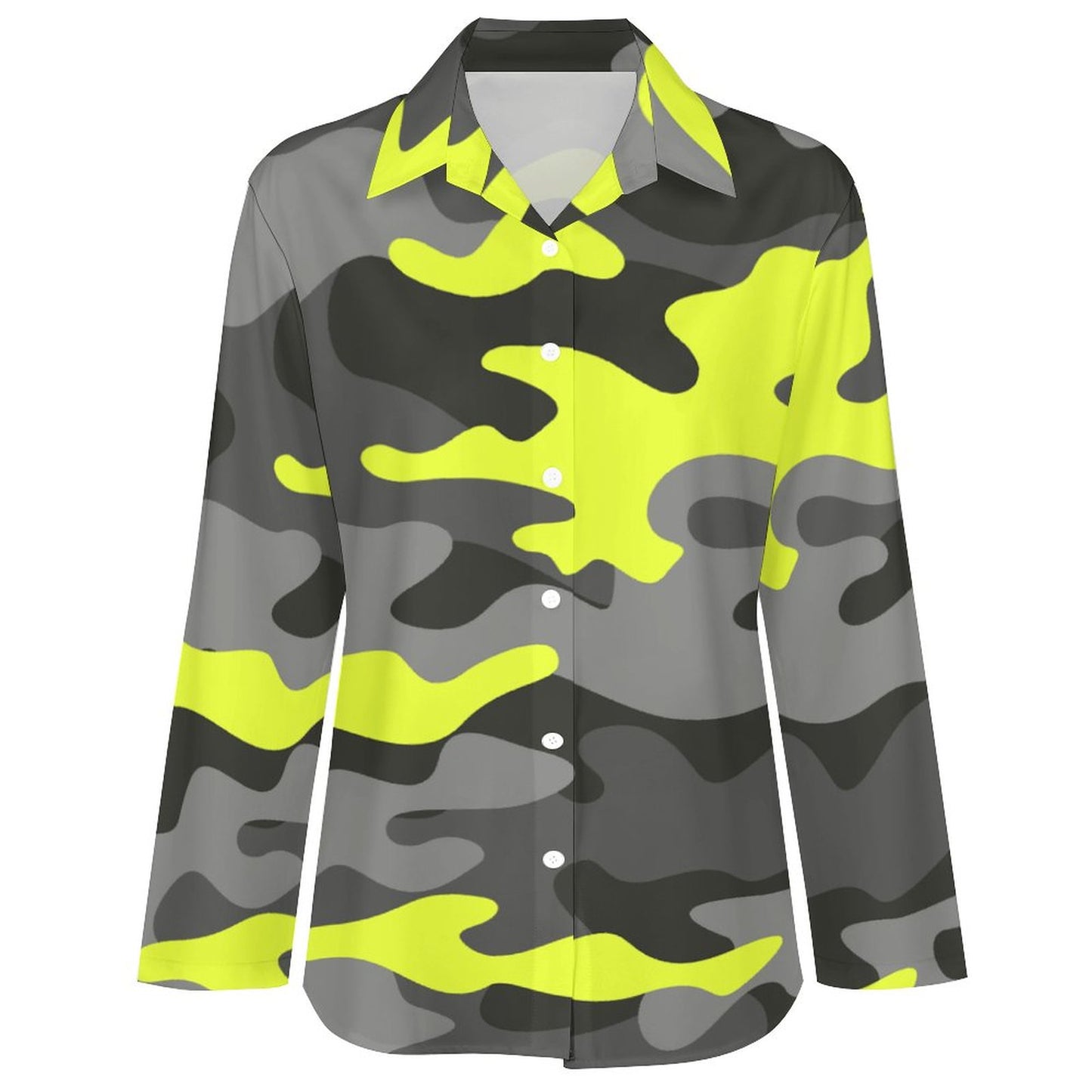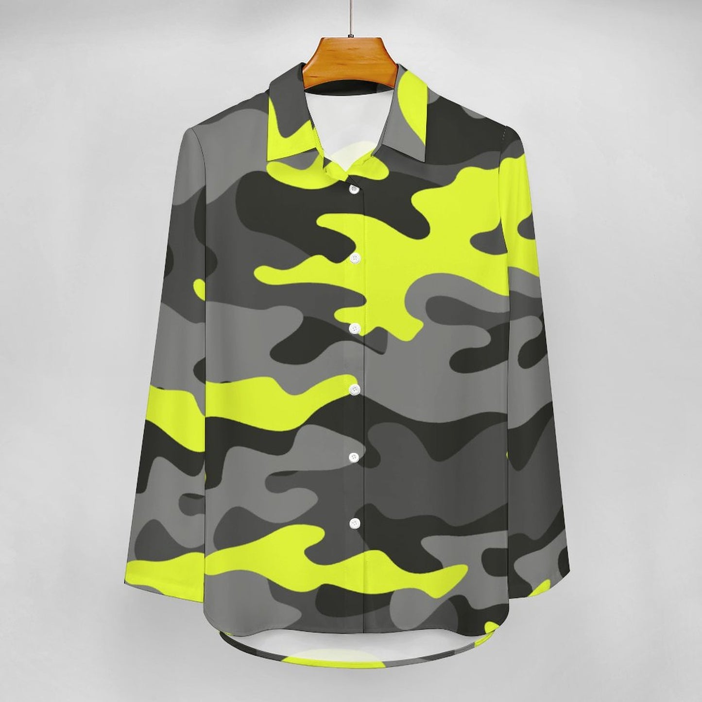 Crafted with a bold camo pattern in shades of yellow, black, and gray, this women's button-up shirt is a versatile and stylish addition to any wardrobe. Made with high-quality materials, it offers both comfort and durability for all-day wear. Perfect for a casual yet fashionable look.