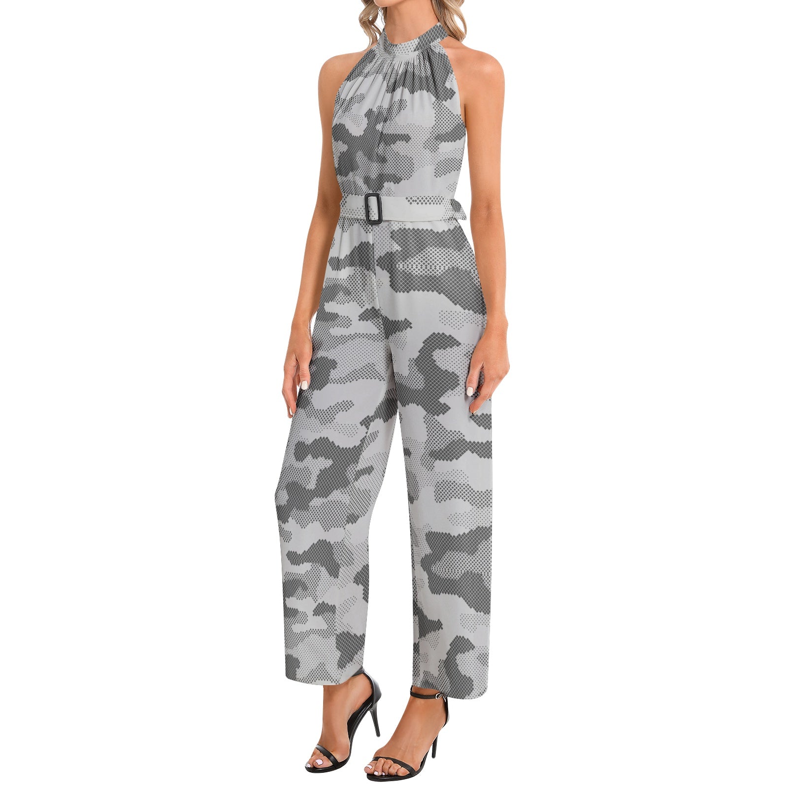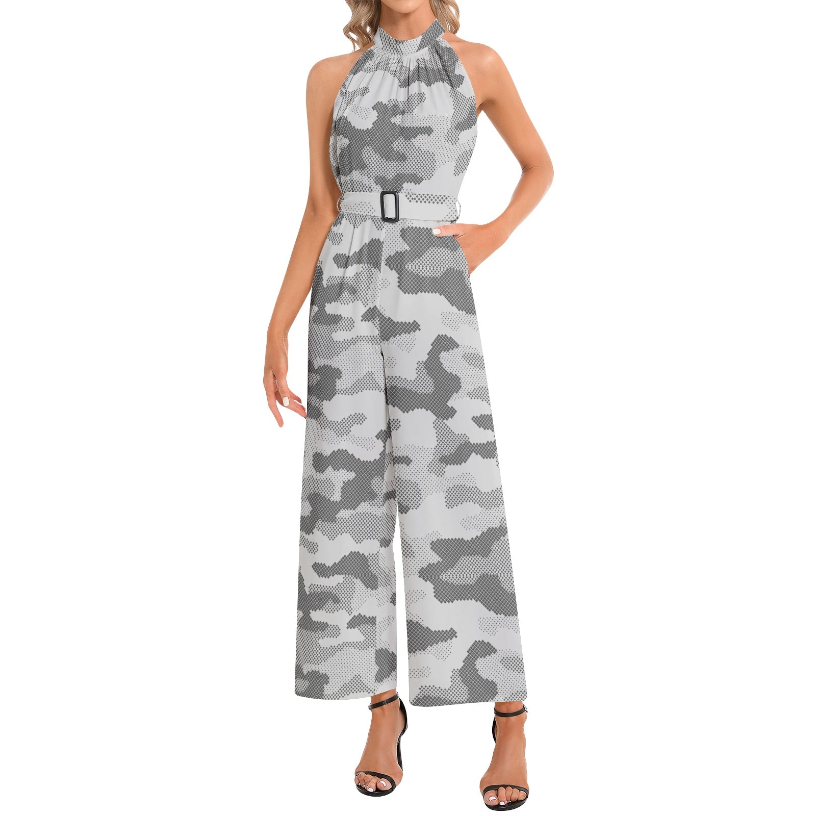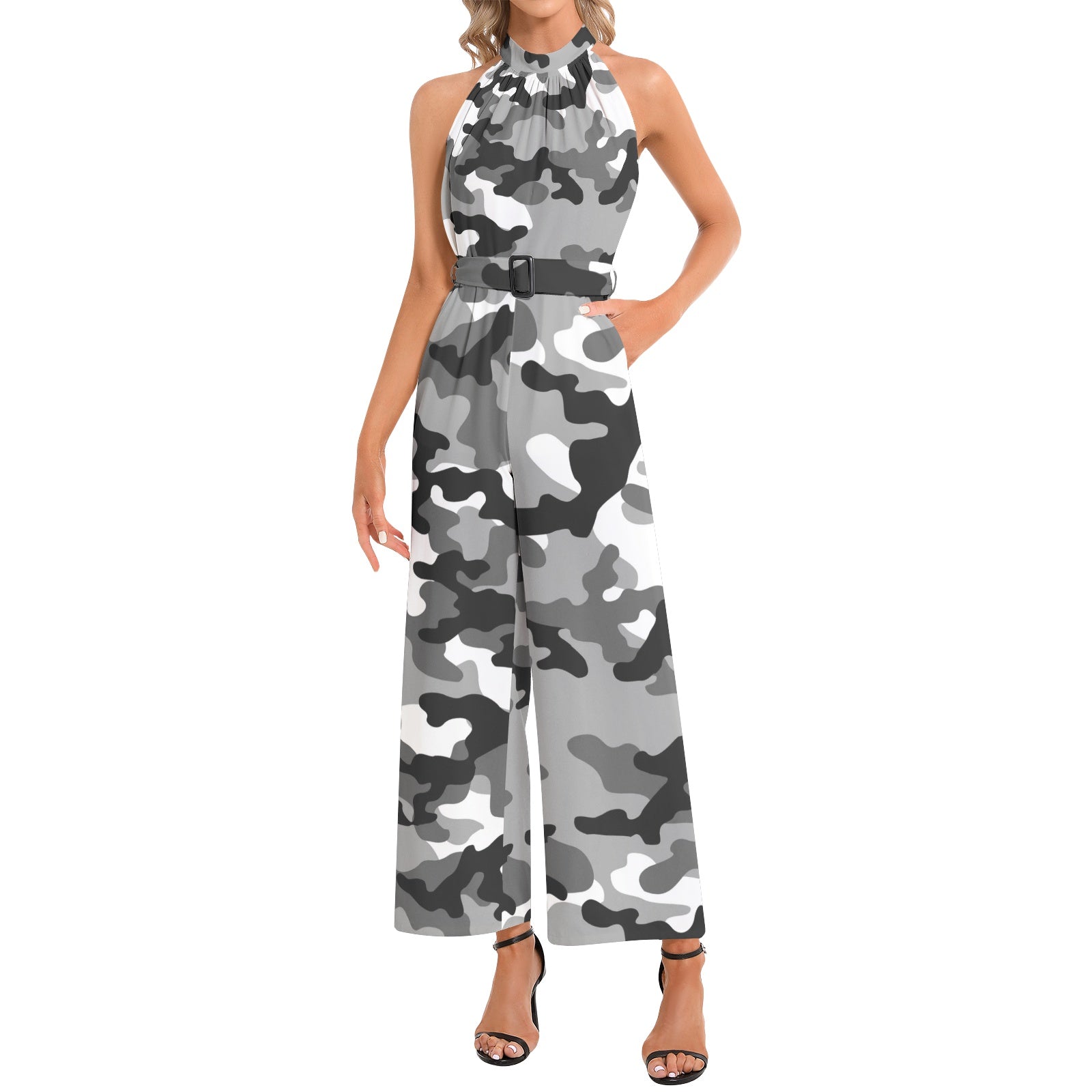 Camo Jumpsuit | Belted Halter Neck | Gray, Black and White