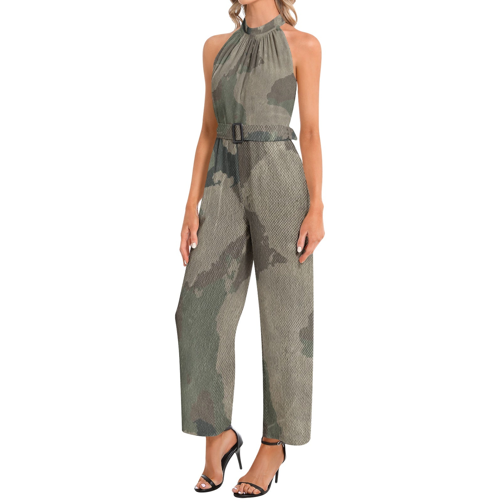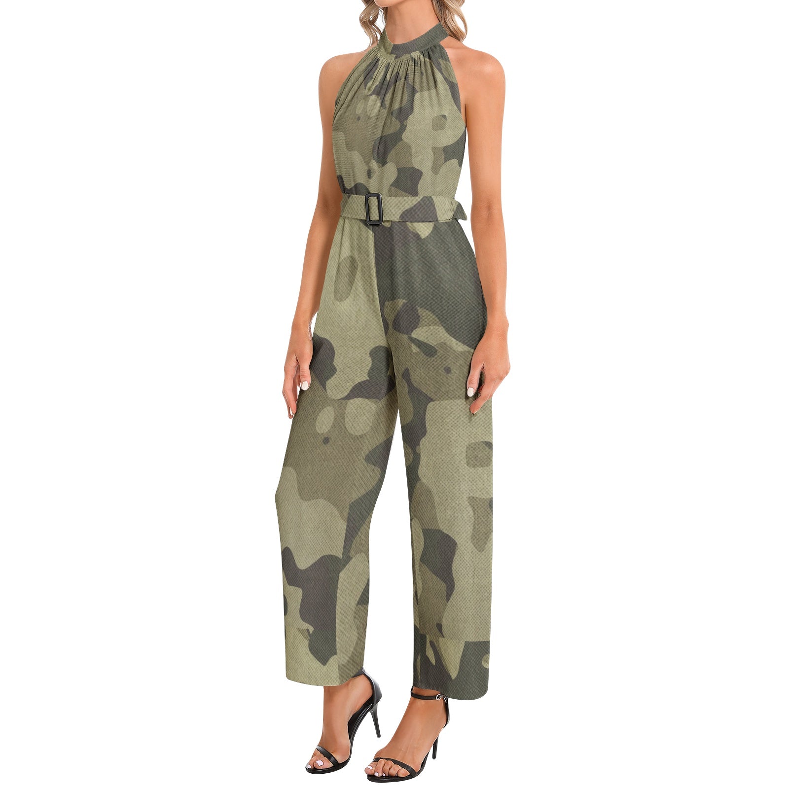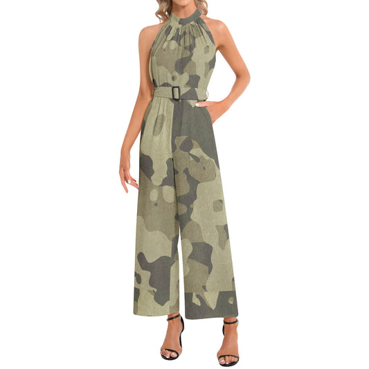 Camo Jumpsuit | Belted Halter Neck | Green Fabric