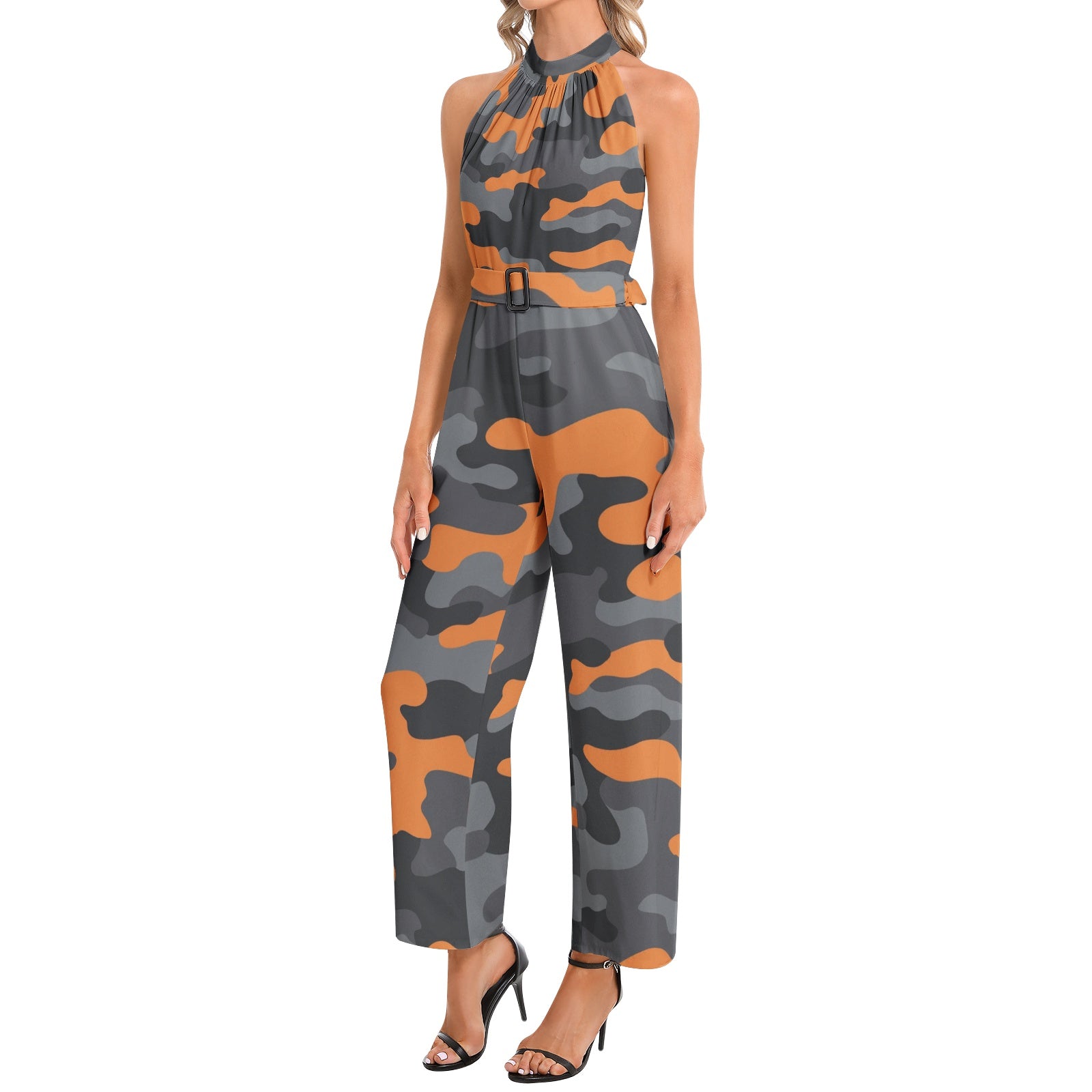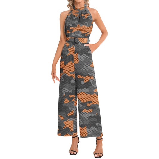 Camo Jumpsuit | Belted Halter Neck | Orange, Black and Gray