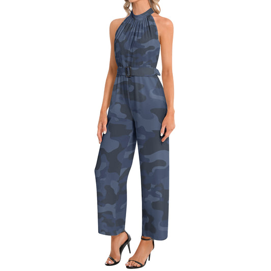 Camo Jumpsuit | Belted Halter Neck | Deep Blue