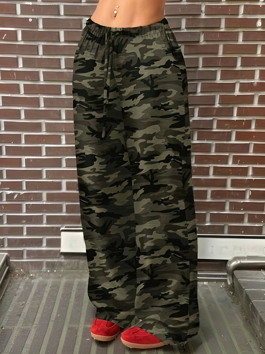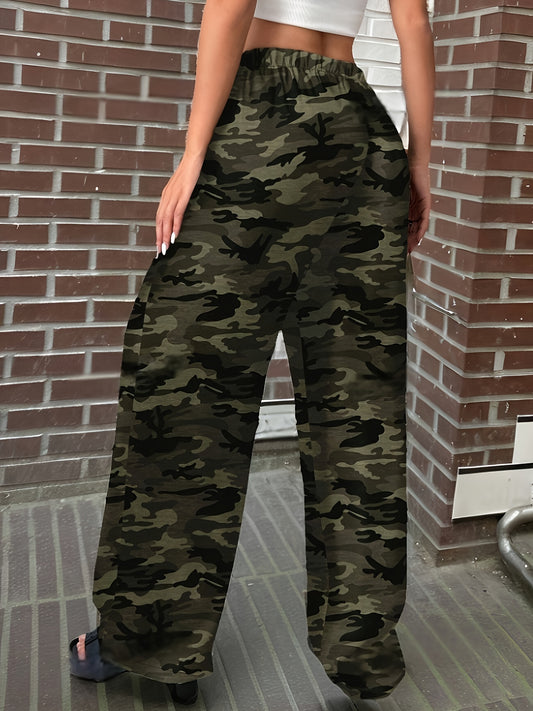 Women's Camo Print Wide-Leg Pants | Casual, Stretchy Polyester Blend