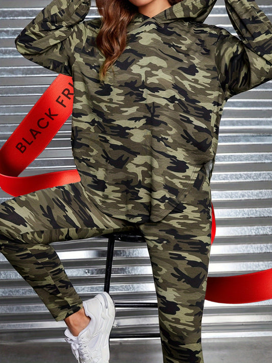 Chic Camo Print Hoodie & Leggings Set for Women - Stretchy Polyester Blend
