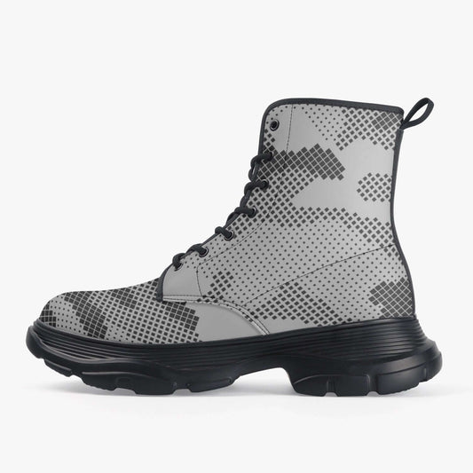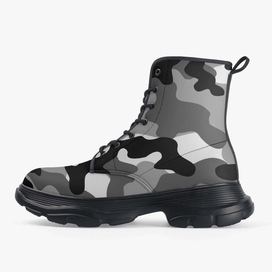 Chunky Boots | Leather in Gray, Black, & White Camouflage