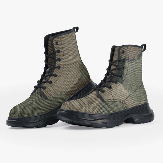 Step into adventure with our Camo Chunky Boots Collection, a versatile unisex option available in various camo colors. These boots feature a strong leather surface, ensuring durability for long-term wear. Crafted with lightweight rubber and eco-friendly PU leather uppers, they offer both comfort and sustainability. Inside, soft EVA foamed insoles and a breathable mesh lining provide all-day comfort. Plus, the waterproof and anti-moisture design makes these boots ideal for both everyday use and hiking in the wild. With a money-back guarantee, these boots are the perfect blend of style and functionality.