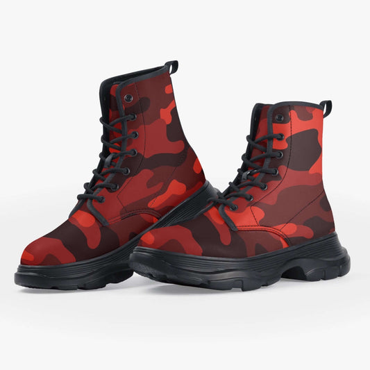 Chunky Boots | Leather in Scarlet Red & Black Camouflage
