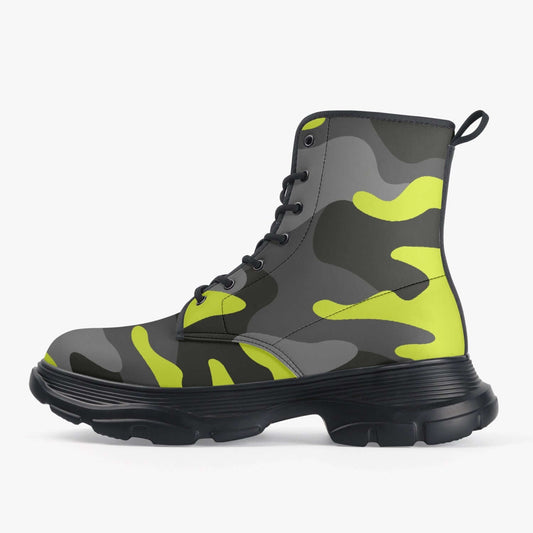 Chunky Boots | Leather in Yellow, Black, & Gray Camouflage
