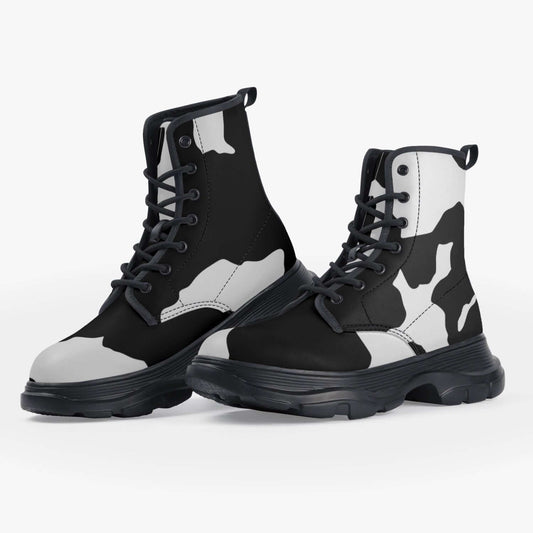 Chunky Boots | Leather in Black & White Cow Print Camouflage