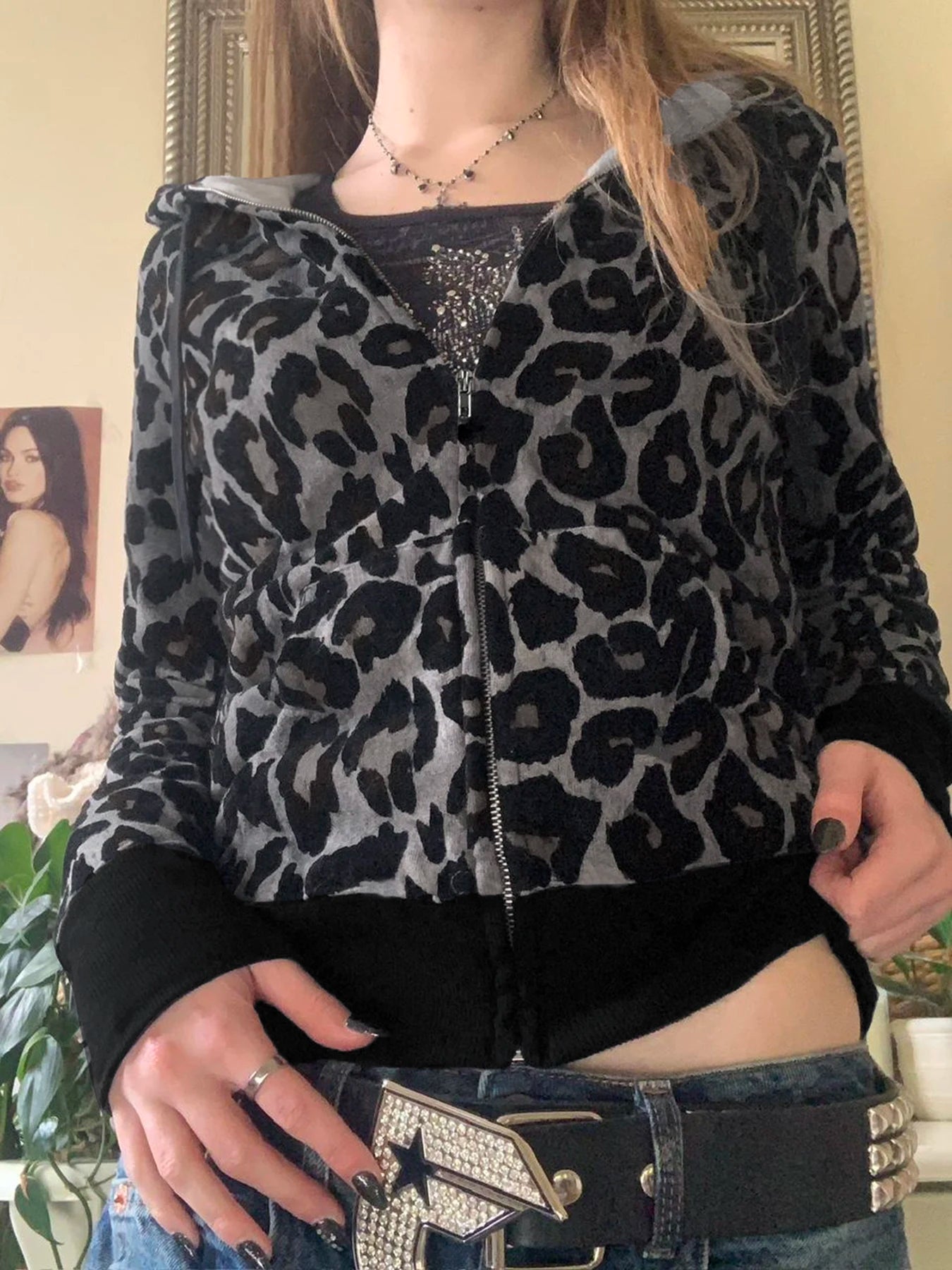 Y2K Retro Gothic Leopard Print Zip Hoodie – Harajuku Casual Top