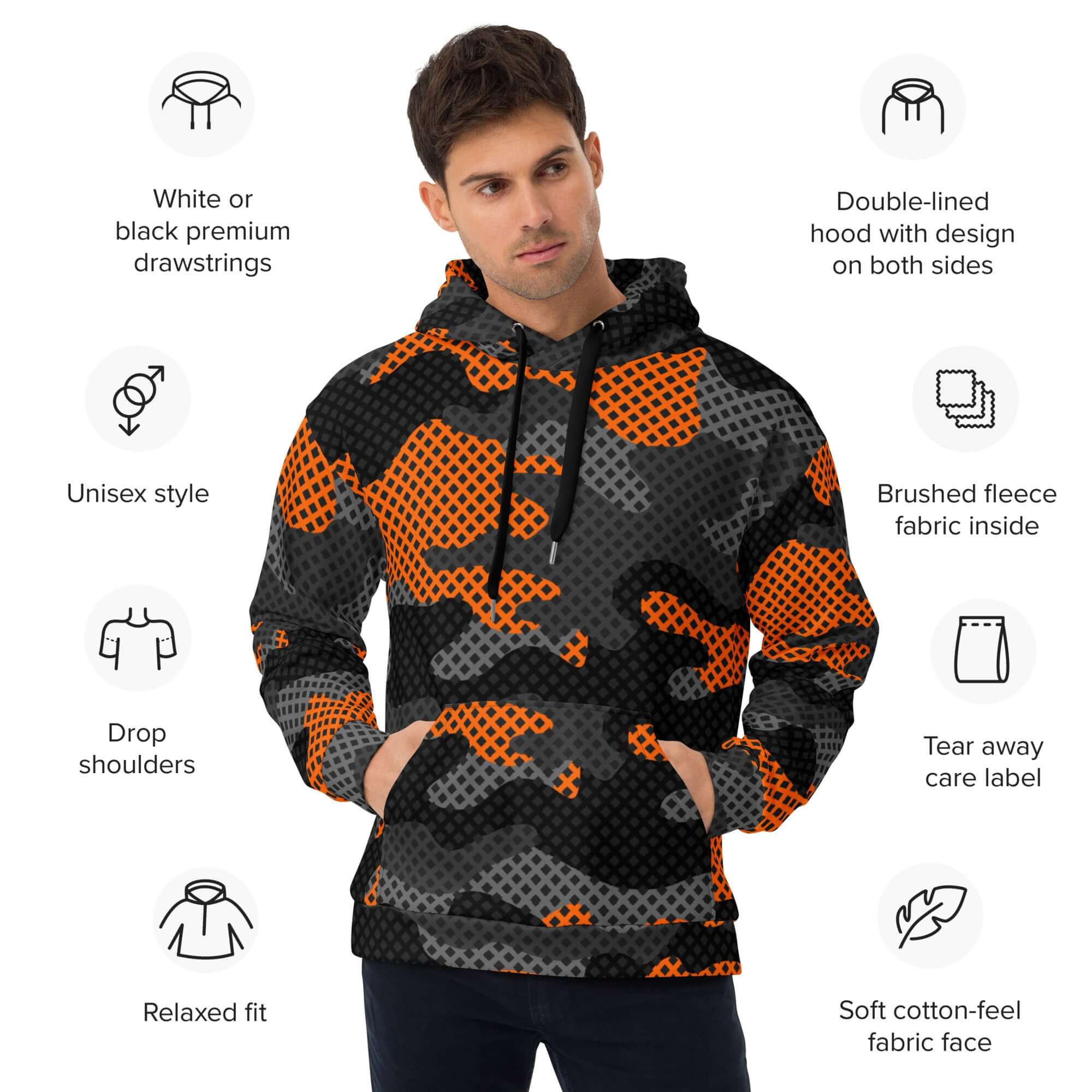 Stay warm and stylish in our Army-Style Hoodie. Designed with eye-catching Orange and Black Pixel Camo, this hoodie is made to stand out. The perfect blend of fashion and functionality, it's ideal for any outdoor enthusiast. Plus, with its army-inspired design, you'll be ready for any adventure.