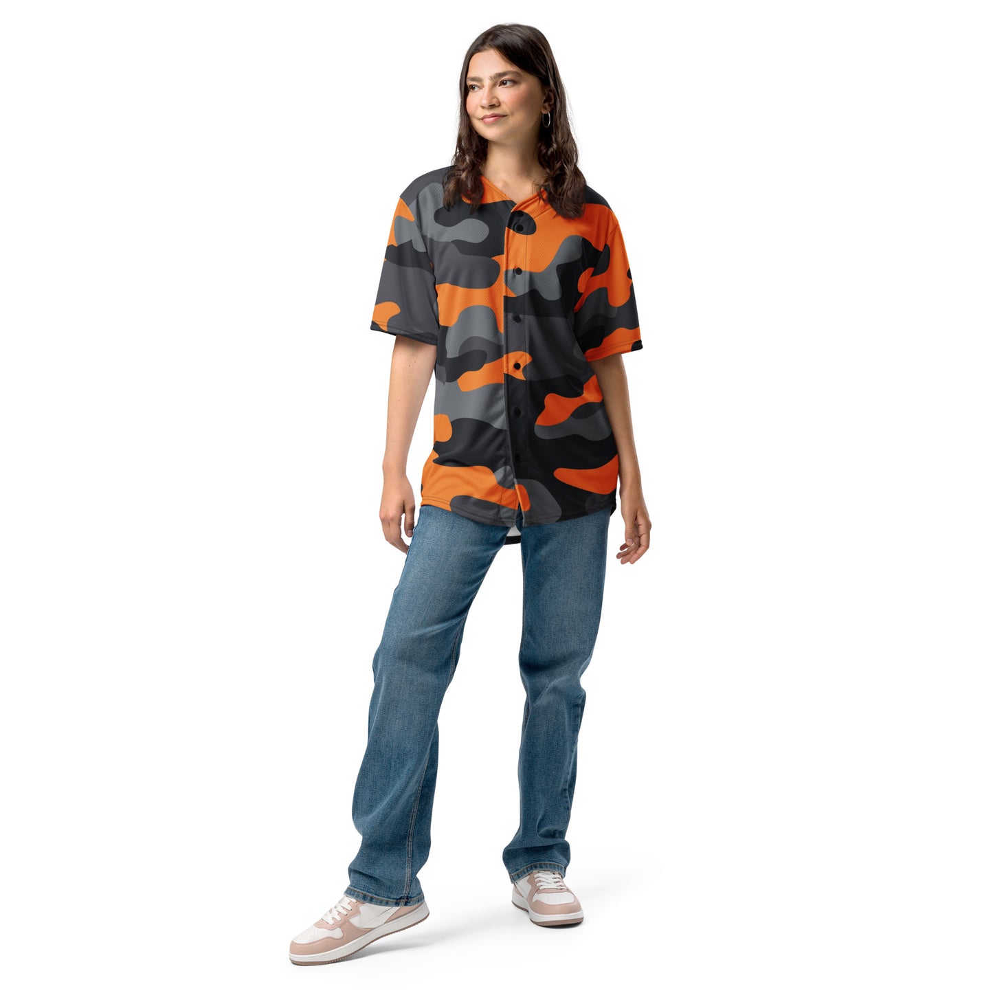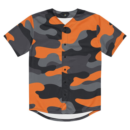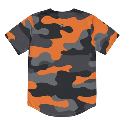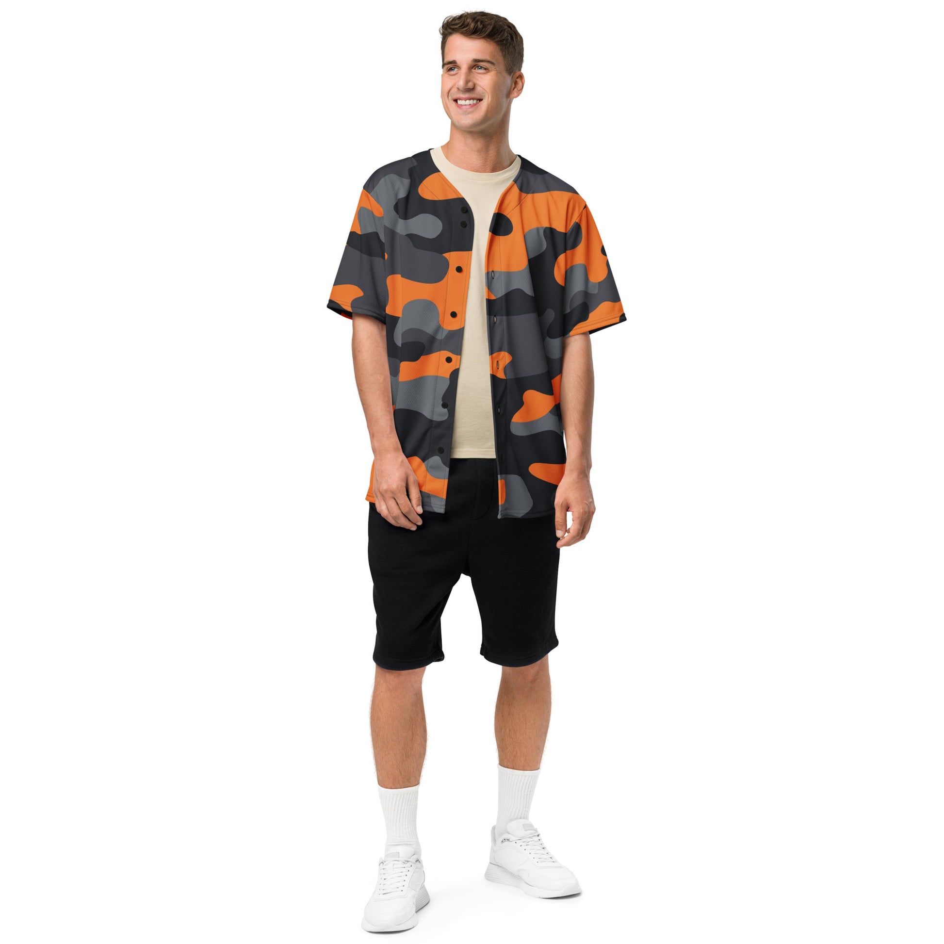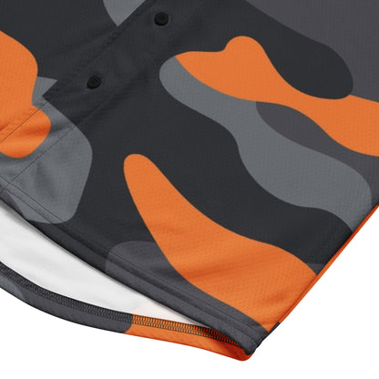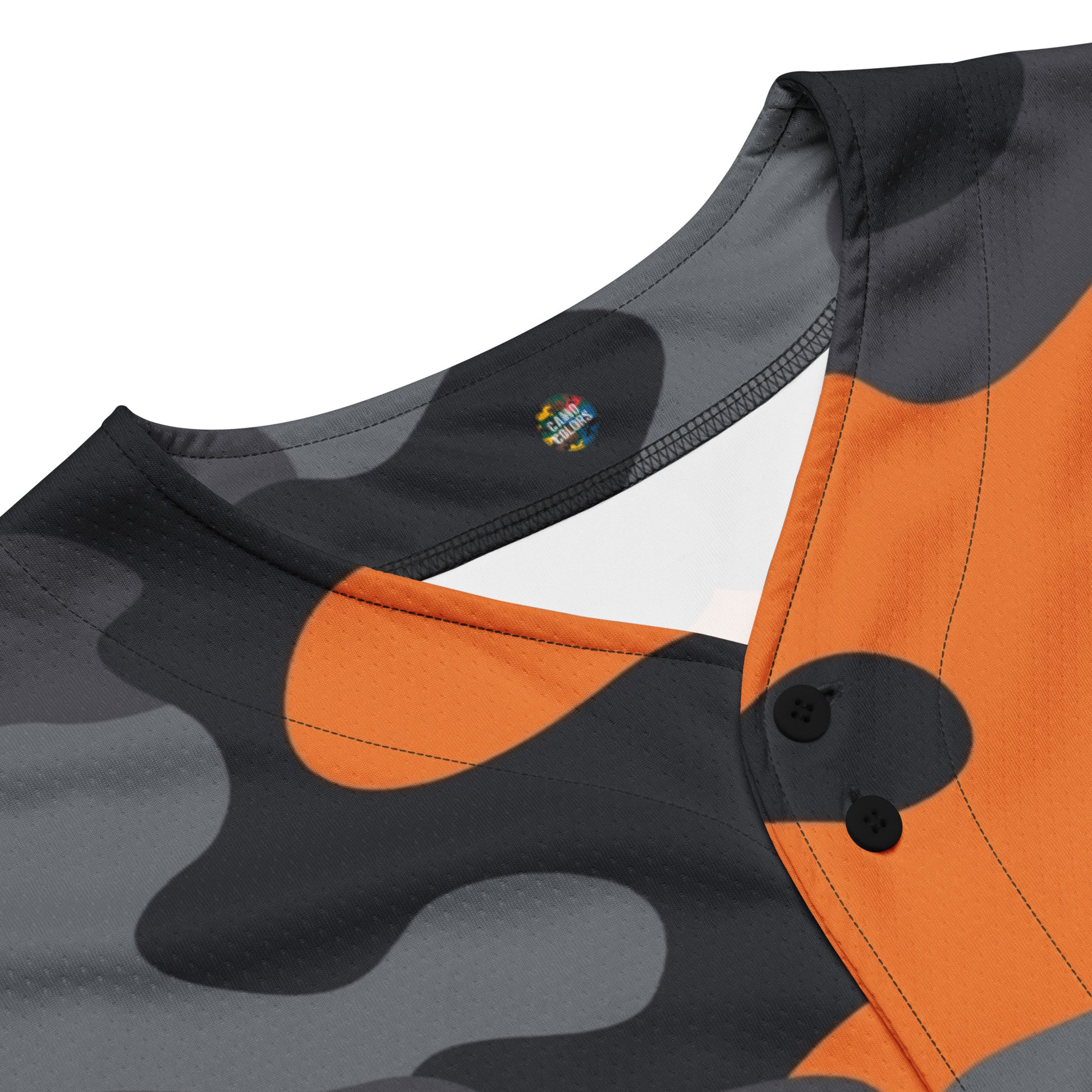 Made for the fashion-forward athlete, our Camo Baseball Jersey adds a bold edge to your game. With a unique Orange, Black, and Gray Camouflage design, you'll stand out on the field while staying comfortable and cool. Perfect for completing your all-star look.