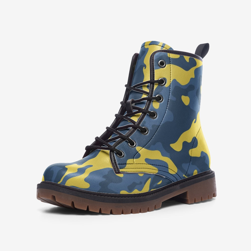 Effortlessly blend style and functionality with our Blue and Yellow Camo Boots. Made with lightweight leather, these boots offer comfort and durability for all-day wear. Stand out with our unique camo design while enjoying the benefits of high-quality materials. Perfect for any outdoor adventure.