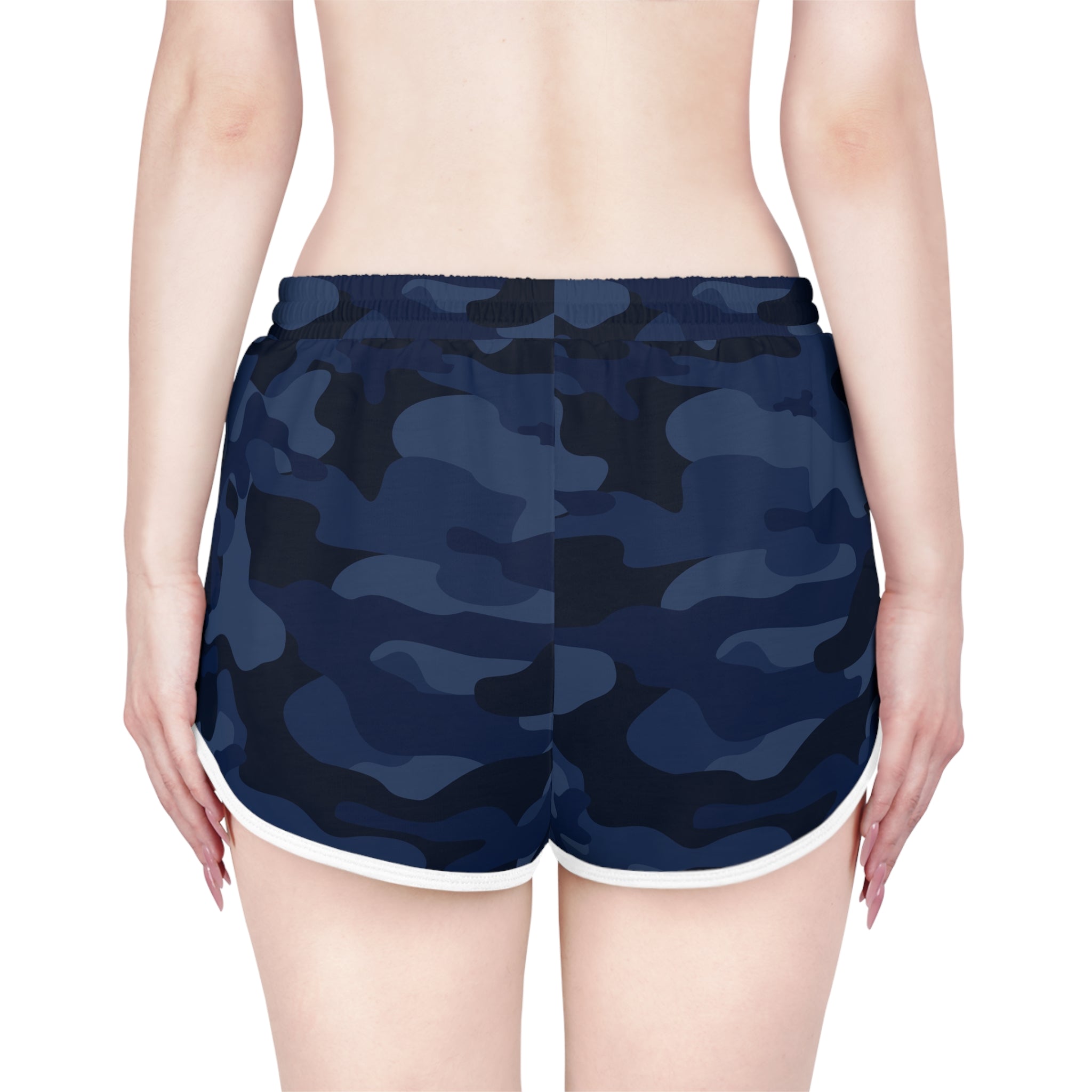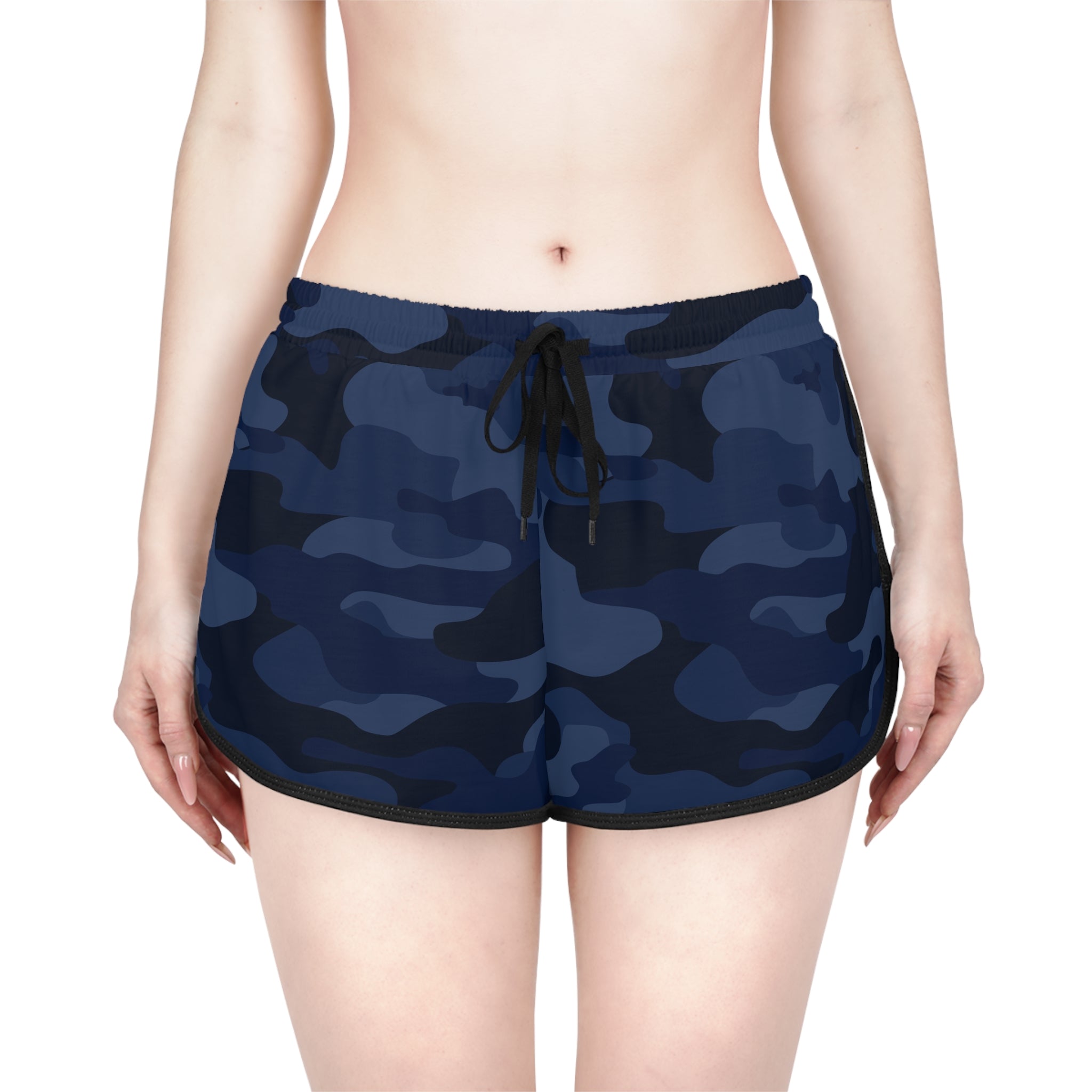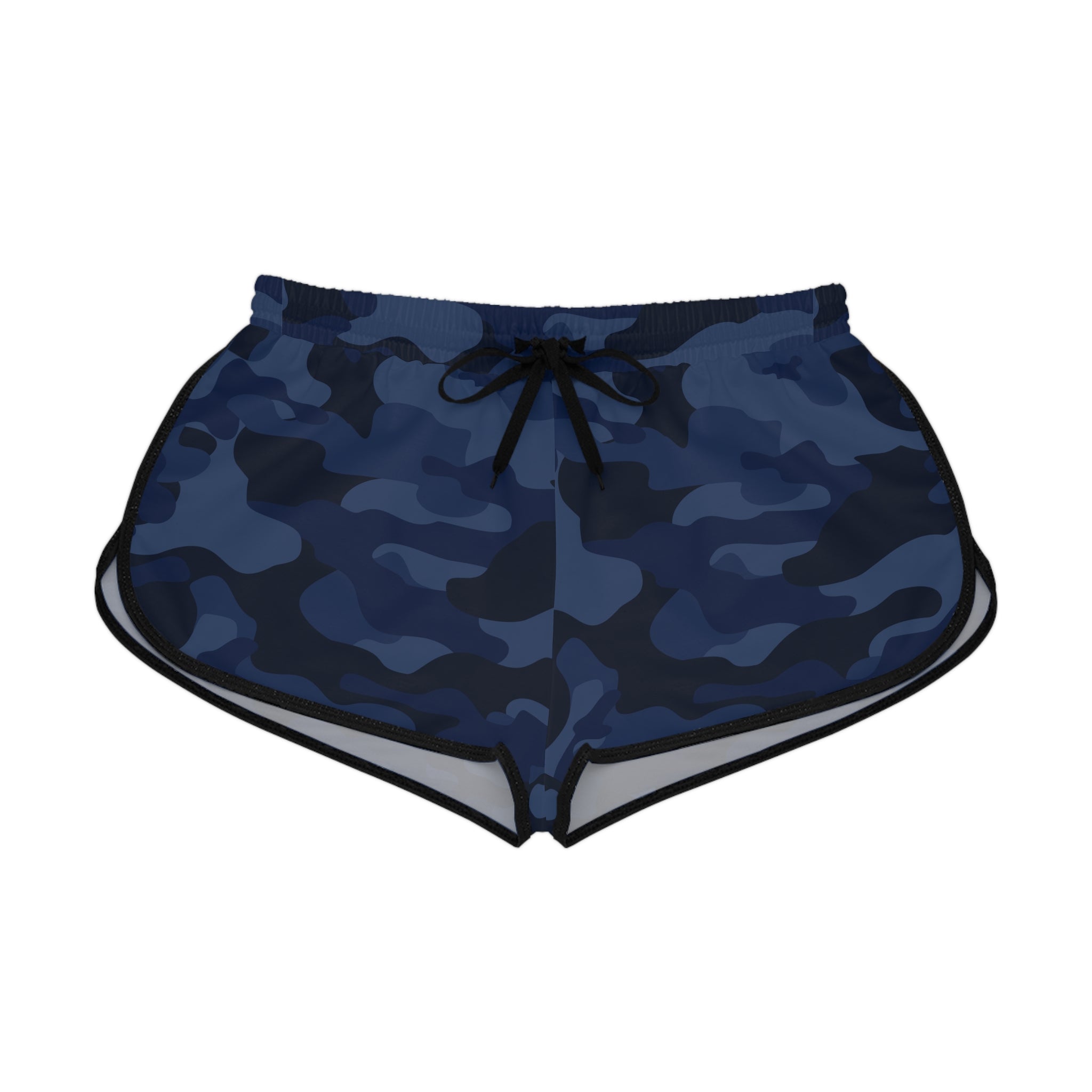 Blue Camo Shorts For Women that are perfect for casual days out or lounging at home. These relaxed fit shorts are made of 100% polyester, ensuring durability and quick drying. The drawstring waist allows for a customizable fit, and the soft fabric provides comfort with a touch. The curved bottom hem adds a stylish touch to these versatile shorts.