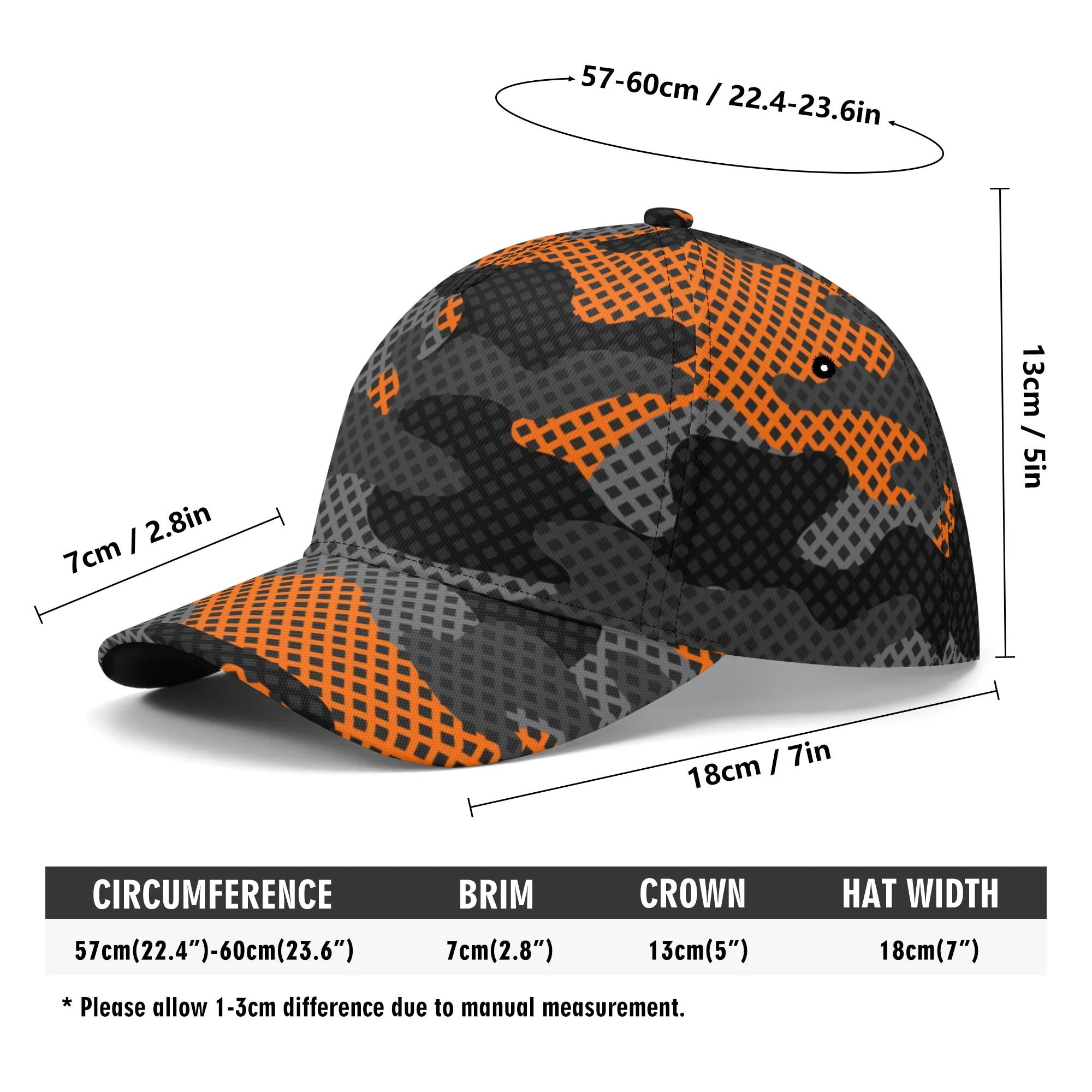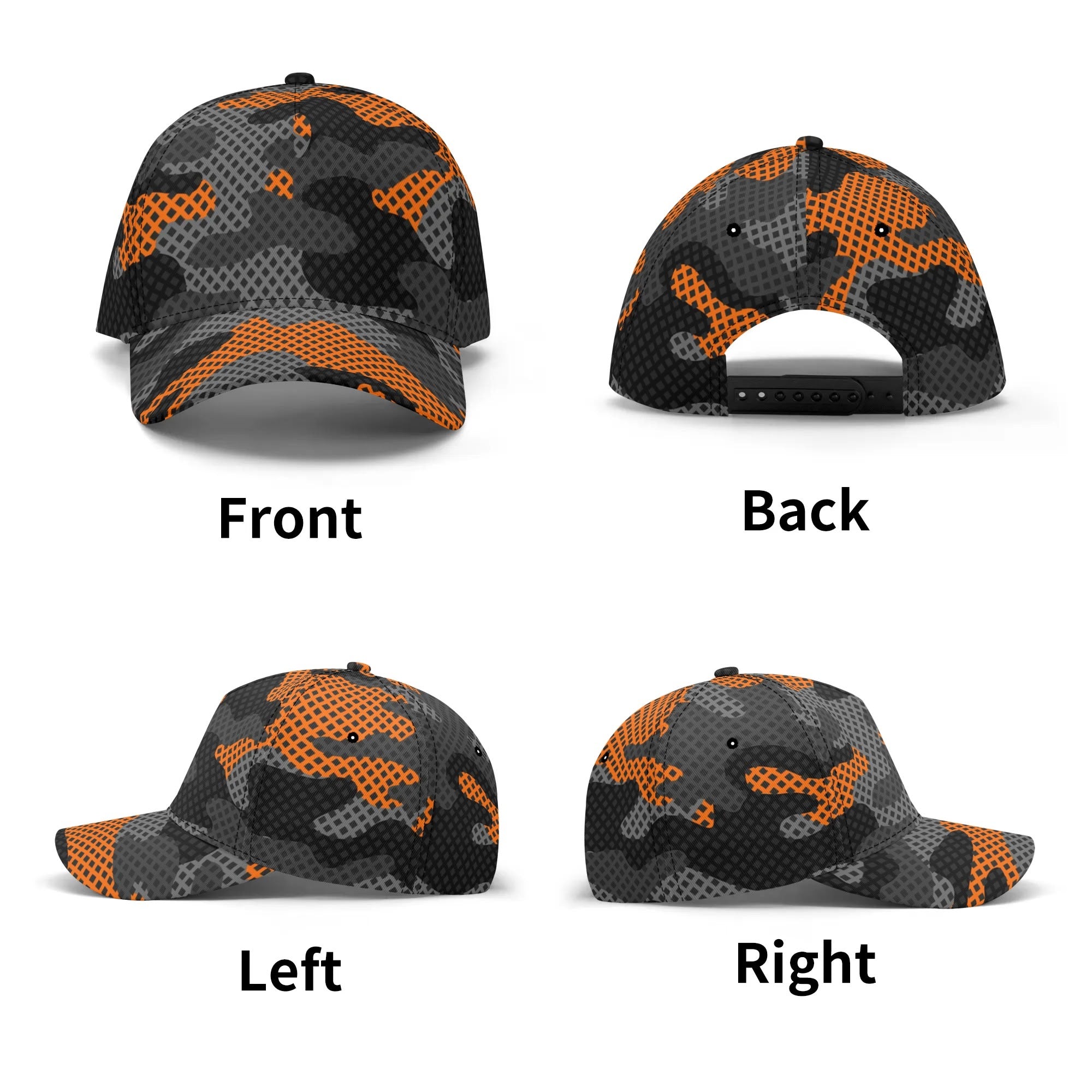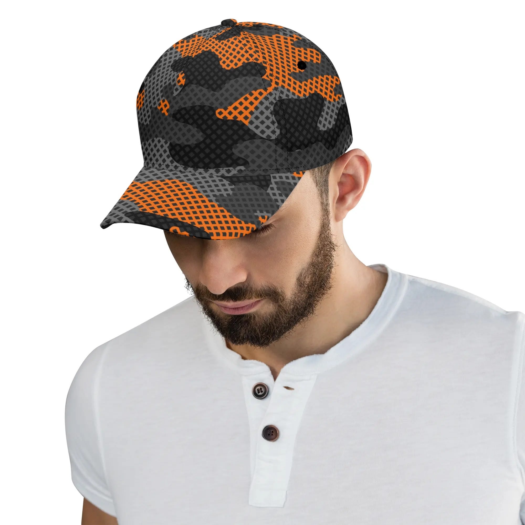 Stay cool and blend in with this Camo Baseball Cap featuring a unique Black & Orange Pixel Camouflage design. Made with high-quality materials, this cap offers both comfort and style. Perfect for outdoor activities or adding a touch of urban edge to your look.