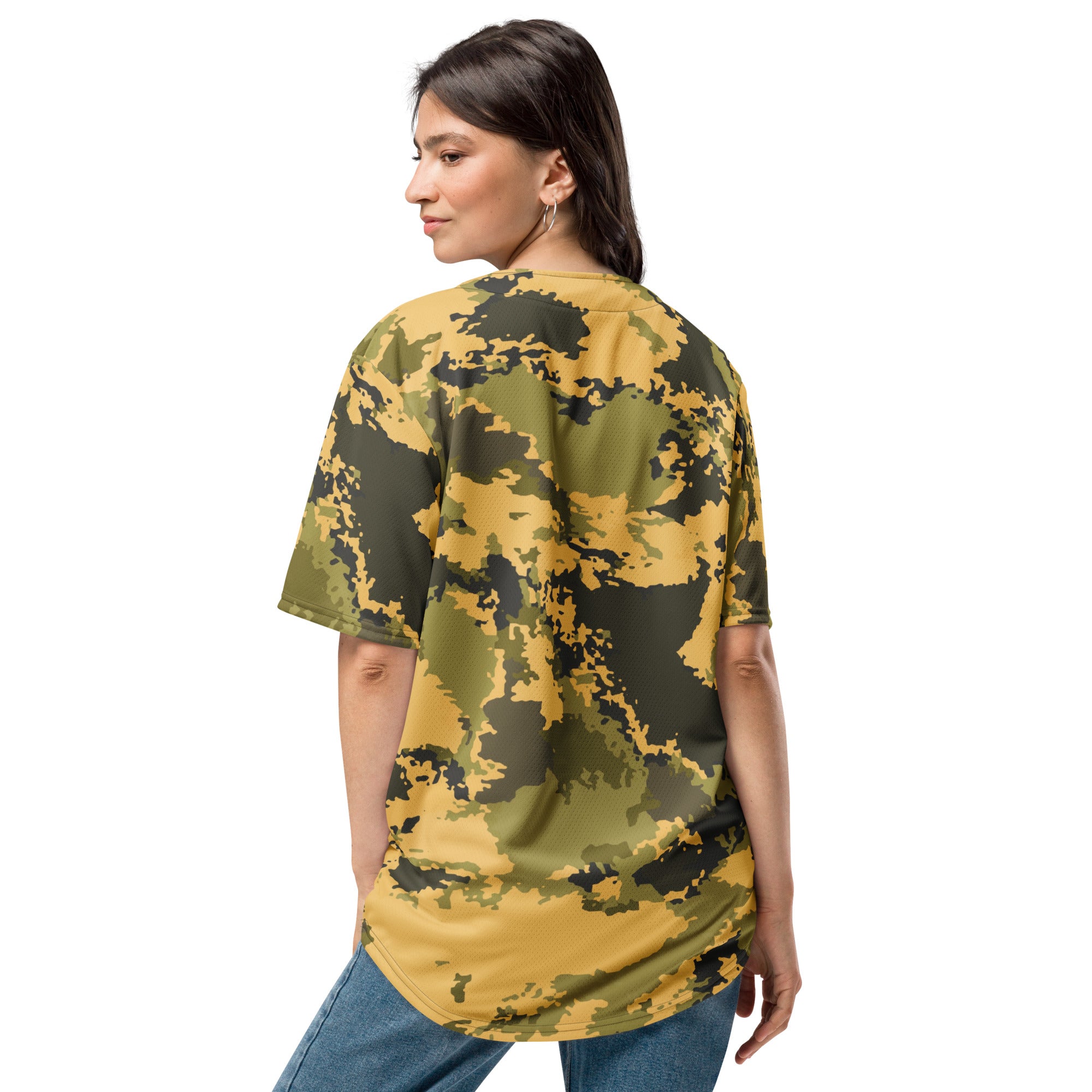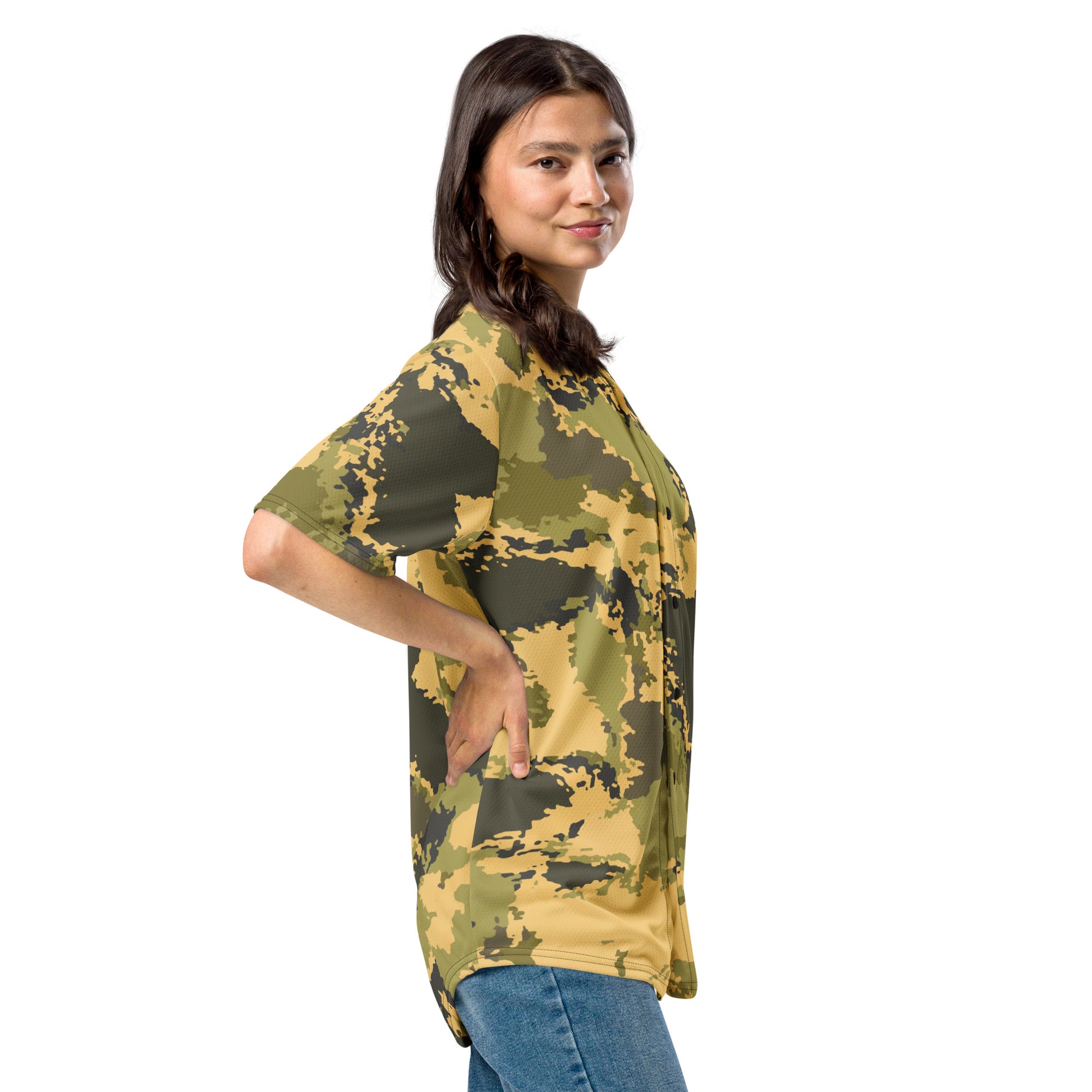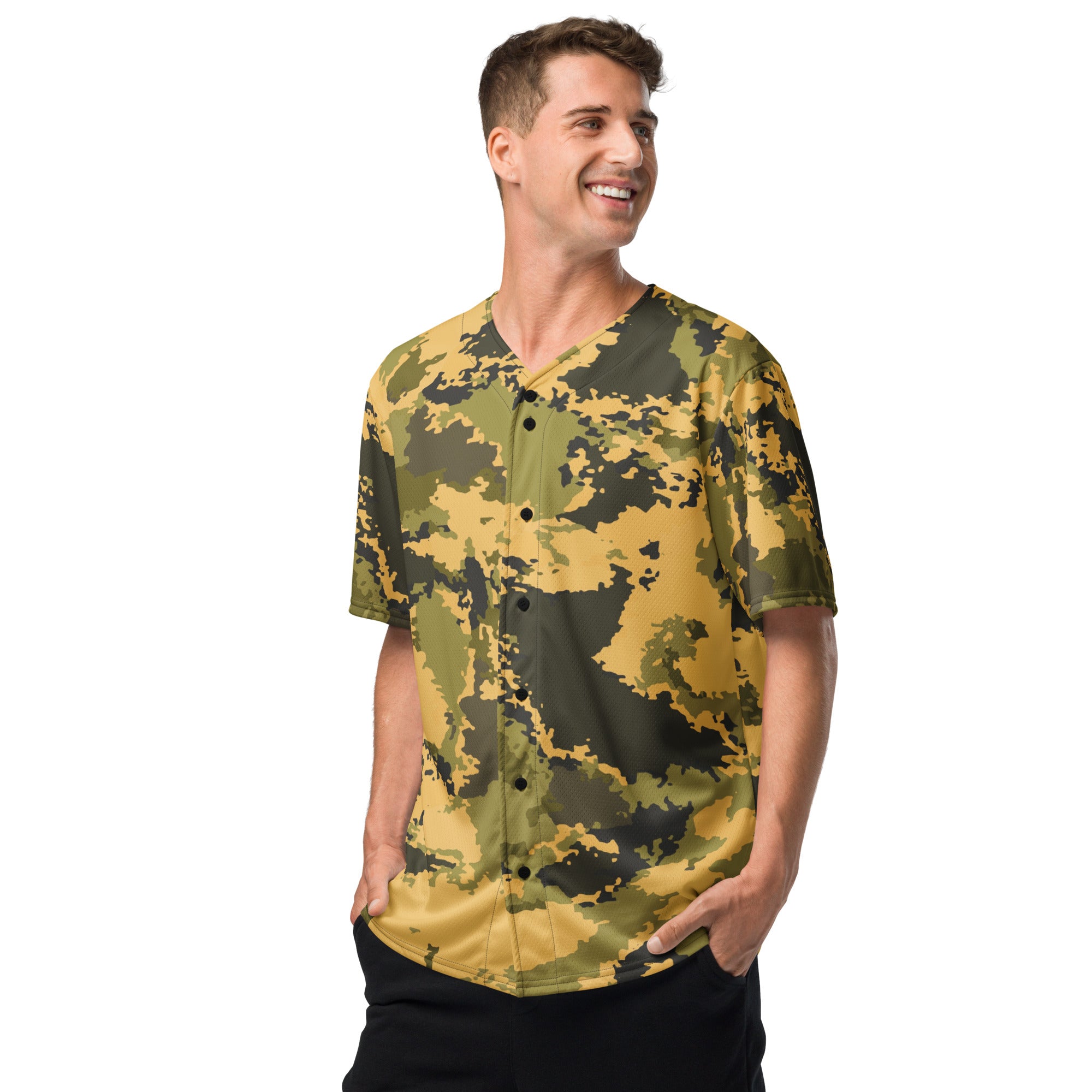 This Camo Baseball Jersey in Desert Green Watercolor Camouflage is perfect for any outdoor enthusiast. The unique design not only adds a touch of fashion to your outfit, but also provides functional benefits such as blending in with your surroundings. Stay comfortable and stylish in this jersey made with high-quality materials.