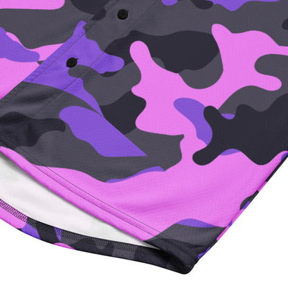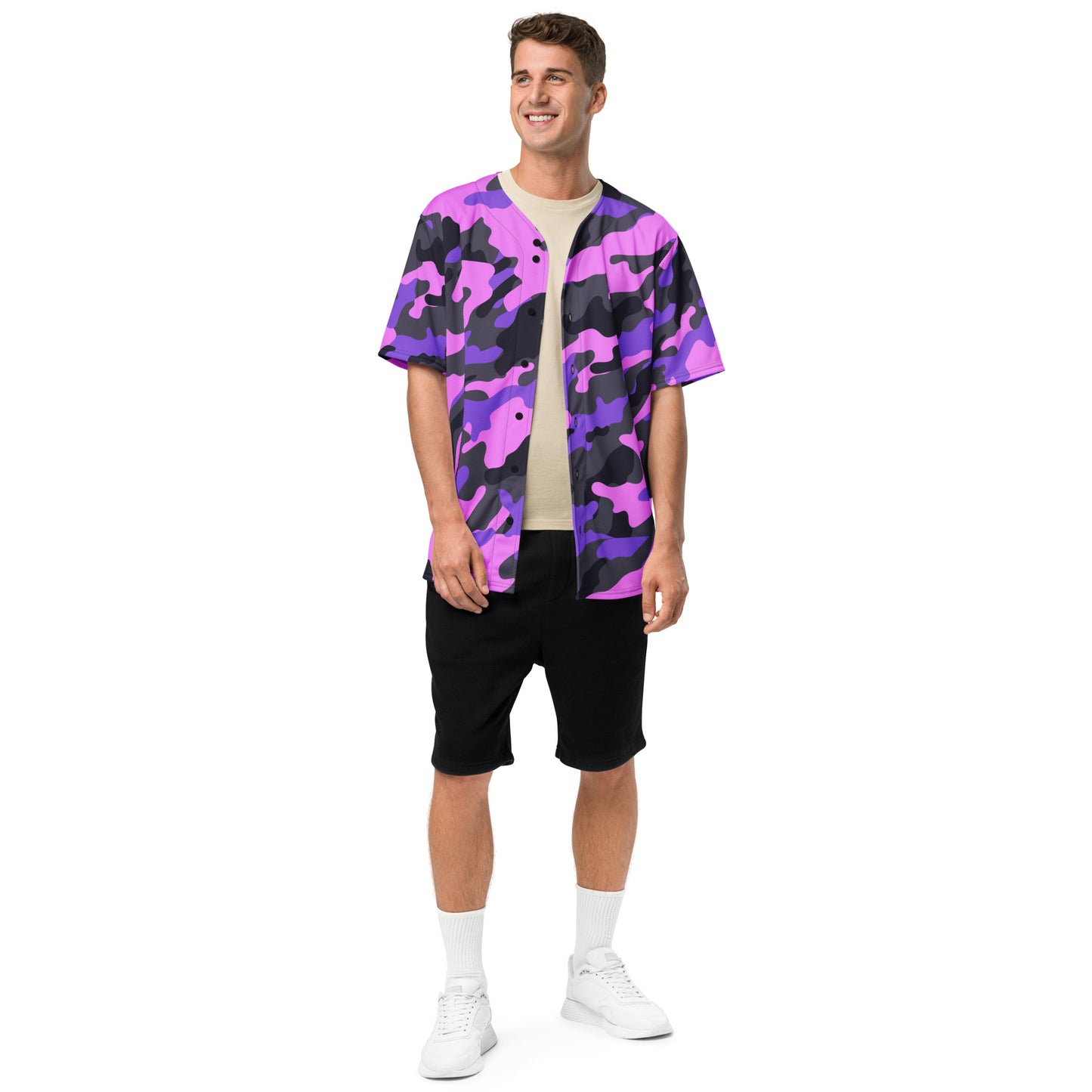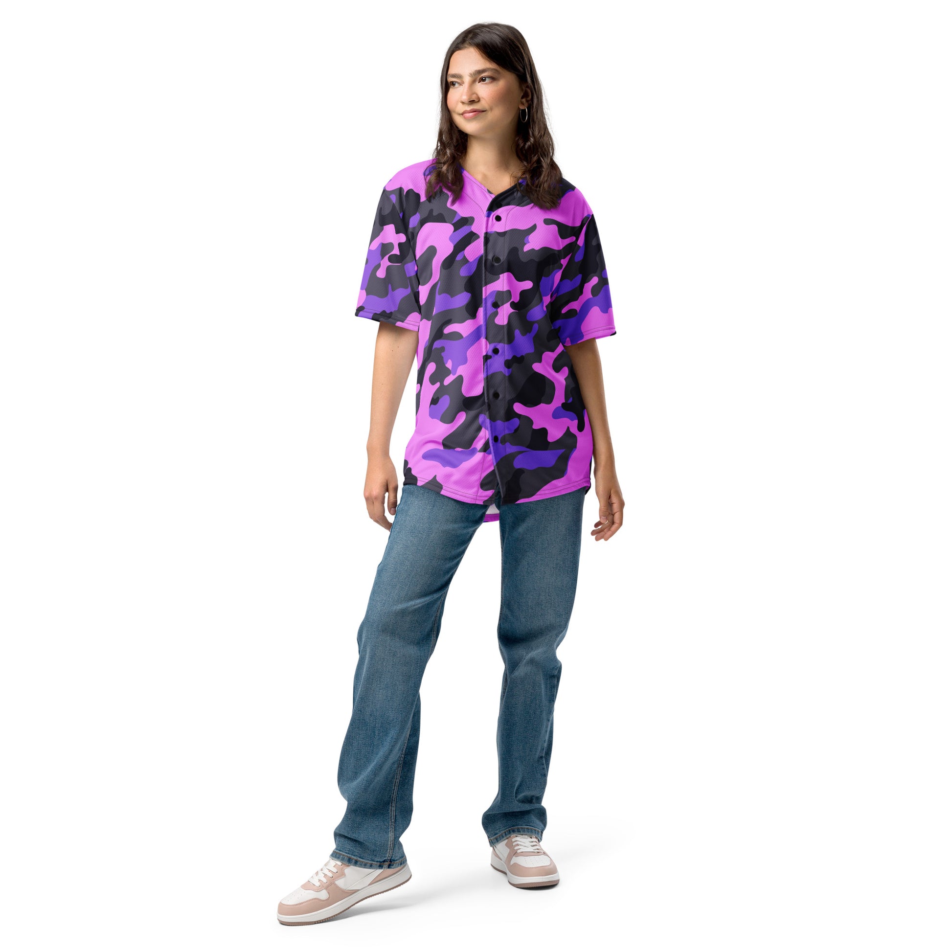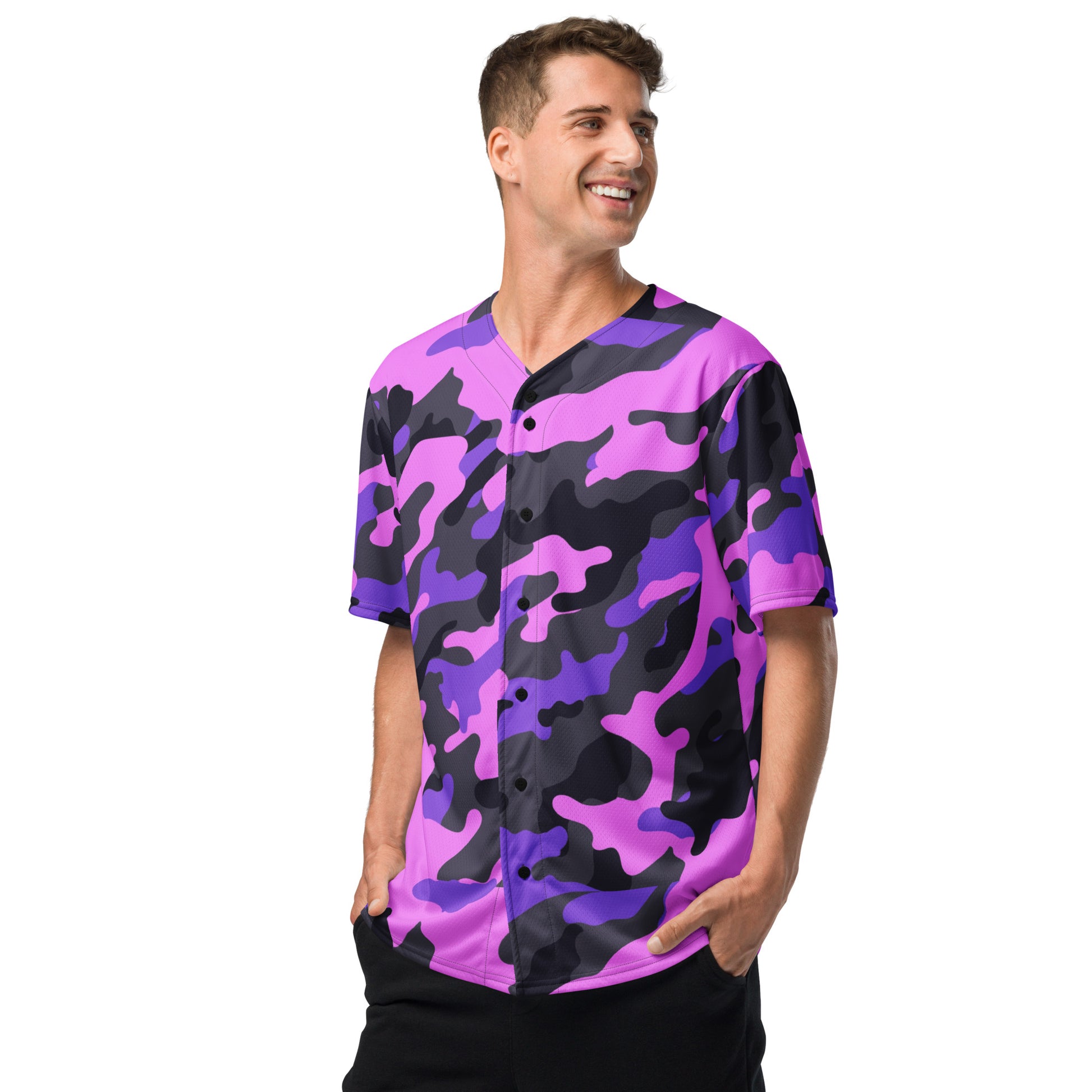 This camo baseball jersey features a unique and stylish pink, black, and indigo camouflage pattern. Made for comfort and performance, this jersey is perfect for standing out on the field. Step up your game with this eye-catching and versatile piece.