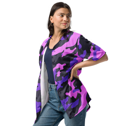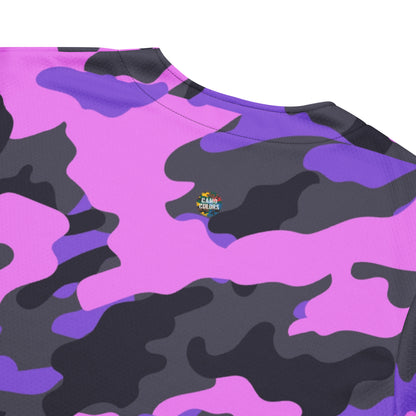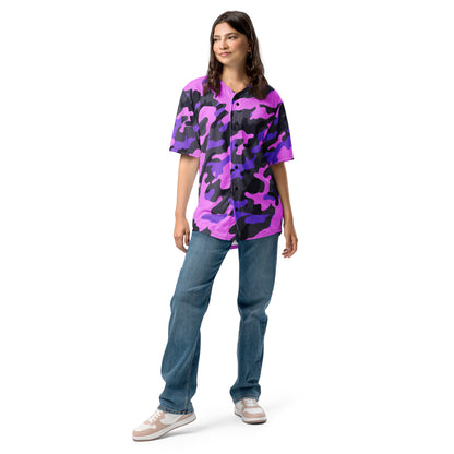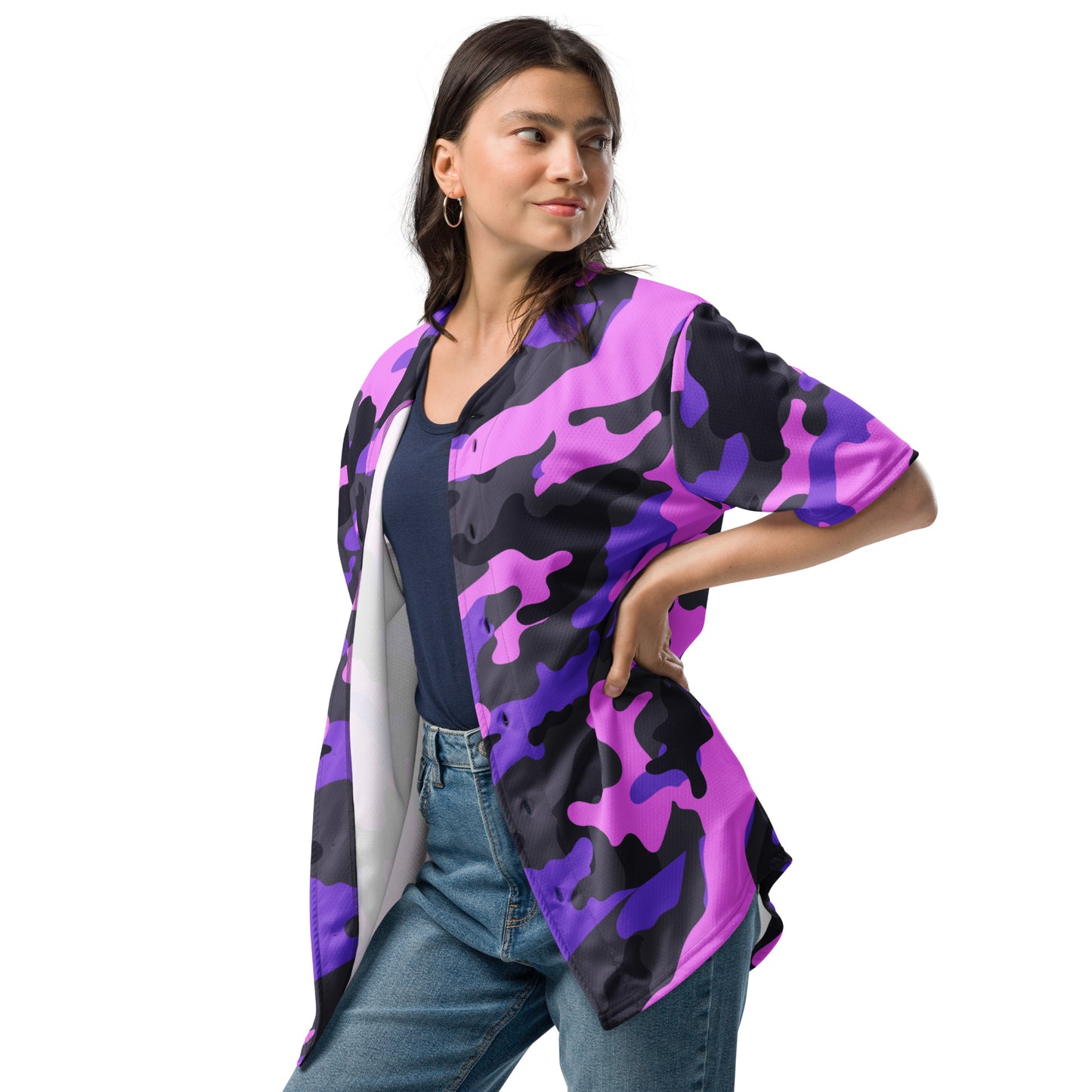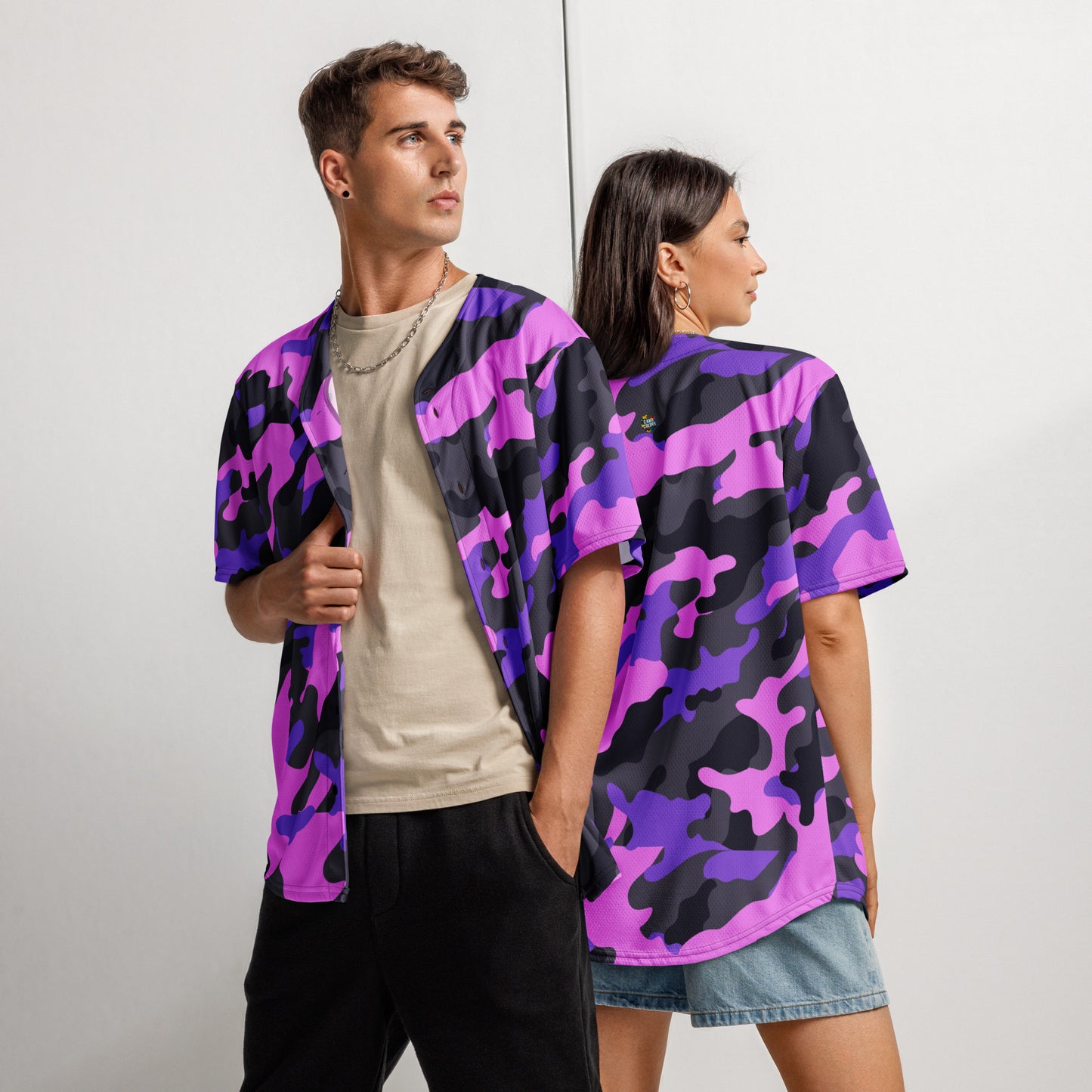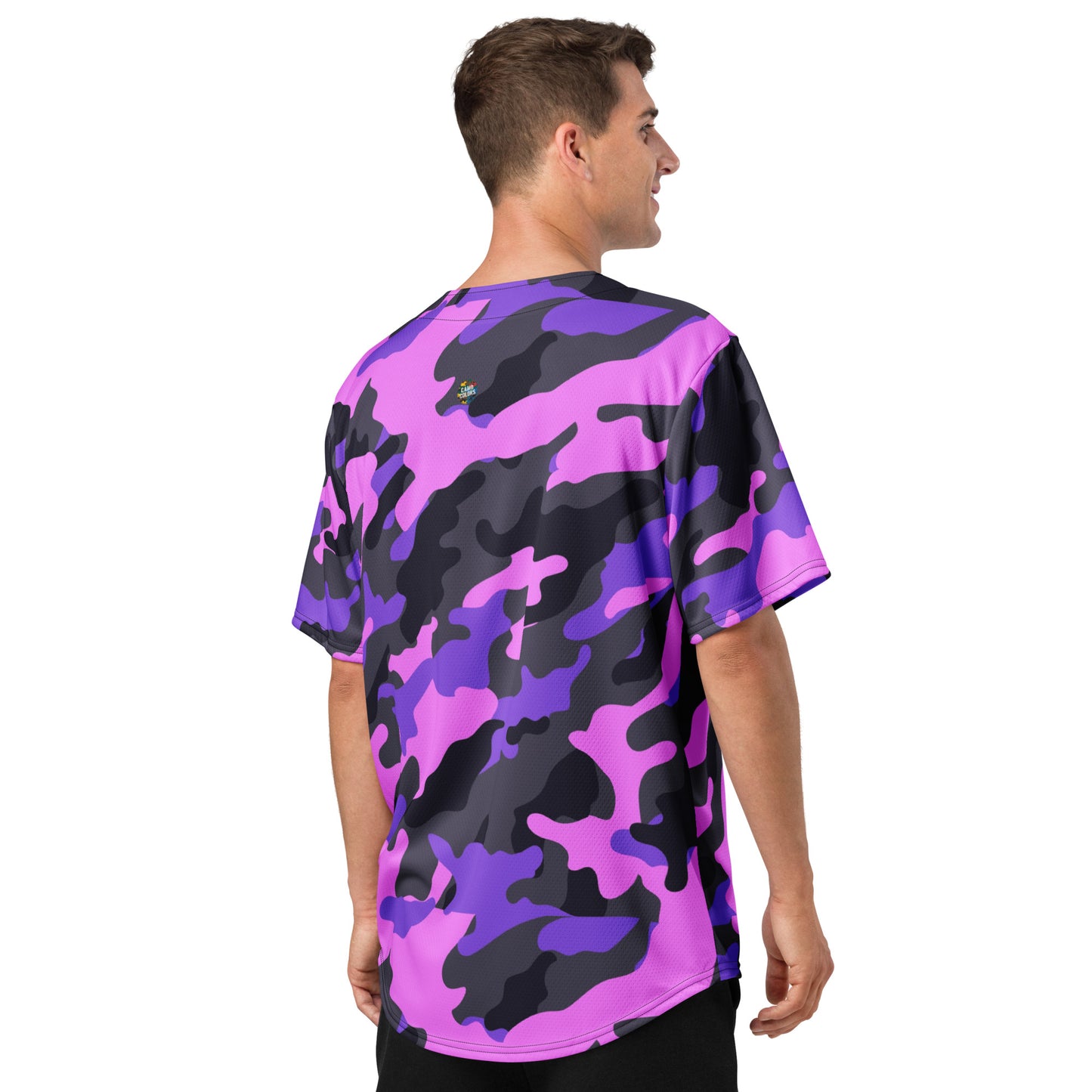 This camo baseball jersey features a unique and stylish pink, black, and indigo camouflage pattern. Made for comfort and performance, this jersey is perfect for standing out on the field. Step up your game with this eye-catching and versatile piece.