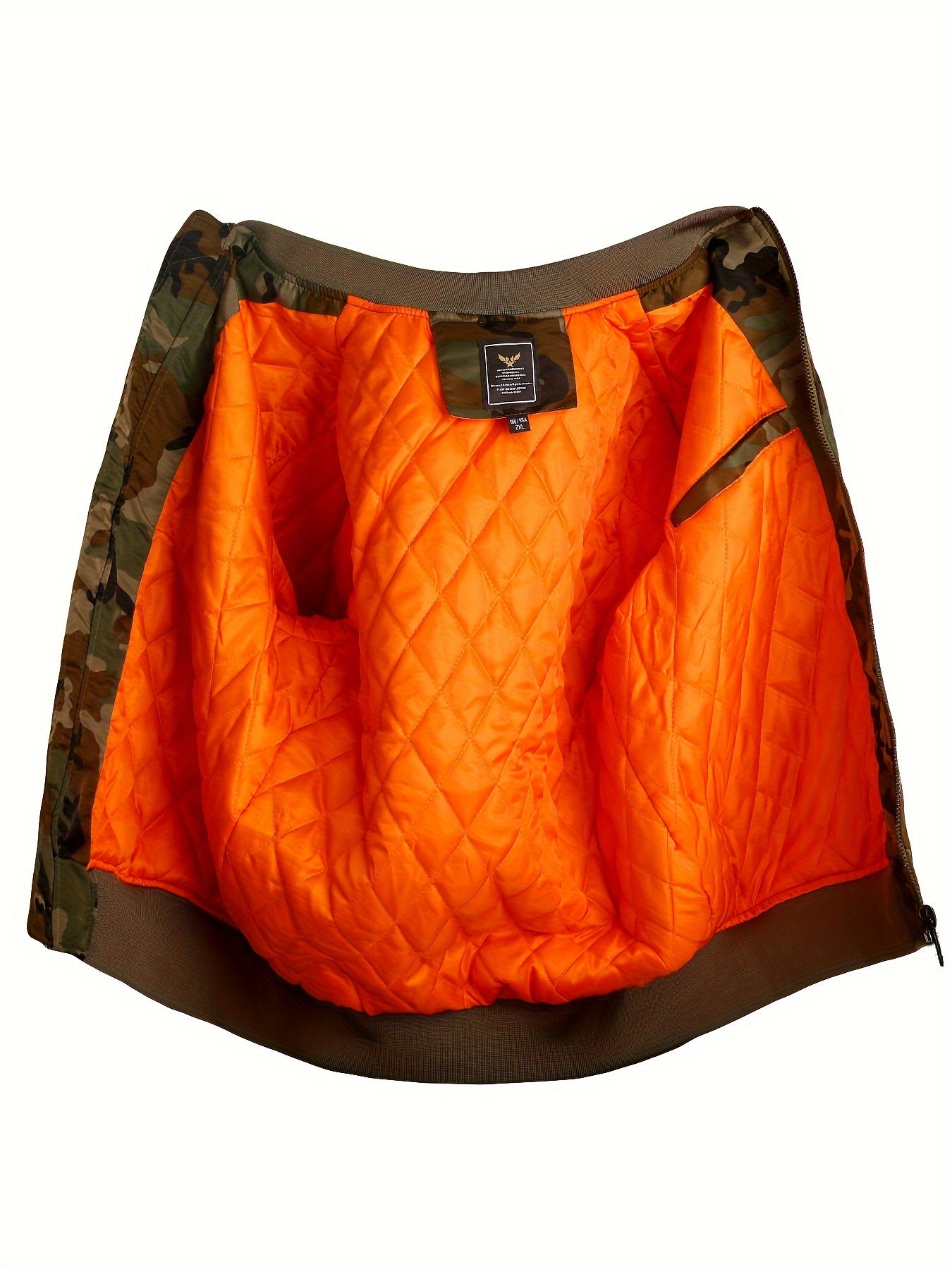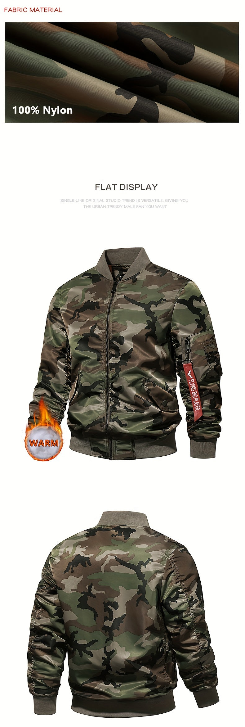 Expertly crafted from high-quality polyamide fabric, this Camo Bomber Jacket is a must-have for any fashion-forward individual. The unique baseball collar and pockets add a touch of style, while the non-stretch woven fabric ensures a comfortable and regular fit. Easy to care for, simply machine wash or bring to a professional dry cleaner for maximum longevity. Perfect for the Fall/Winter season, this jacket is lined with soft polyester fiber and features a secure zipper closure. Upgrade your wardrobe with this stylish and versatile piece.