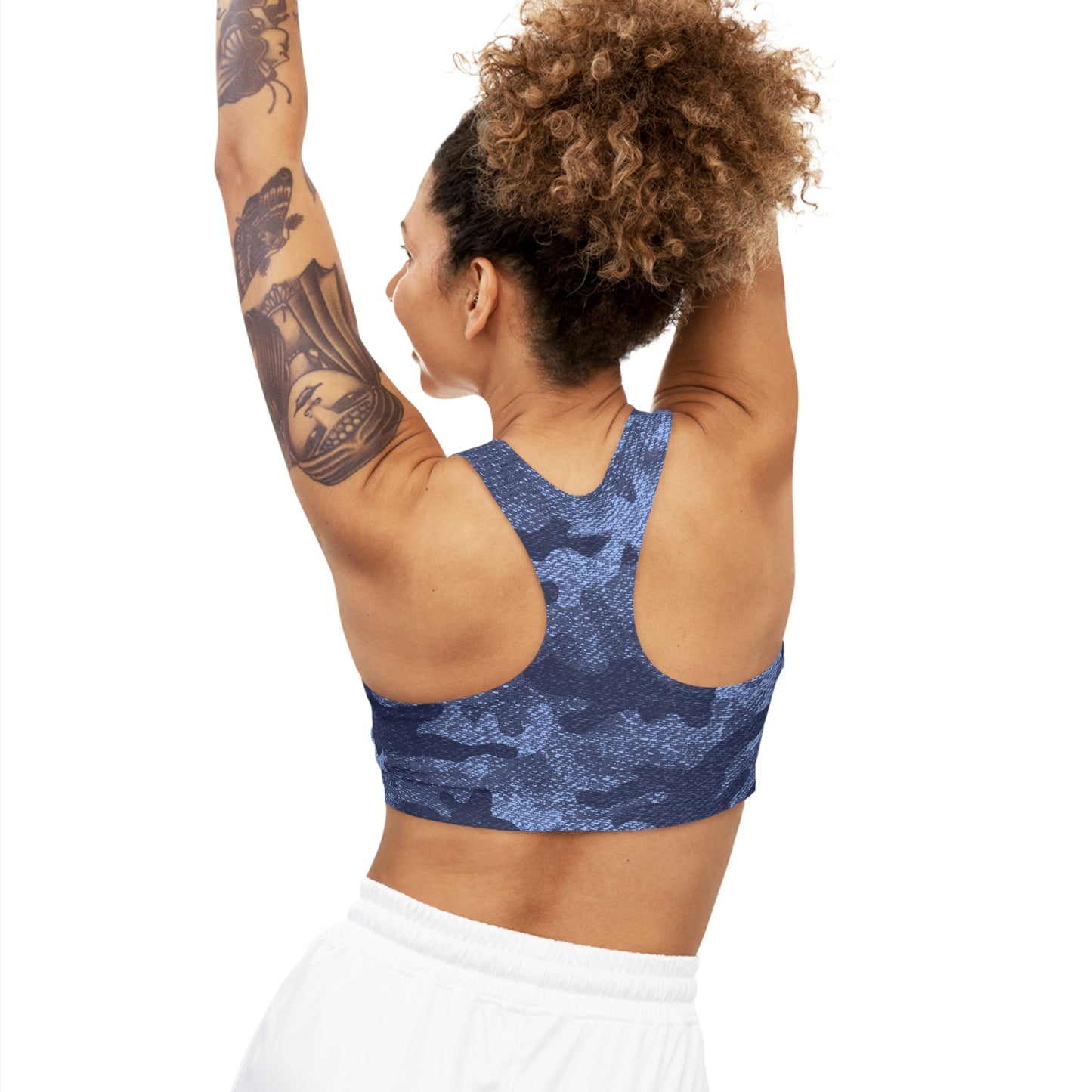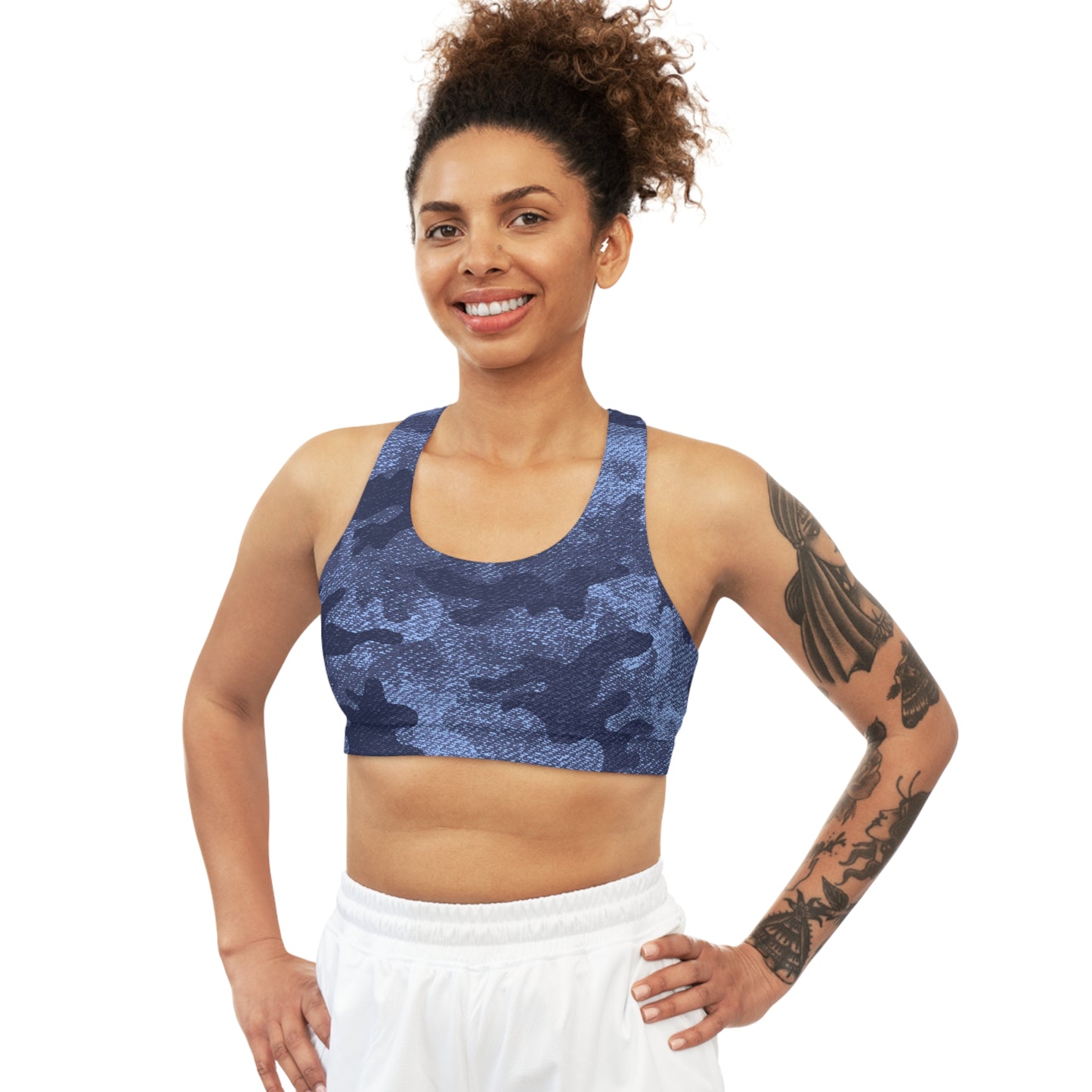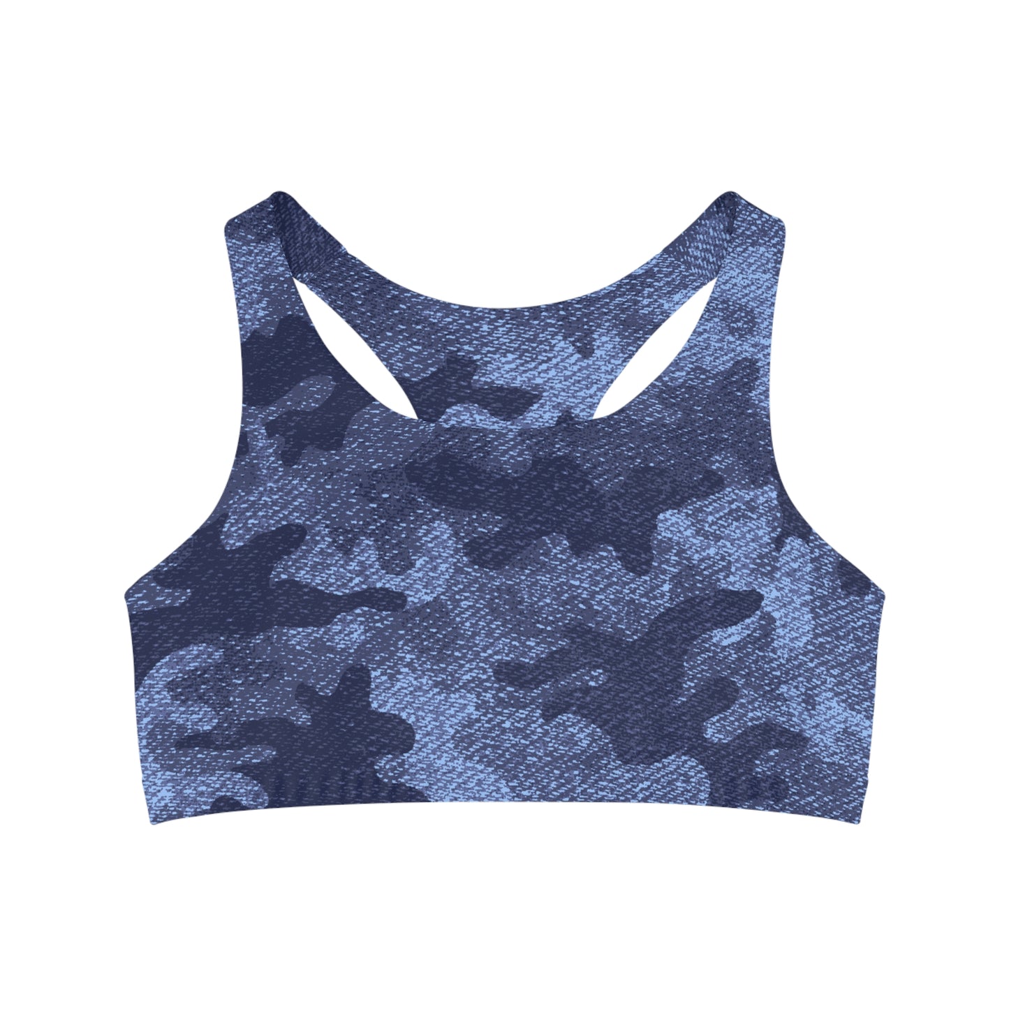 Stay comfortable and stylish with our Camo Bra in Denim Blue Sports Camouflage. The unique design offers both functionality and fashion, while providing maximum support during physical activity. Made with high-quality materials for ultimate comfort and durability.