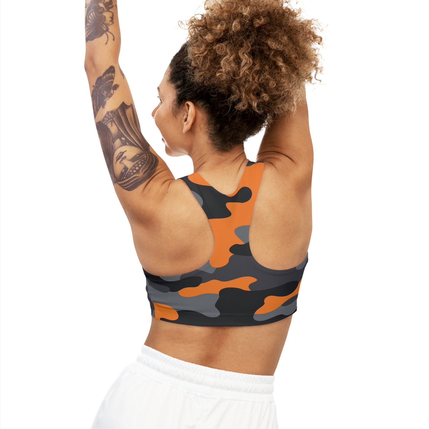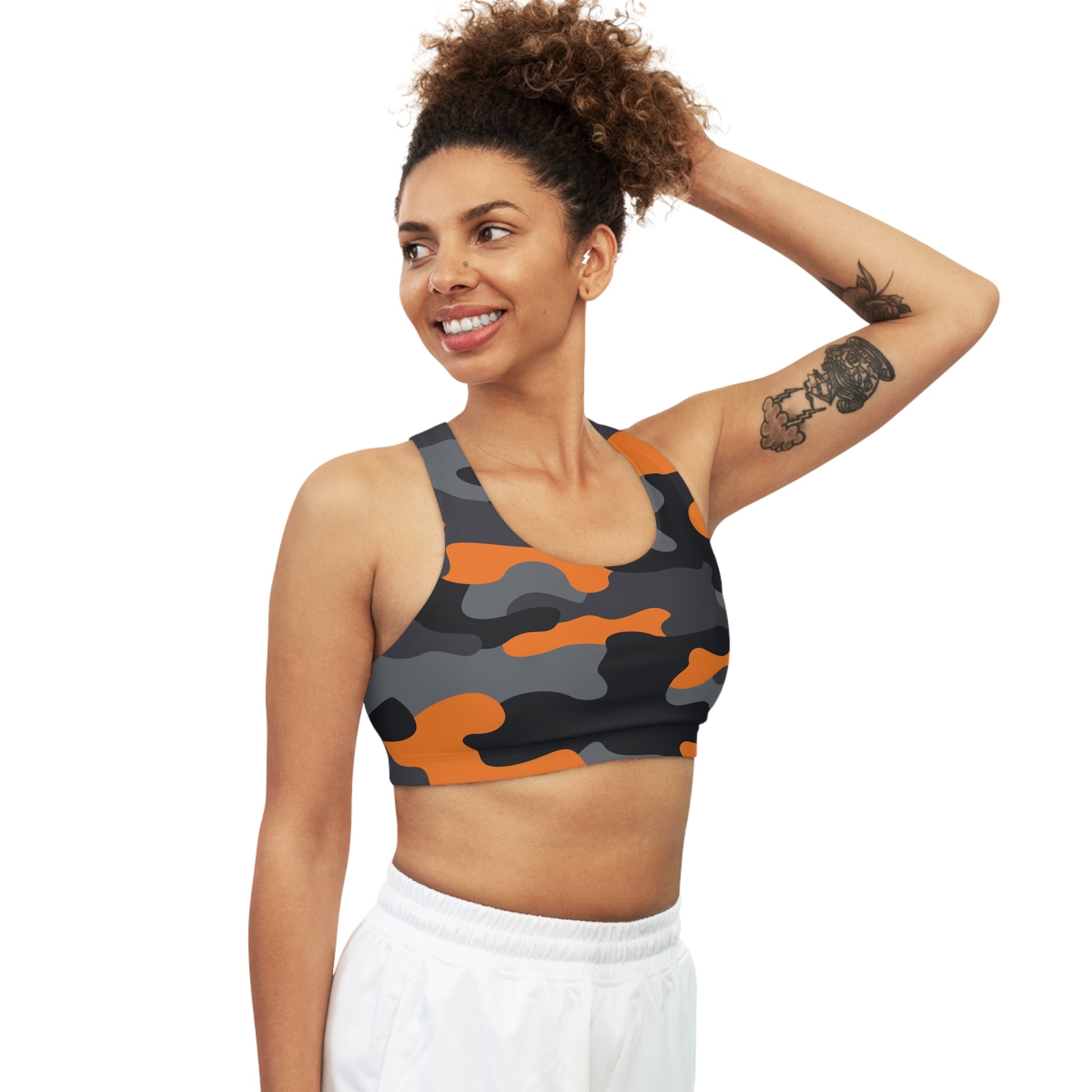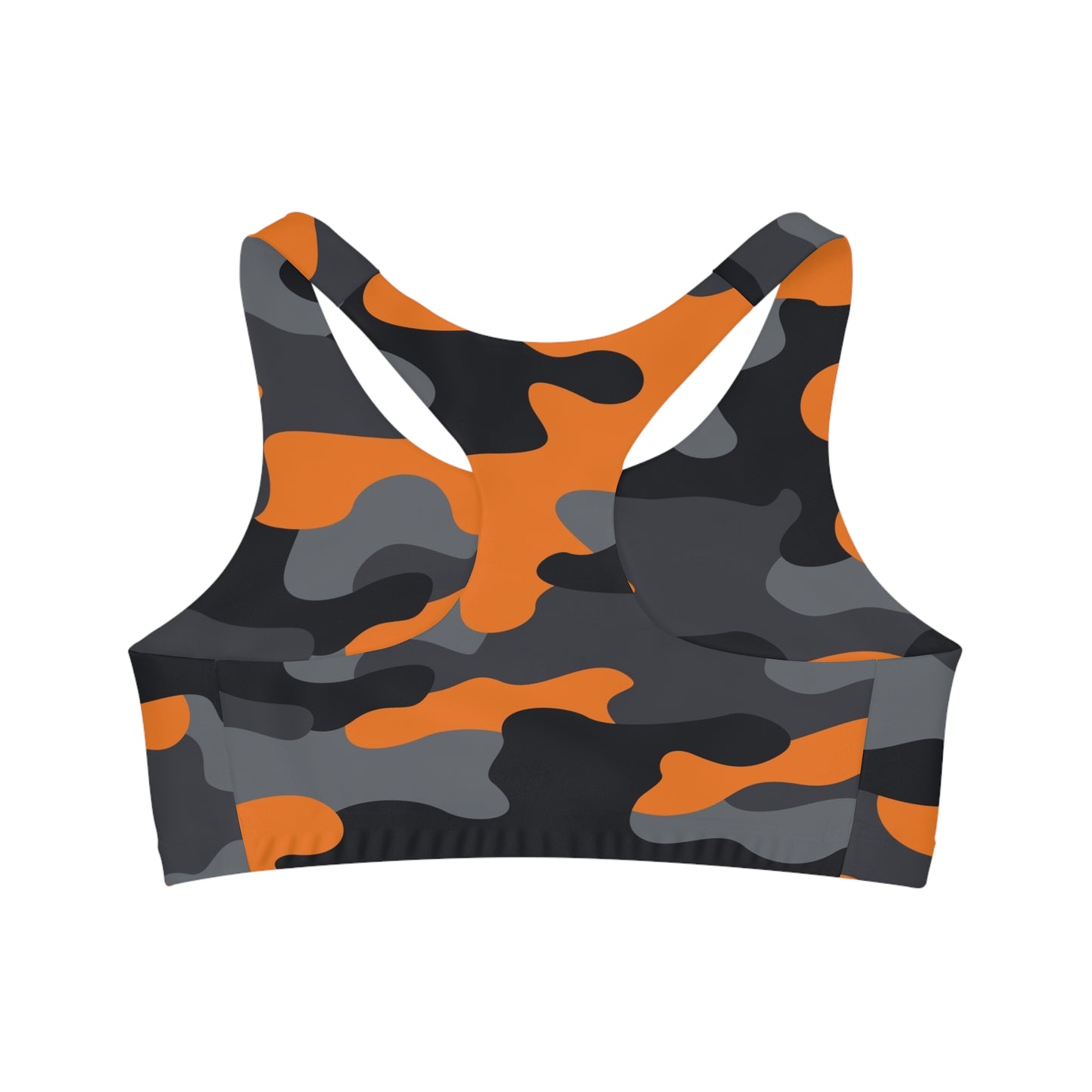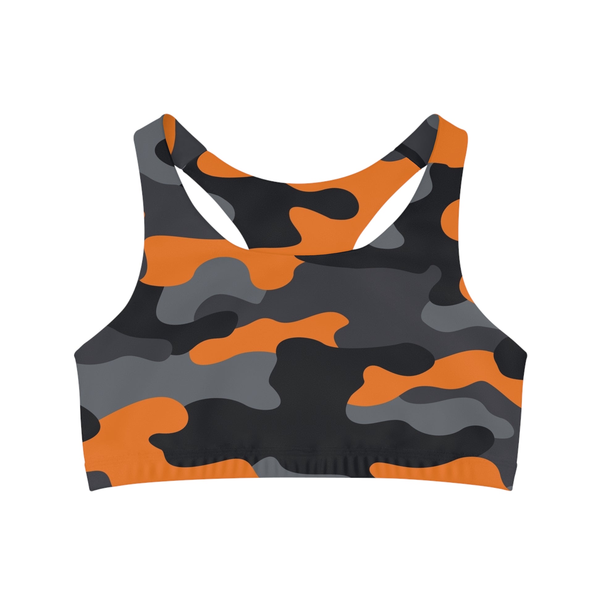 This Camo Bra combines functional design with a bold color scheme of orange, black, and gray camouflage. Its unique pattern provides support and comfort during sports activities, making it a great choice for active individuals. Expertly crafted to enhance performance and style.