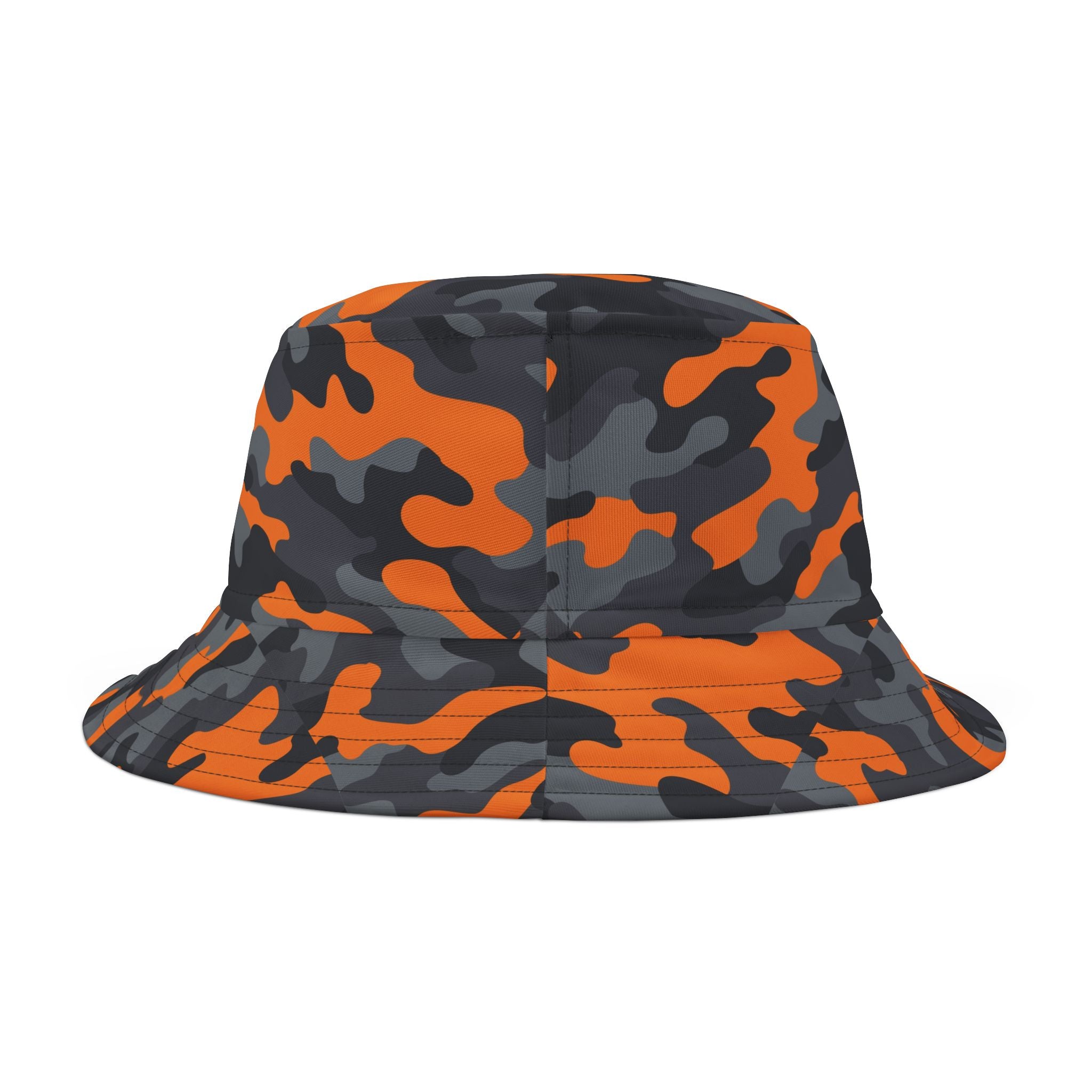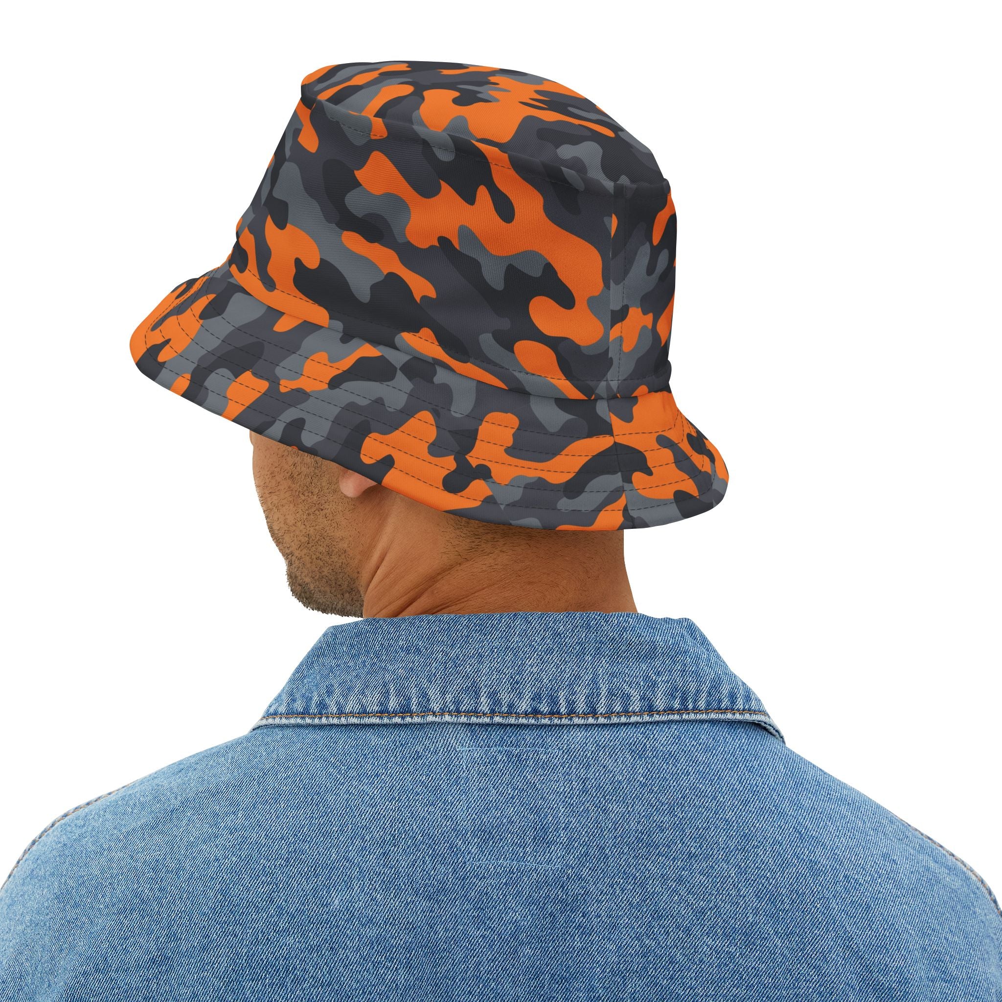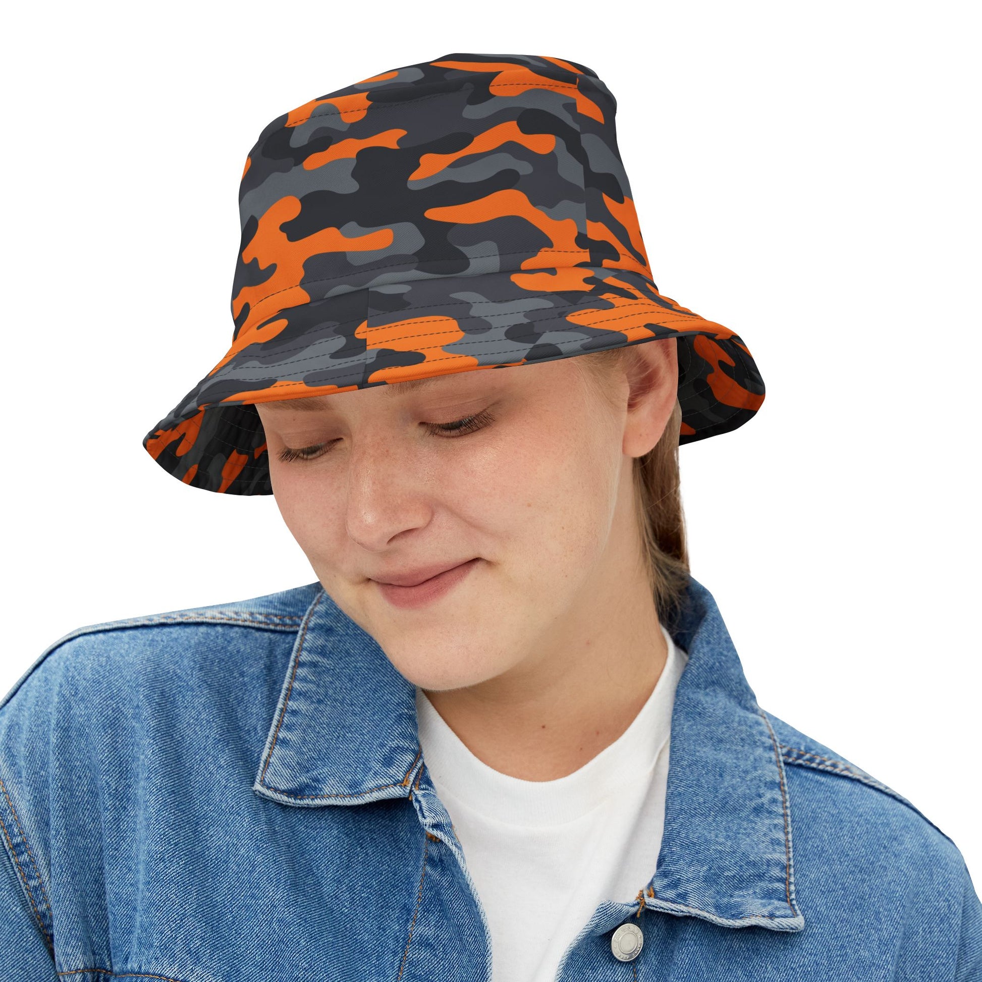 This Camo Bucket Hat in Orange, Black, and Gray Camouflage is the perfect accessory for any outdoor adventure. Made with high-quality materials, it boasts a stylish design while providing functionality and protection from the sun. Whether you're on a hike or spending a day at the beach, this versatile hat has got you covered.