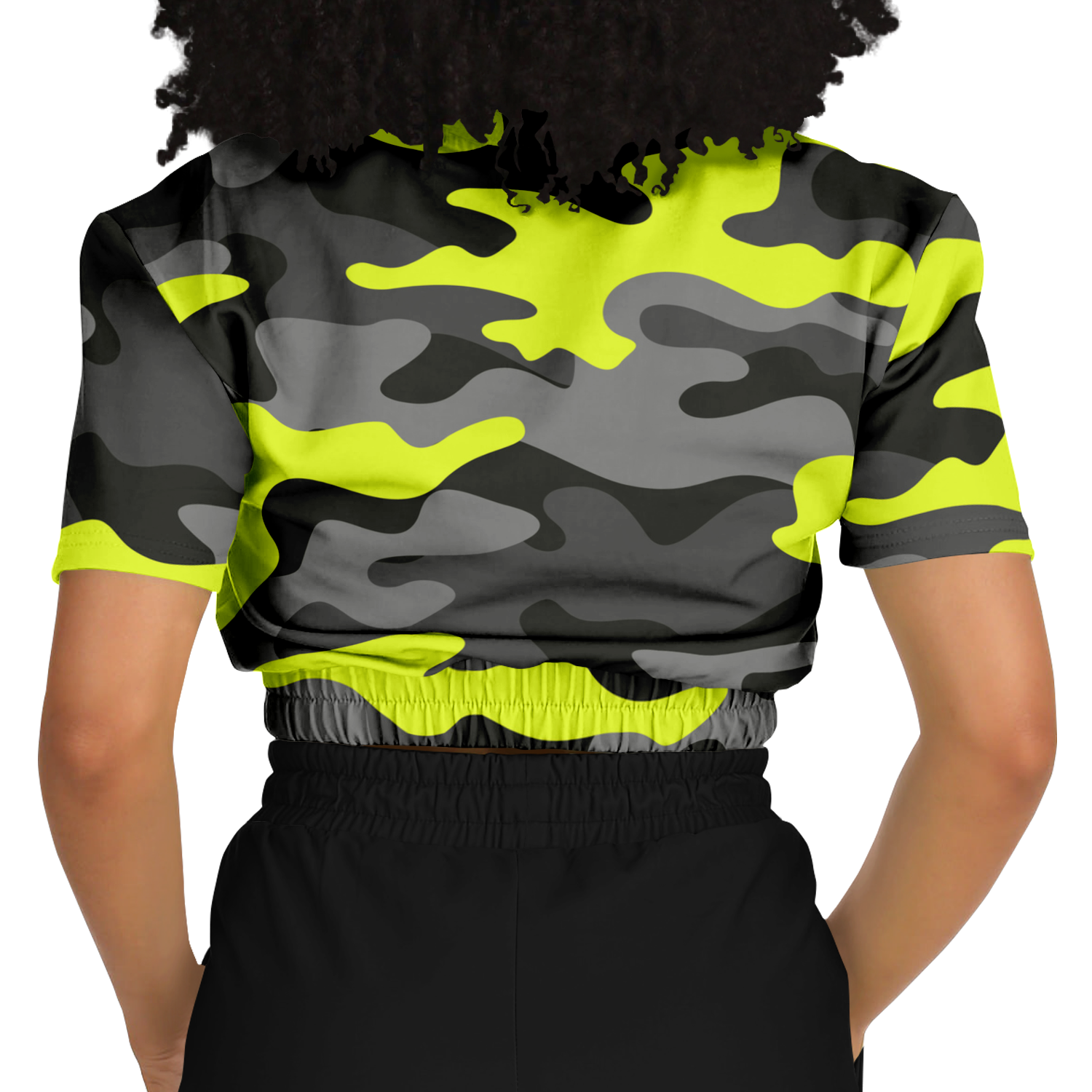 Introducing the Camo Crop Top Sweatshirt with short sleeves in Black, Gray, and Yellow Camouflage. Perfect for outdoor enthusiasts, this sweatshirt offers a unique blend of style and comfort. Made with high-quality materials, it provides both warmth and durability. Enhance your wardrobe with this trendy and functional piece.
