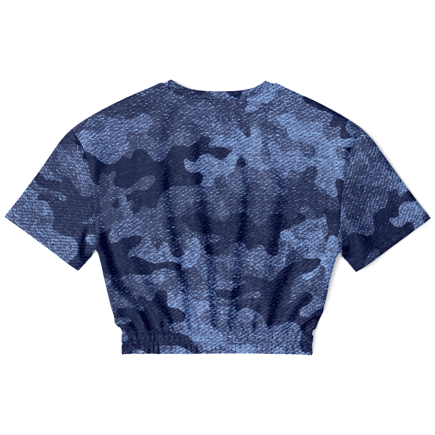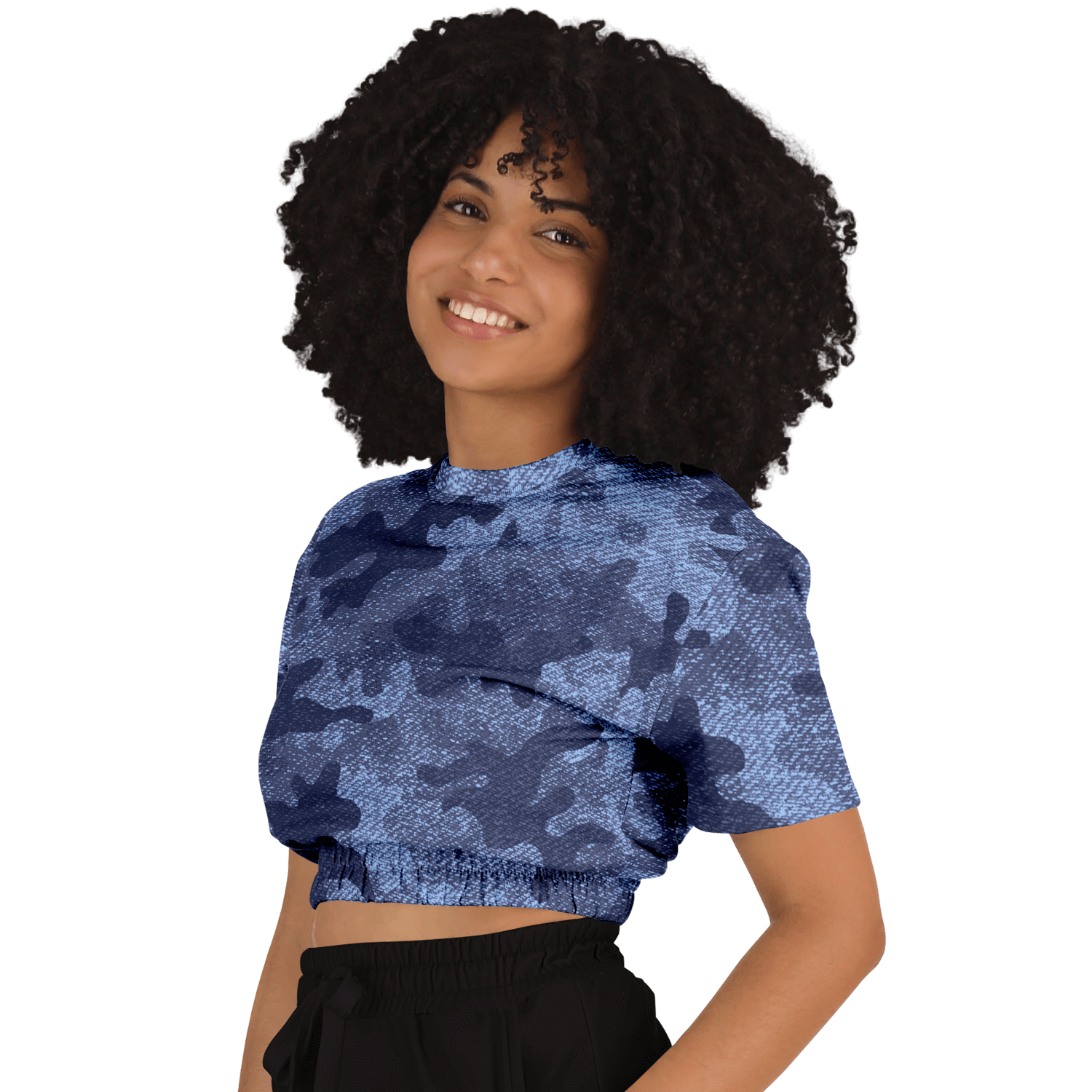 Stay trendy and comfortable with this Camo Crop Top Sweatshirt in Blue Denim Camouflage. Made with a stylish camo design, this sweatshirt features a cropped cut for a fashionable look. Perfect for those who want to stay on-trend with a touch of uniqueness.