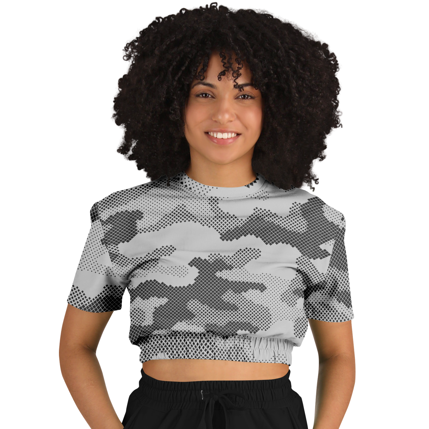 This Camo Crop Top Sweatshirt in gray digital camouflage is a stylish and versatile addition to any wardrobe. Featuring a unique camouflage pattern and a cropped silhouette, this sweatshirt offers both comfort and fashion.