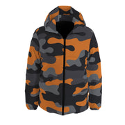 Camo Down Jacket | Orange, Black and Gray Hooded Puffer