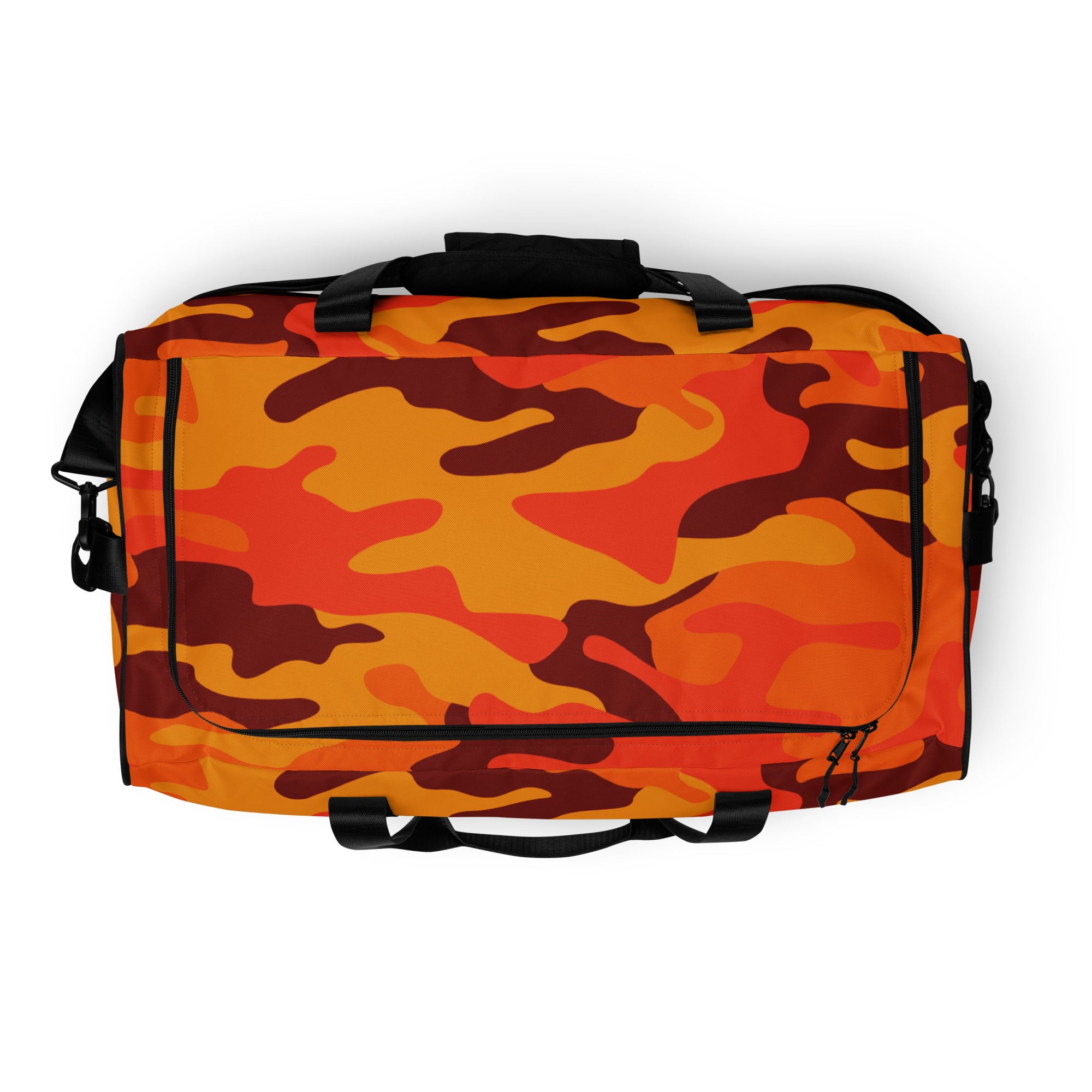 This Camo Duffle Bag features a striking Orange & Red Camouflage design. Made from durable materials, it's perfect for the outdoors and can withstand tough conditions. With a spacious interior and multiple pockets, it's perfect for carrying all your gear and essentials. Stay organized and stylish with our Camo Duffle Bag.