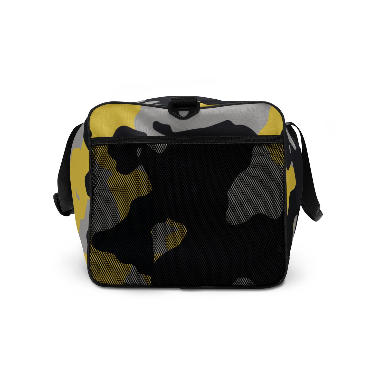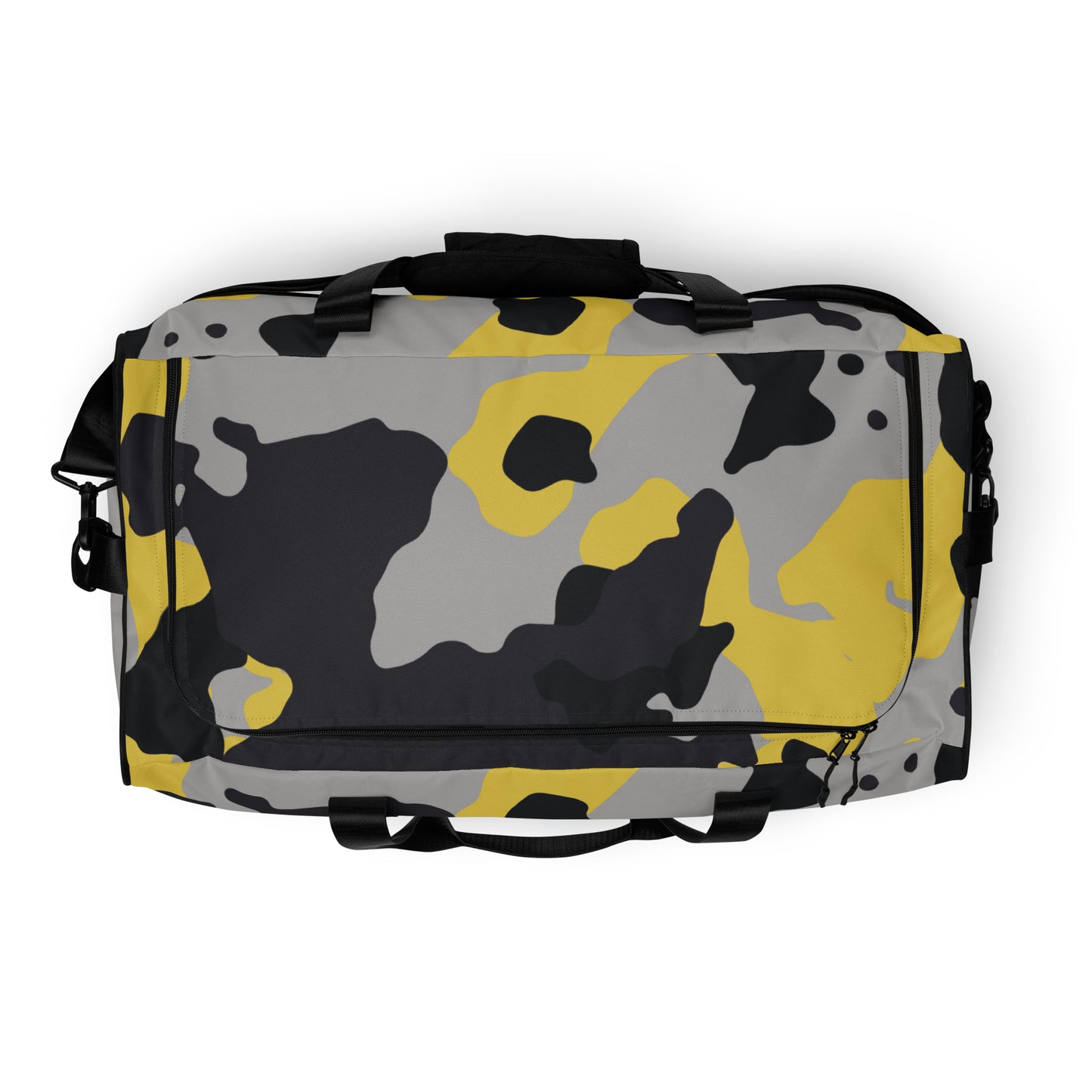 This Camo Duffle Bag features a unique and eye-catching Yellow, Black, and Silver Camouflage design. Made with durable materials, it is perfect for outdoor adventures or as a stylish gym bag. Stay organized with multiple compartments and experience functionality and fashion in one.