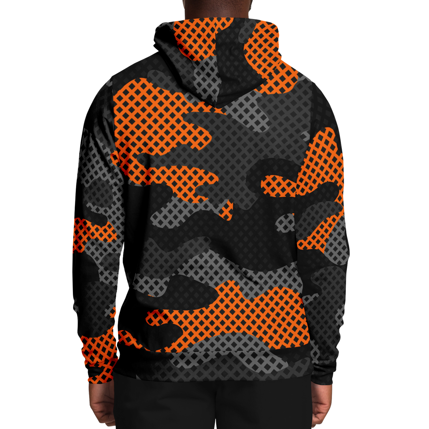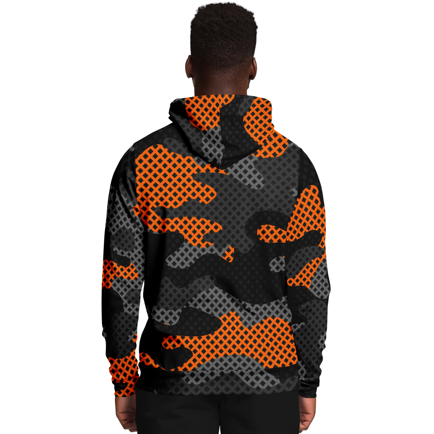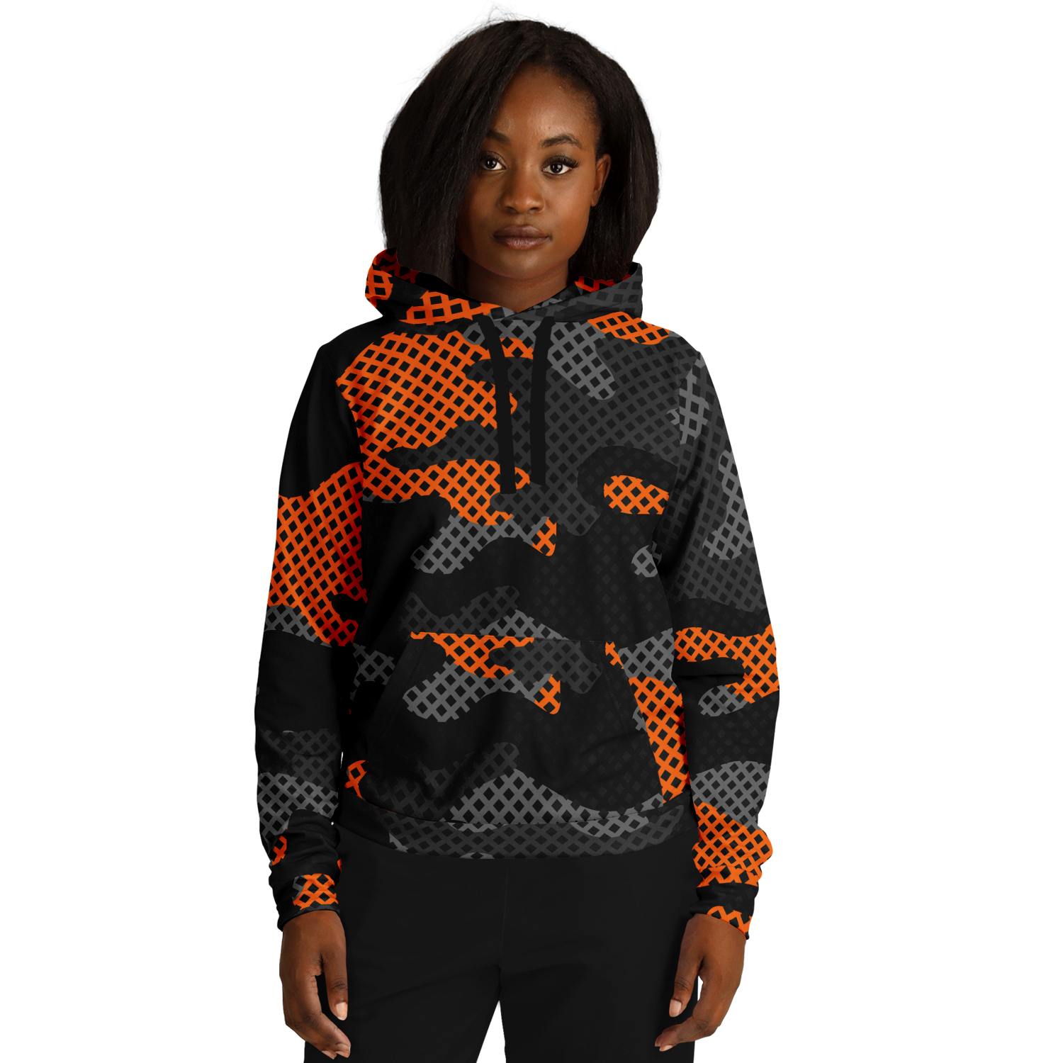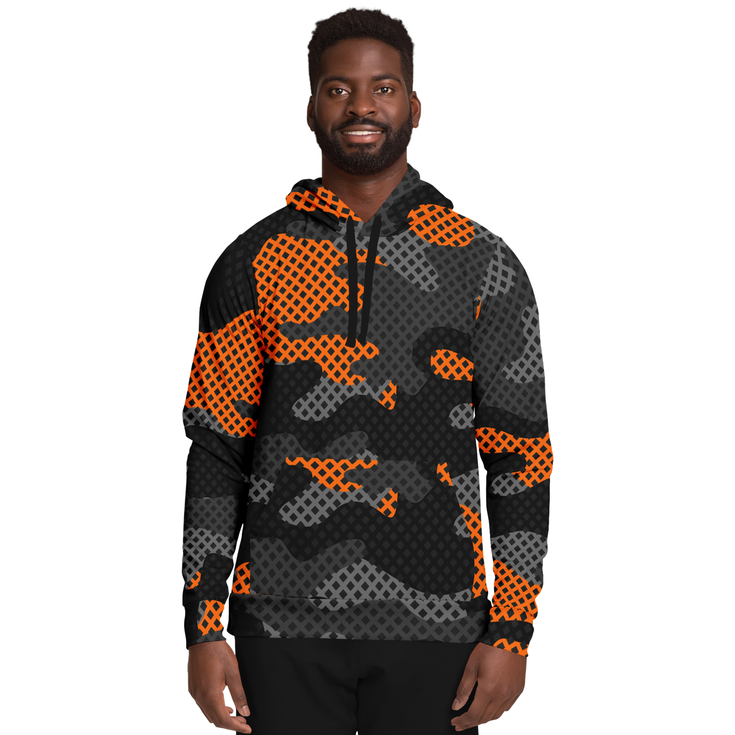 Introducing the Cyber Camo Hoodie, designed with a Black & Orange Pixel Drop pattern. Made with high-quality fabric, this hoodie is both stylish and functional. The unique camo design adds a touch of edginess to any outfit. Stay warm and stand out from the crowd with this must-have hoodie.