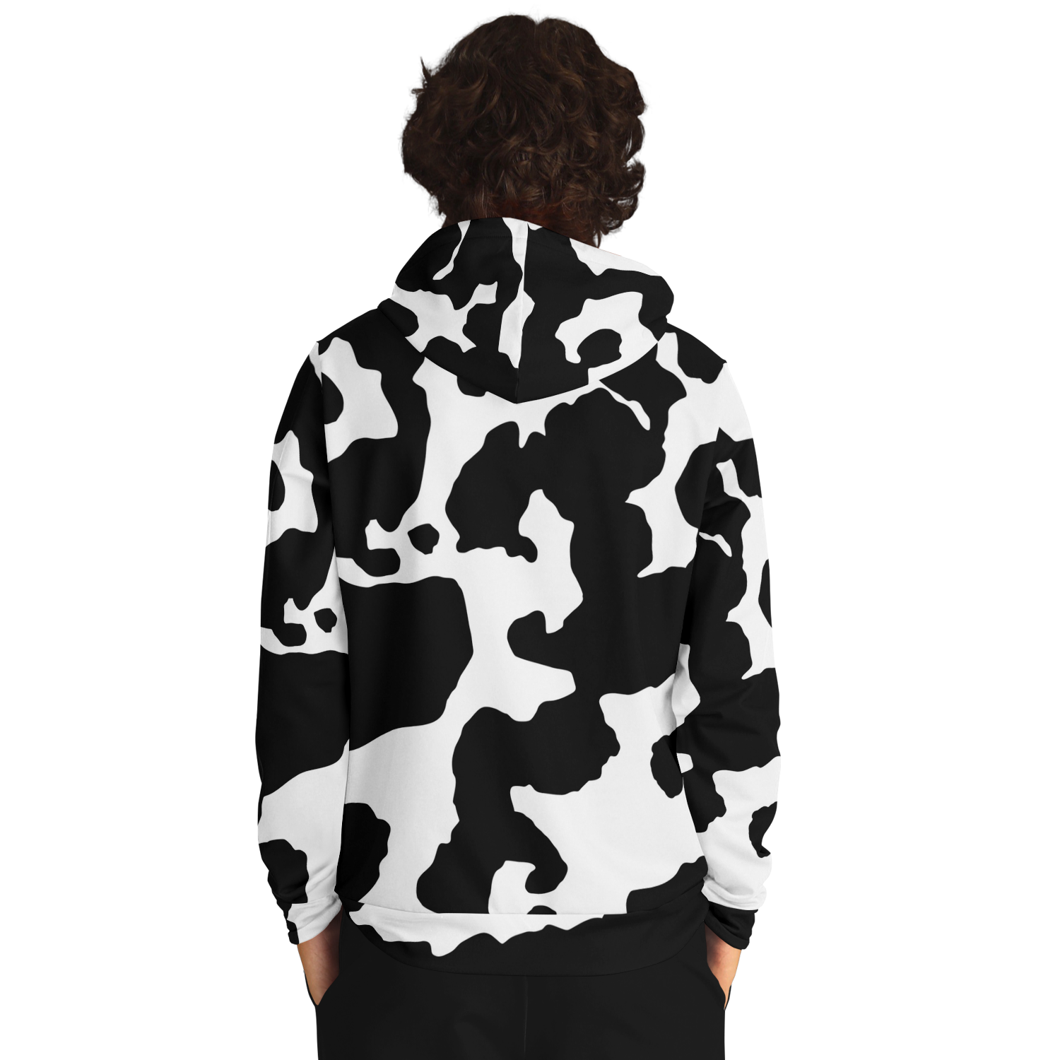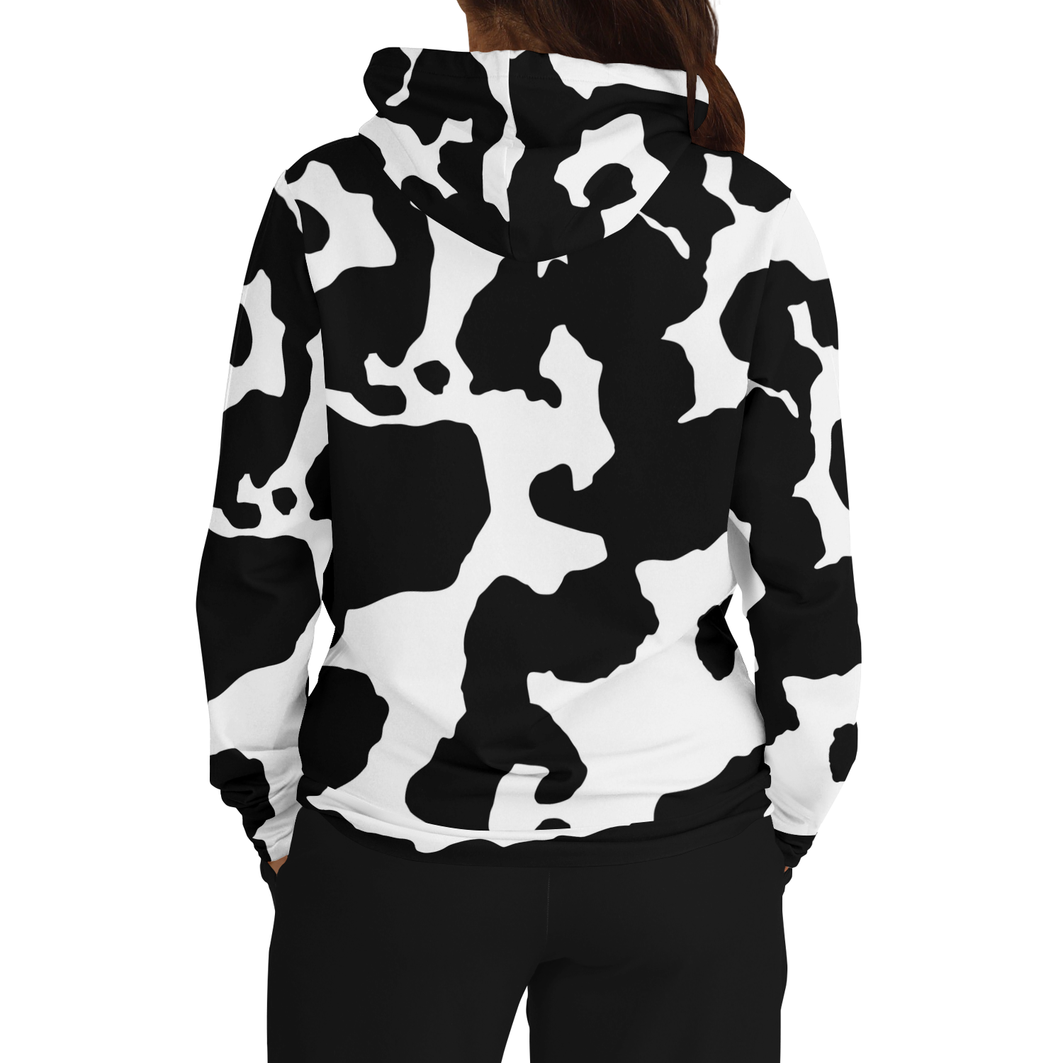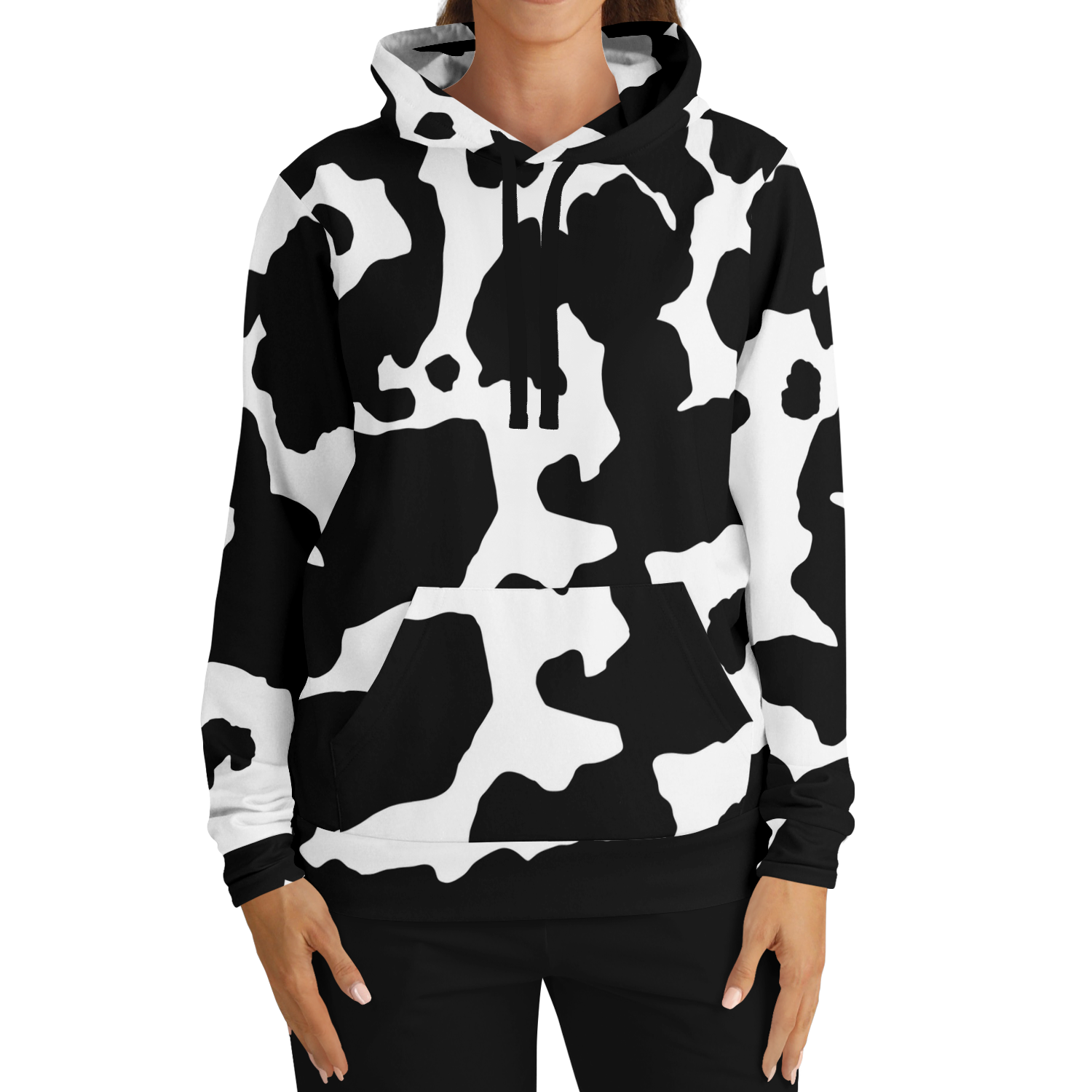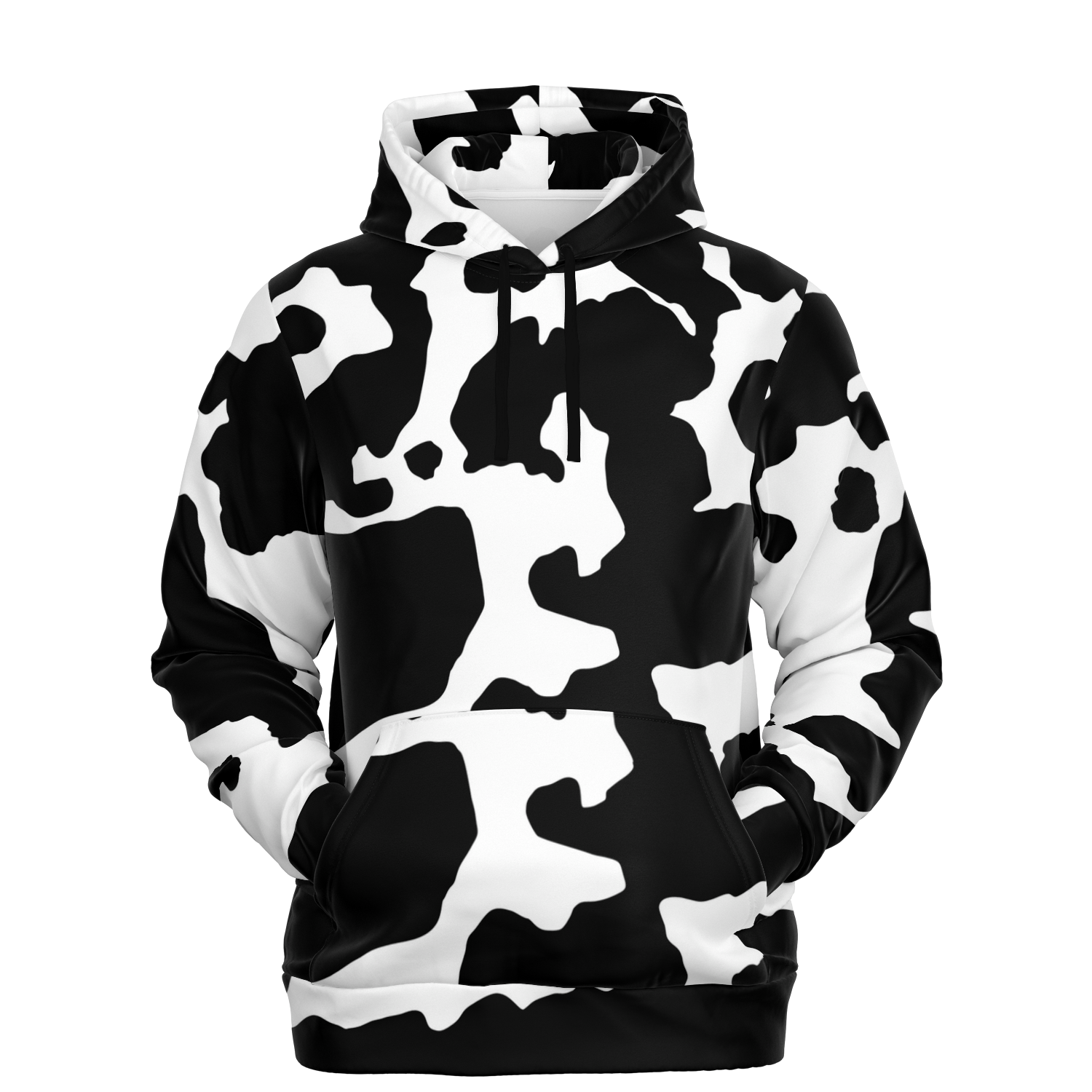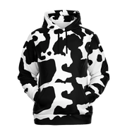 The Camo Hoodie in Black & White Cow Camouflage offers sleek and stylish protection from the elements. Made from quality materials, this hoodie boasts a classic camouflage print in a black and white colorway. Perfect for outdoor enthusiasts and fashion-forward individuals alike, stay warm and on-trend with this unique hoodie.
