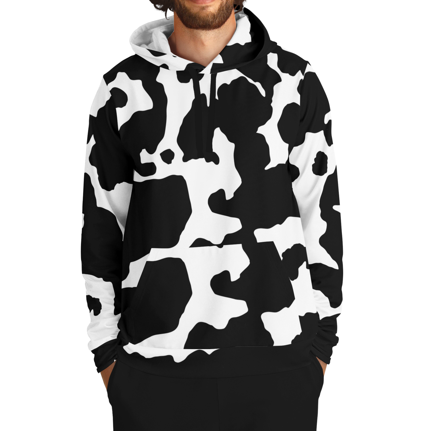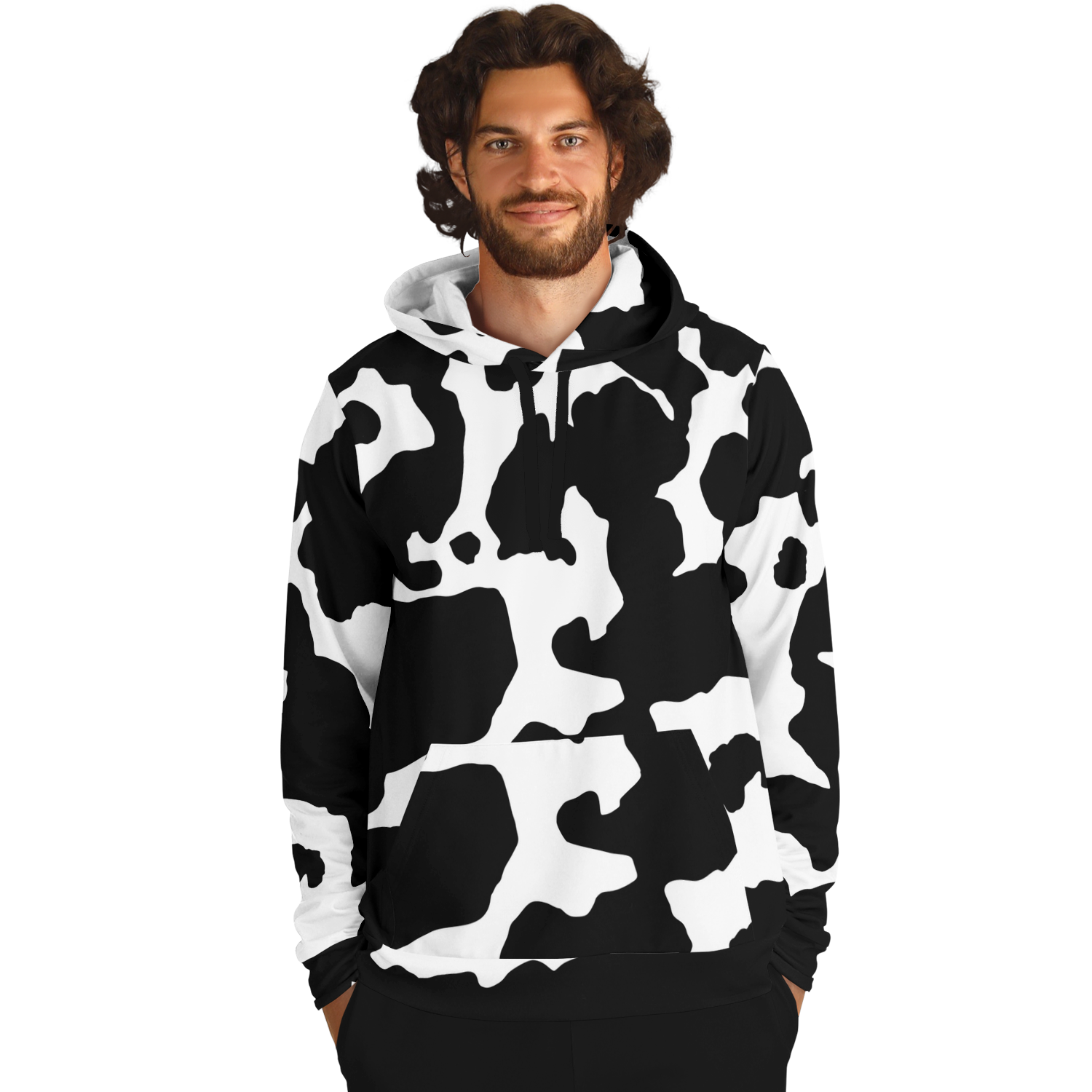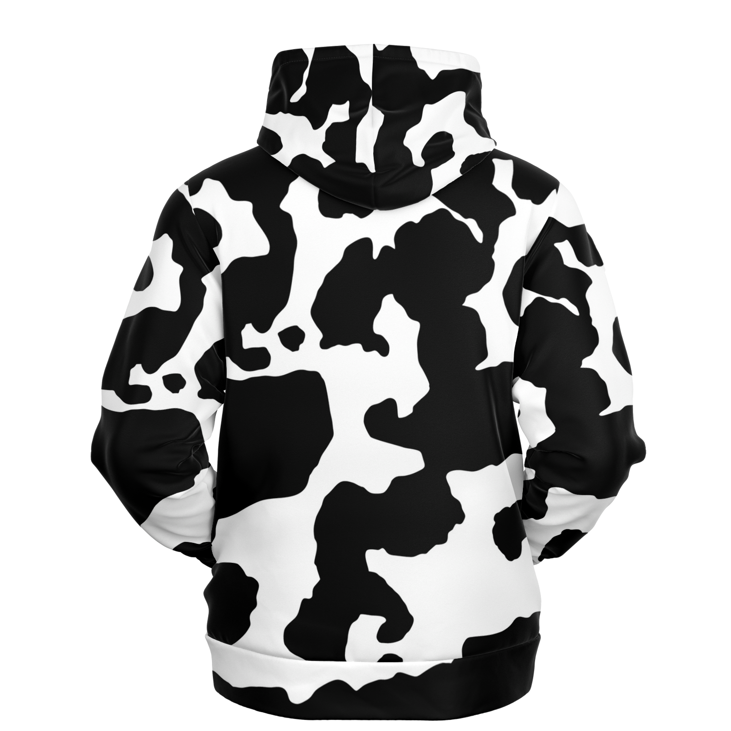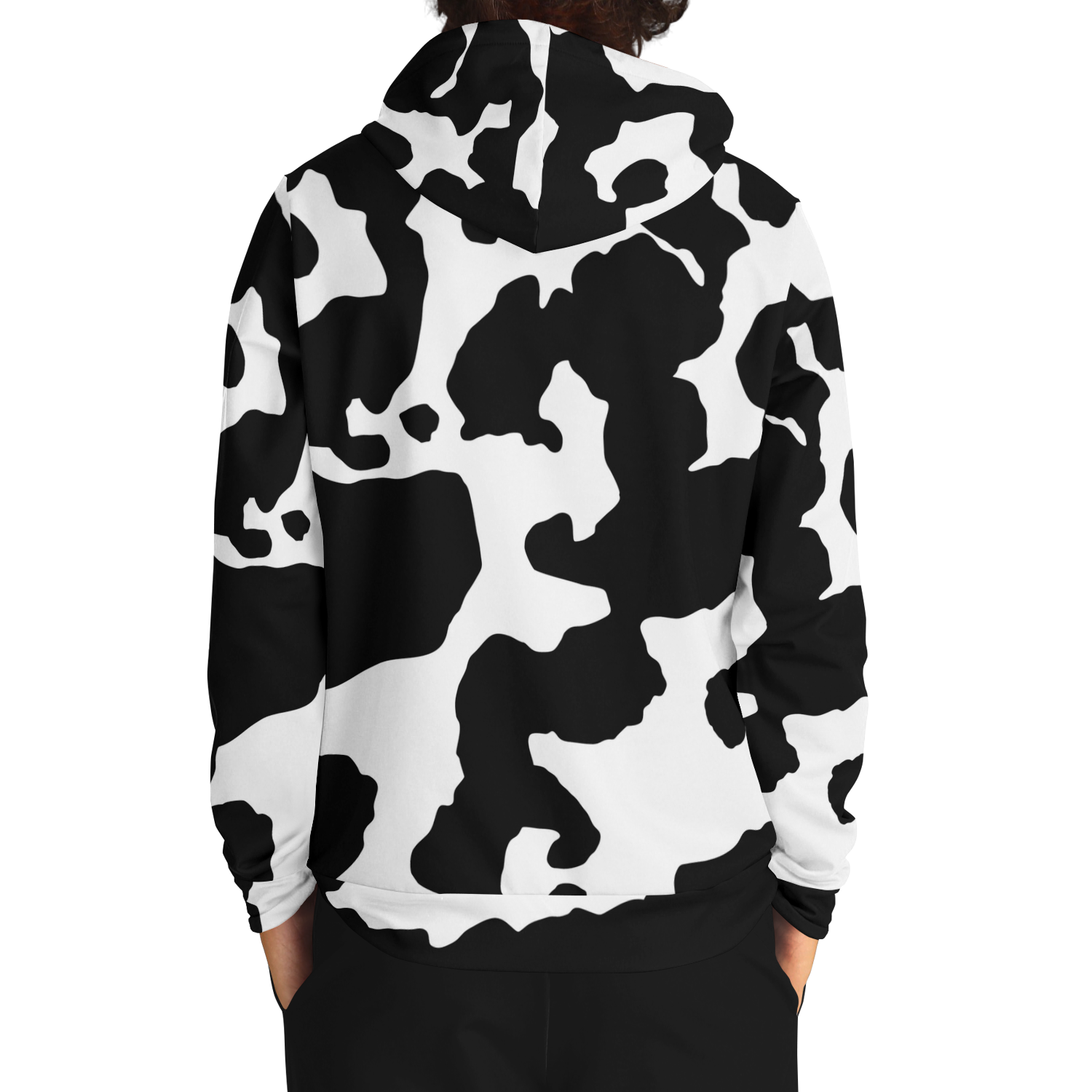 The Camo Hoodie in Black & White Cow Camouflage offers sleek and stylish protection from the elements. Made from quality materials, this hoodie boasts a classic camouflage print in a black and white colorway. Perfect for outdoor enthusiasts and fashion-forward individuals alike, stay warm and on-trend with this unique hoodie.