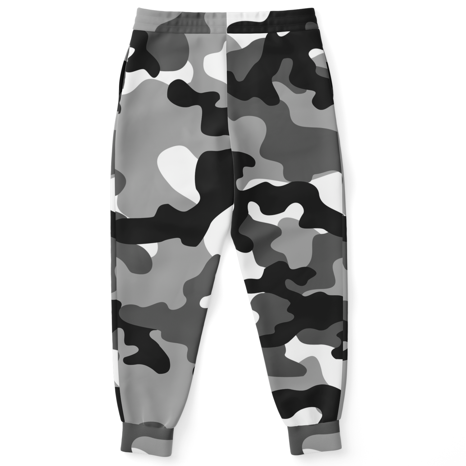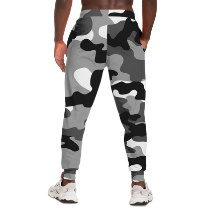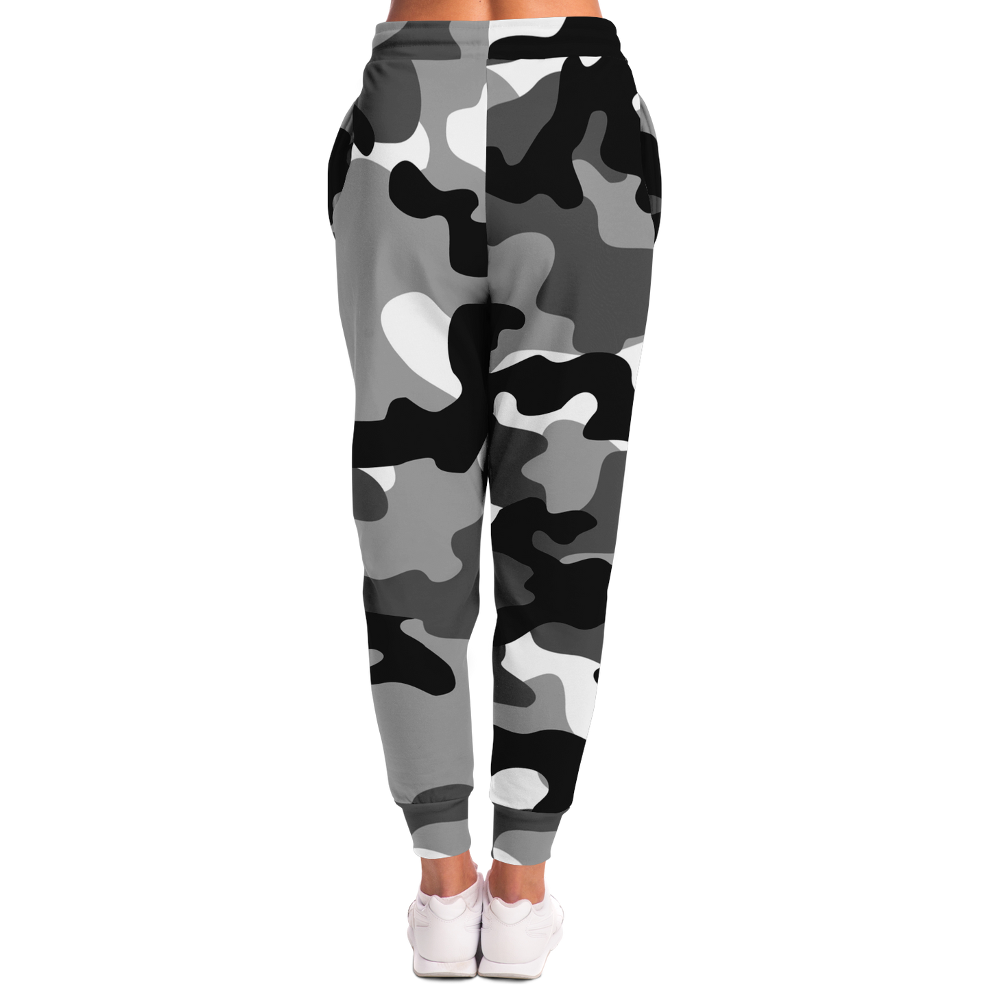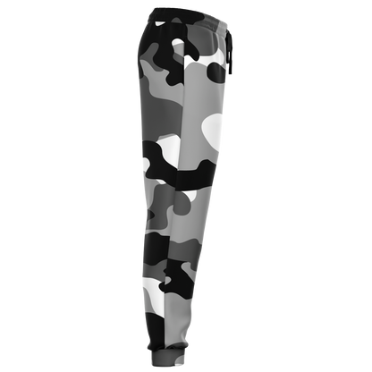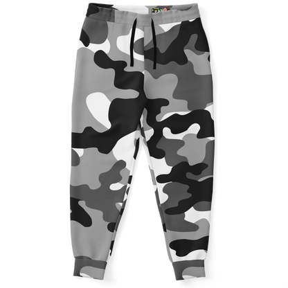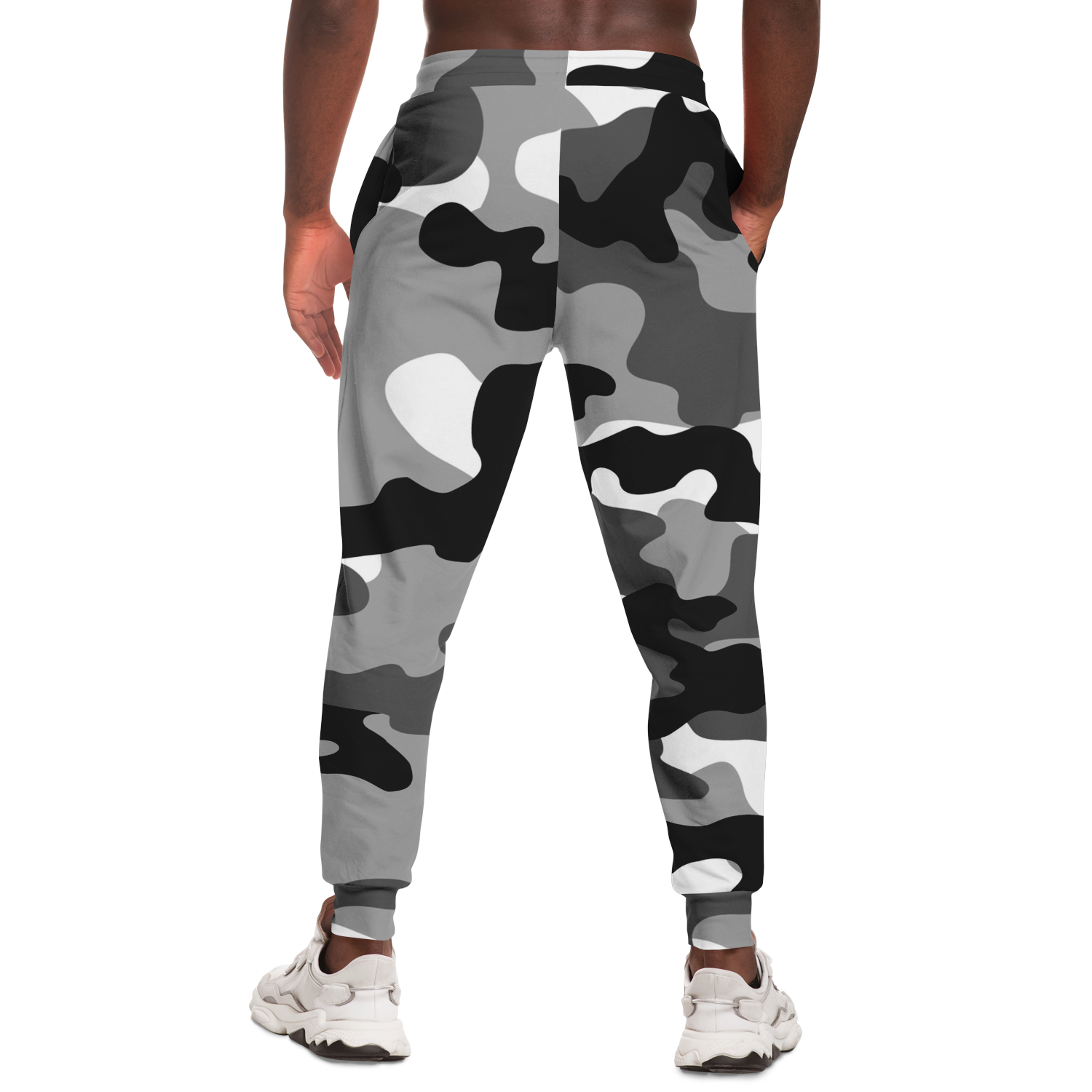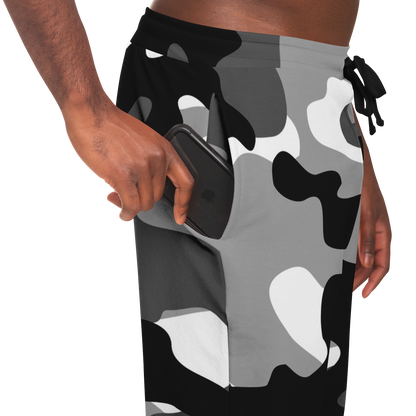 These Camo Joggers in Black, White & Gray are perfect for both men and women. With a versatile and stylish camo print, they can effortlessly be dressed up or down. Plus, the unisex design ensures a comfortable and flattering fit for all. Durable and fashionable, these joggers are a must-have for any wardrobe. Shop now!