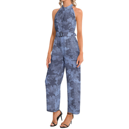 Camo Jumpsuit | Belted Halter Neck | Denim Blue