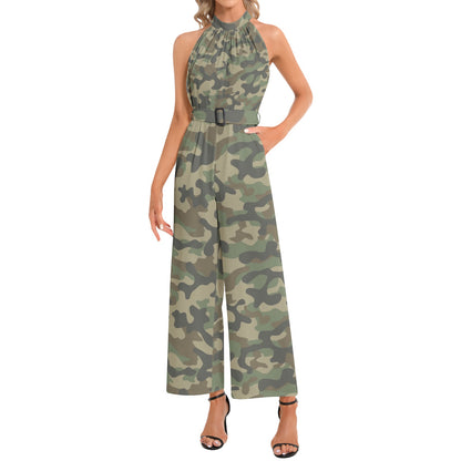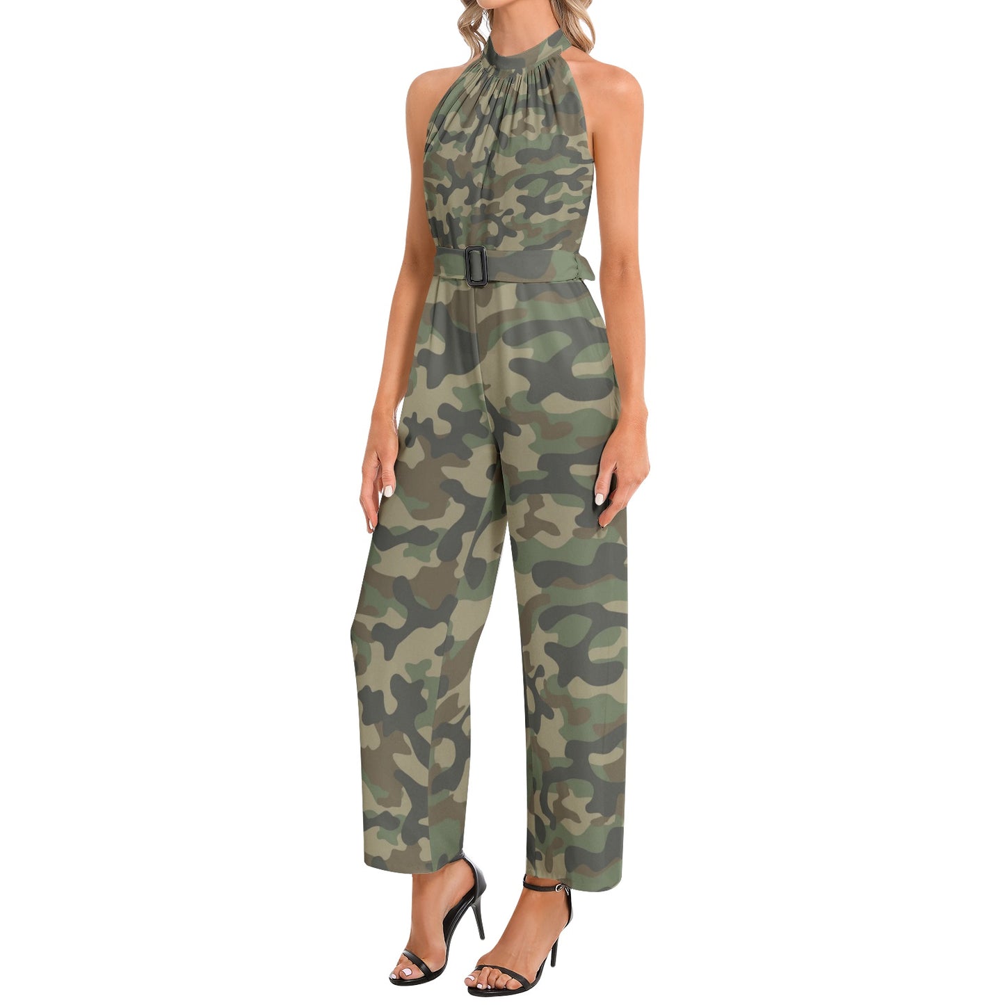 This military-inspired camo jumpsuit features a belted halter neck, providing a flattering and adjustable fit. The versatile design allows for effortless layering and adds a touch of edge to any outfit. Perfect for the fashion-forward individual.