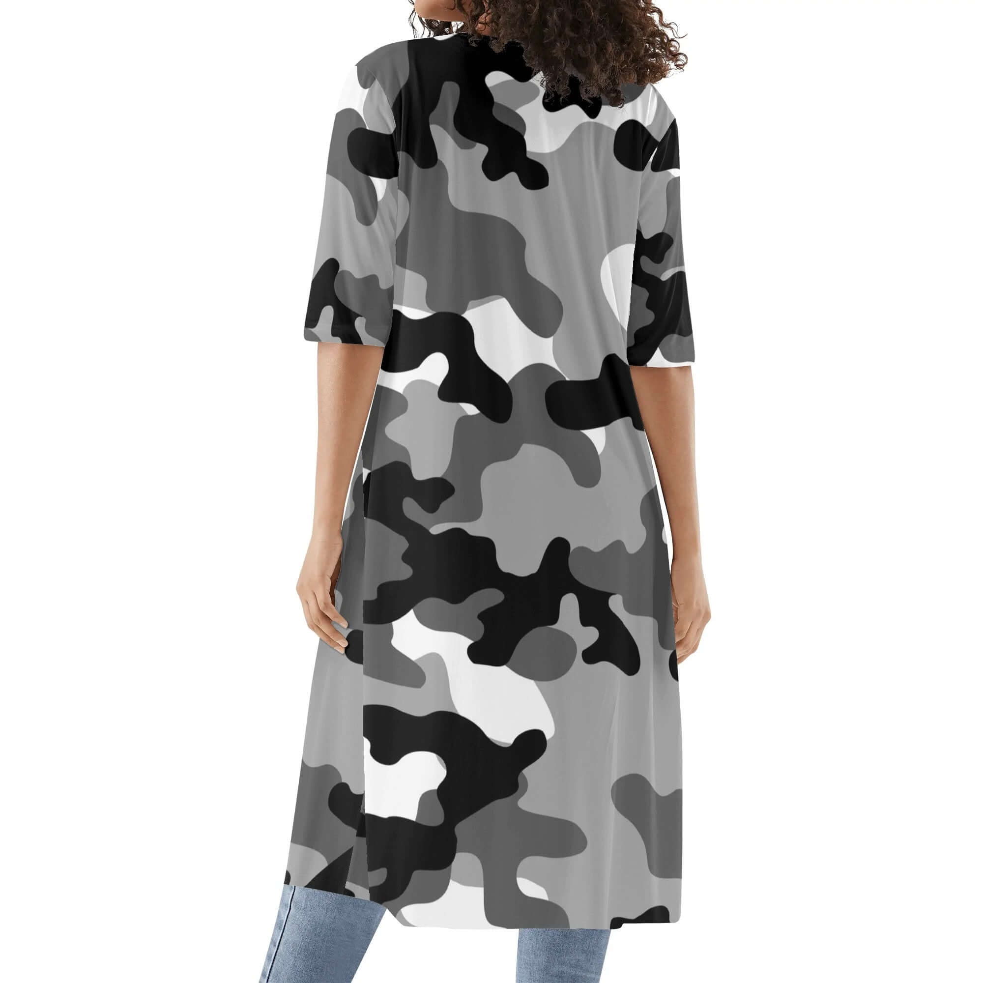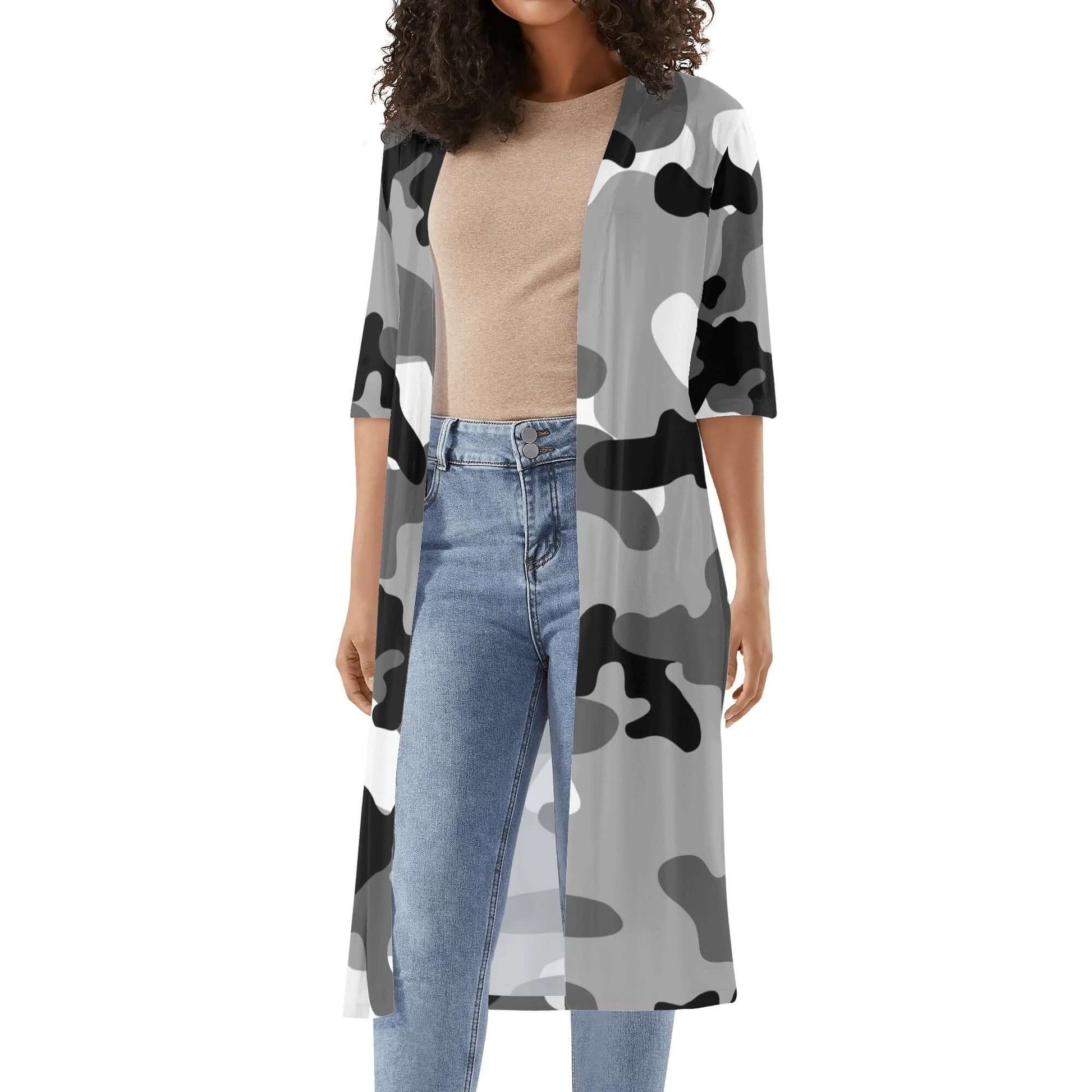 Effortlessly exude a cool, edgy vibe with our Camo Kimono. Featuring a bold Black, White & Gray Camouflage design and stylish half sleeves, this piece is perfect for adding a touch of uniqueness to your wardrobe. Made from high-quality materials, it offers both comfort and style in one.