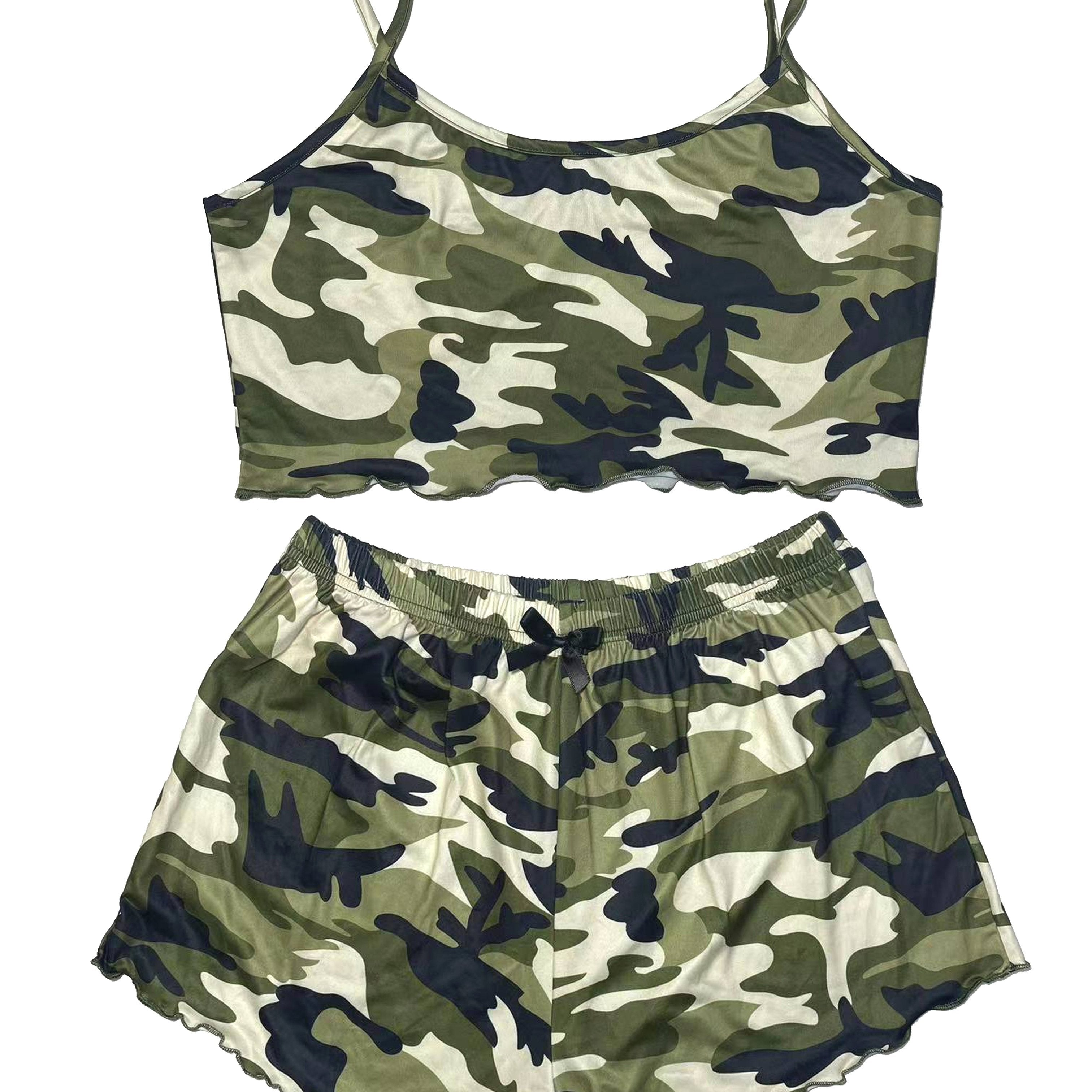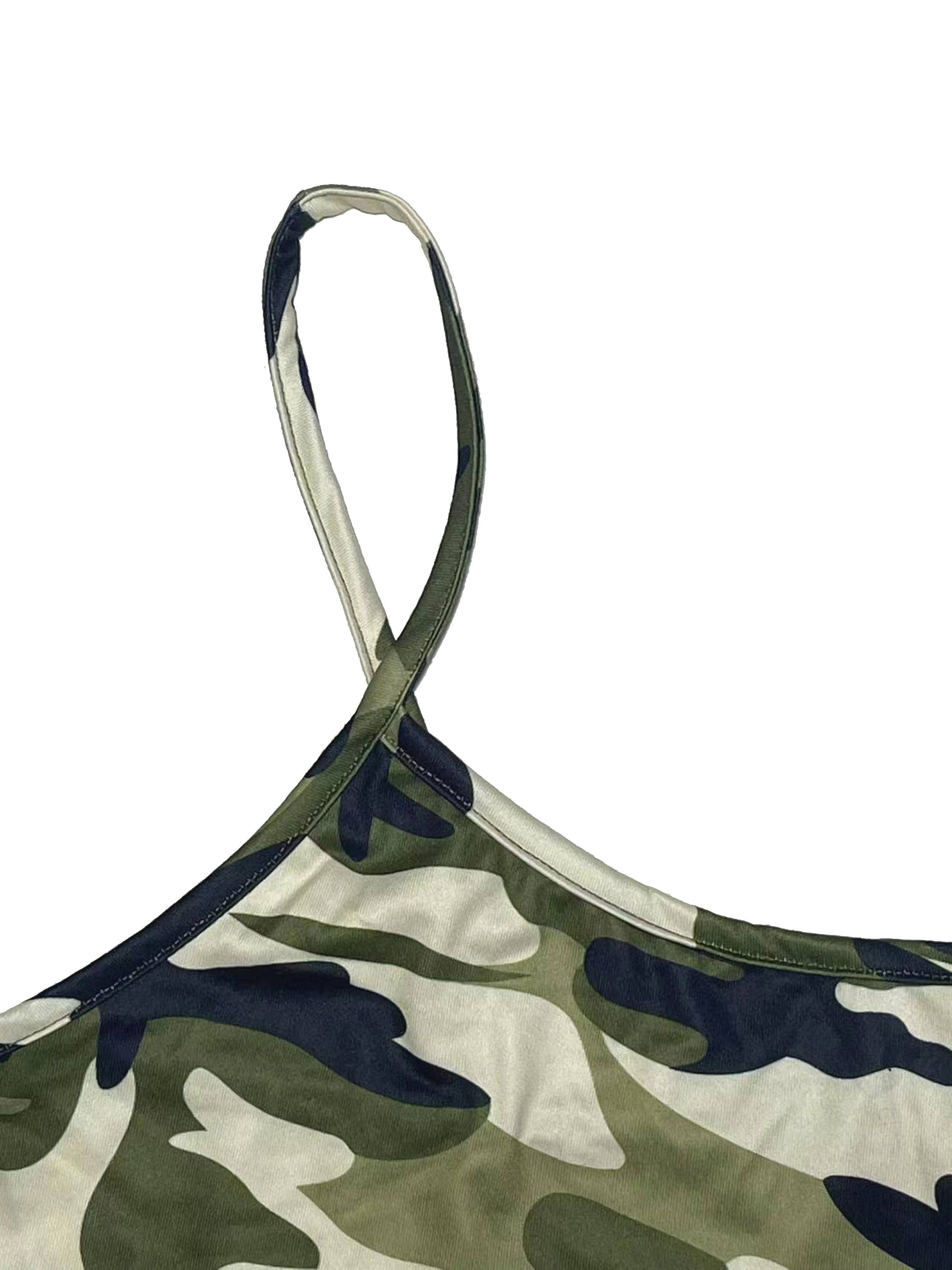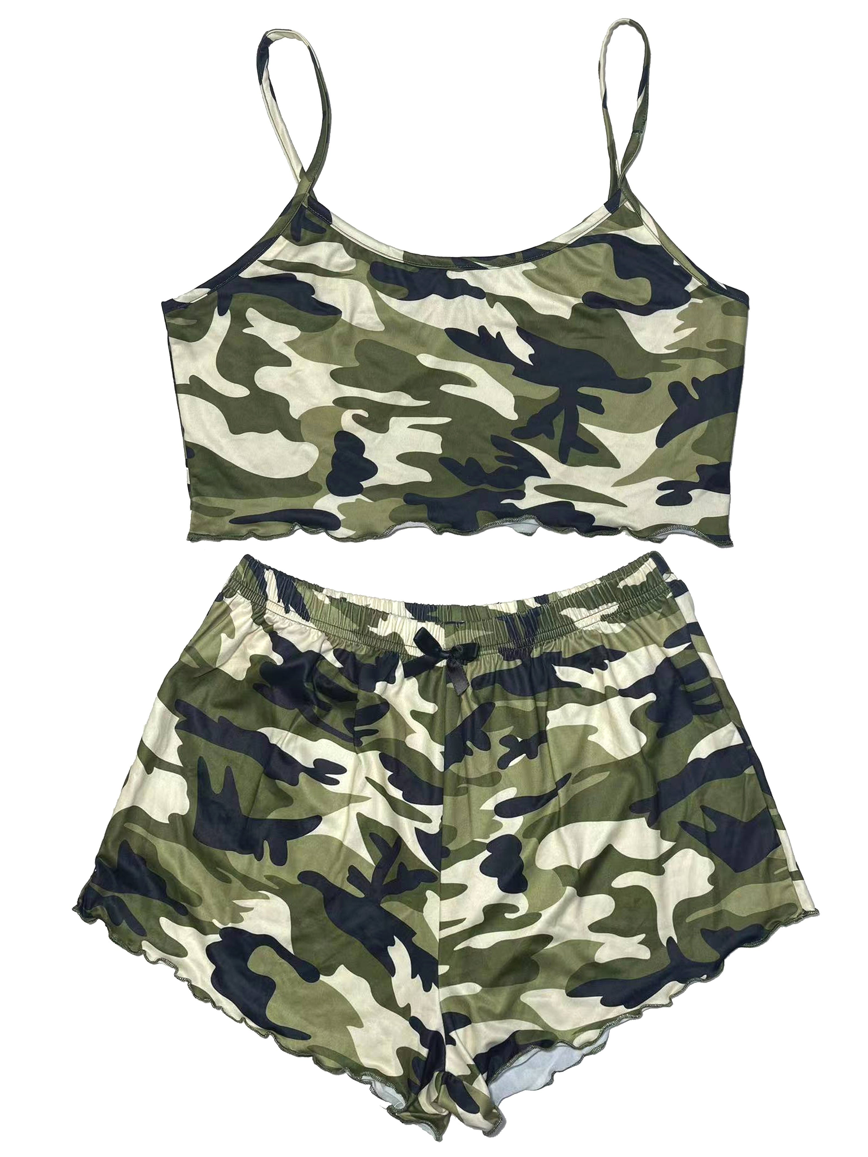 Camo Lounge Set | Sporty Round Neck Backless Crop Cami Top & Elastic Shorts