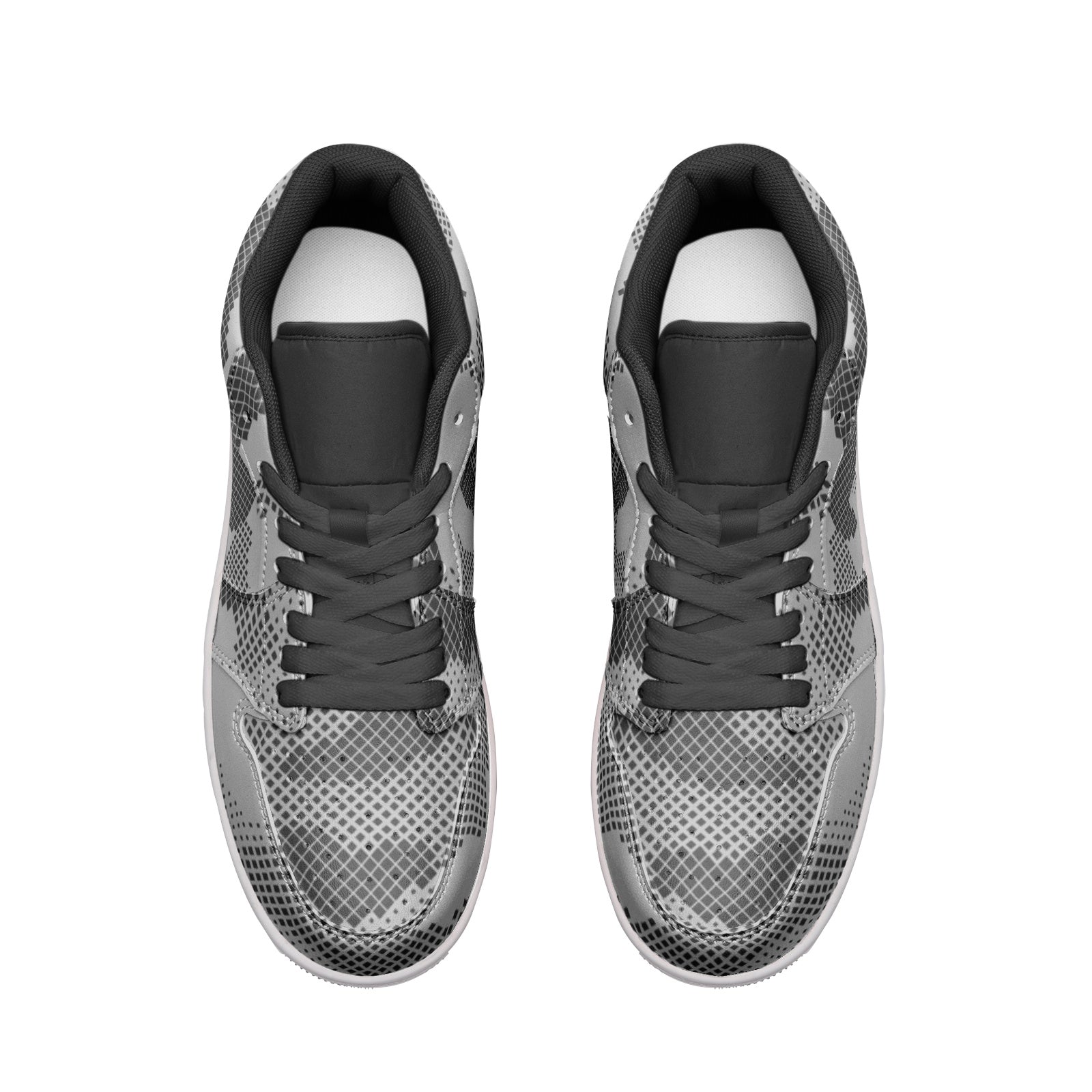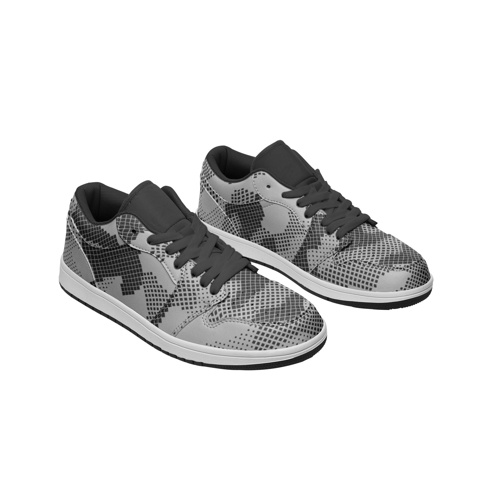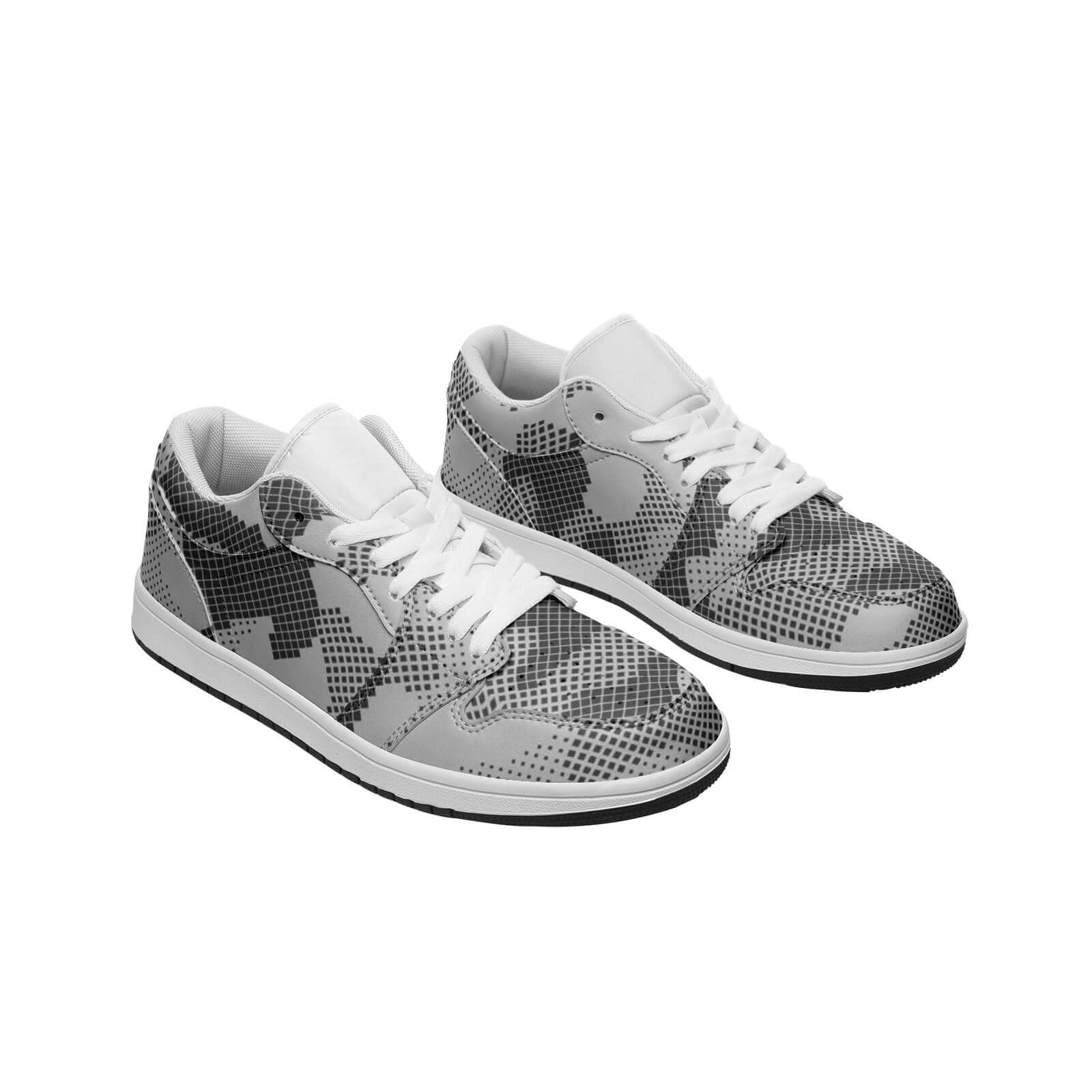 These low top leather sneakers feature a stylish gray digital camouflage design. The high-quality leather material provides durability, while the camouflage pattern adds a unique touch. Perfect for adding a touch of urban edge to any outfit.