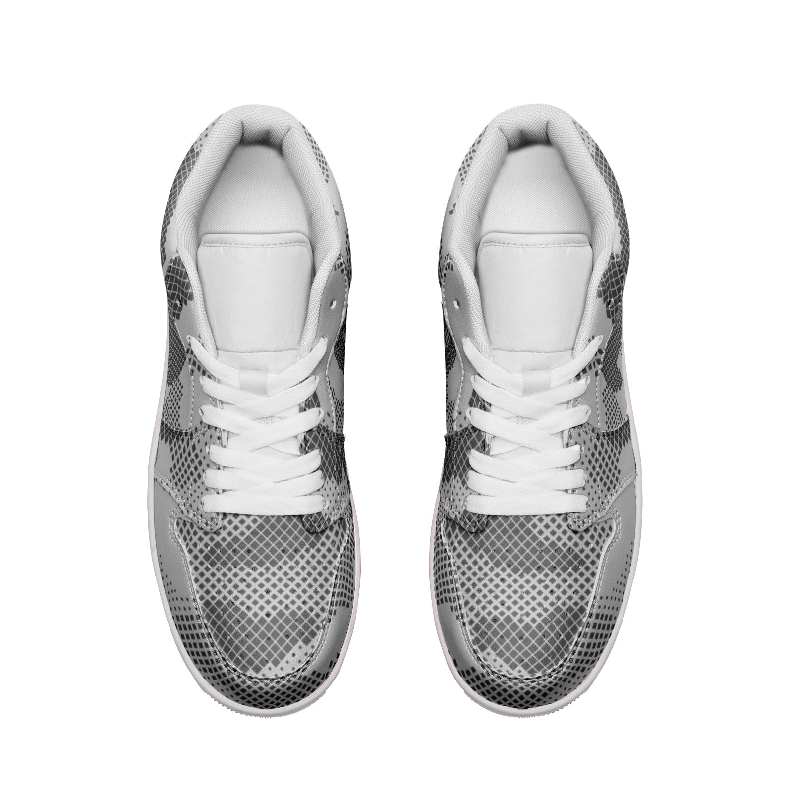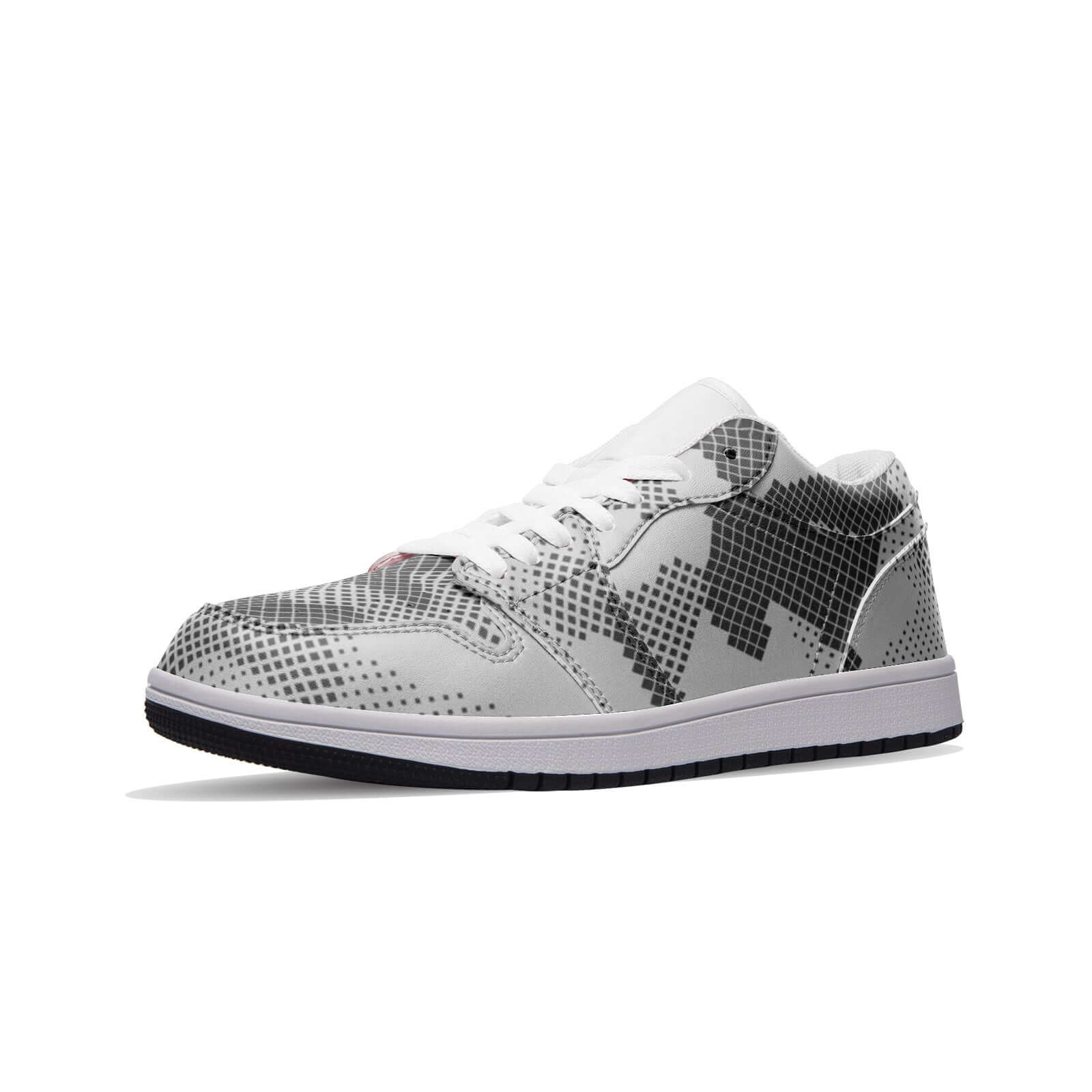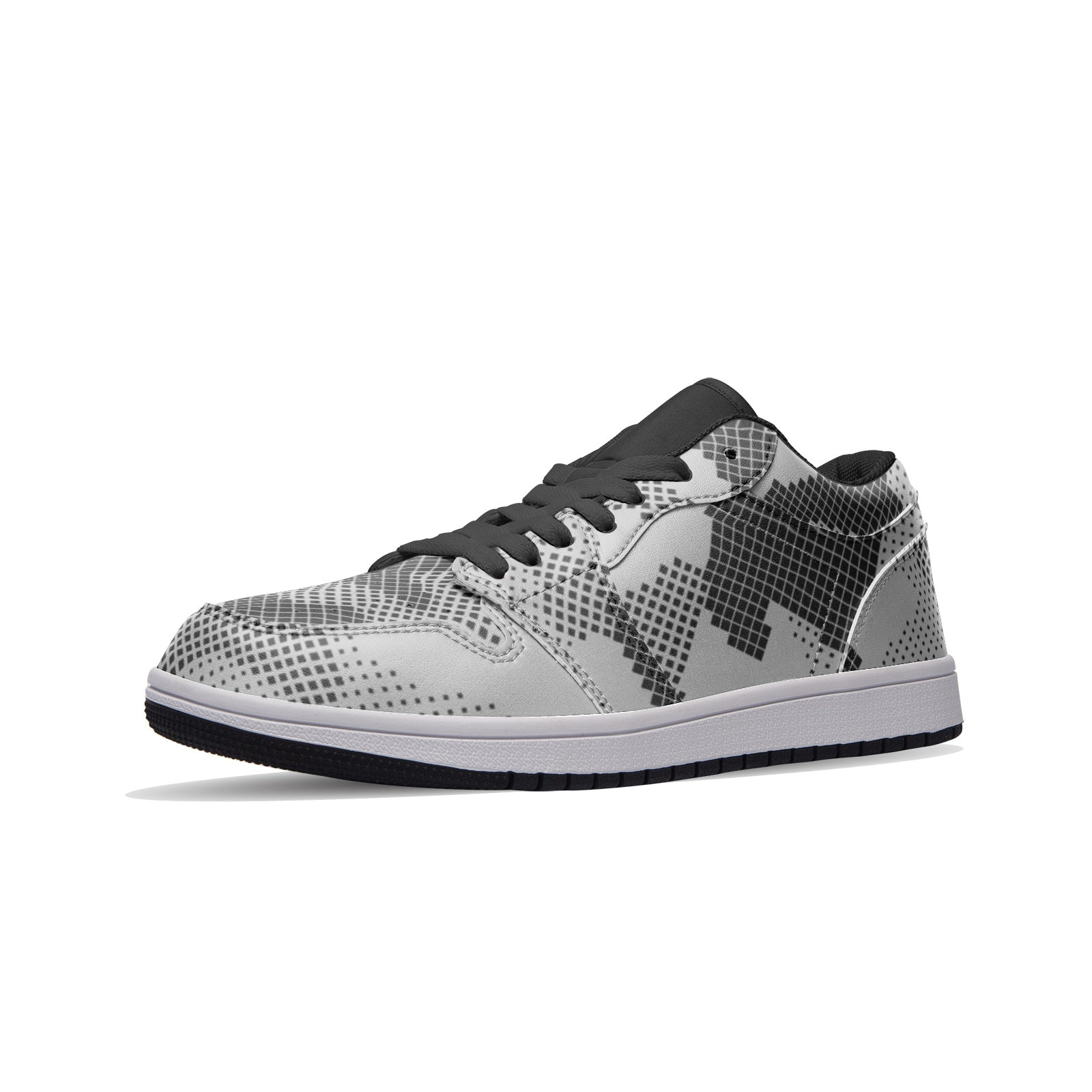 These low top leather sneakers feature a stylish gray digital camouflage design. The high-quality leather material provides durability, while the camouflage pattern adds a unique touch. Perfect for adding a touch of urban edge to any outfit.