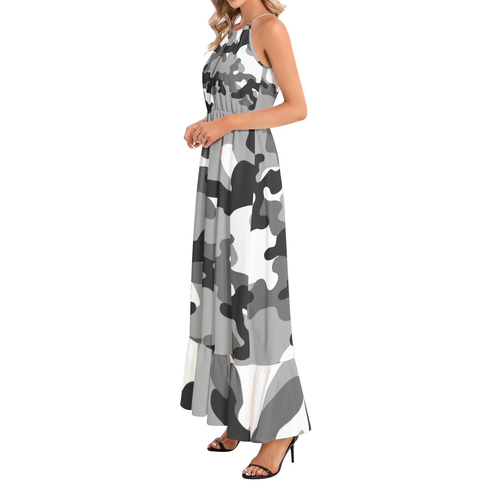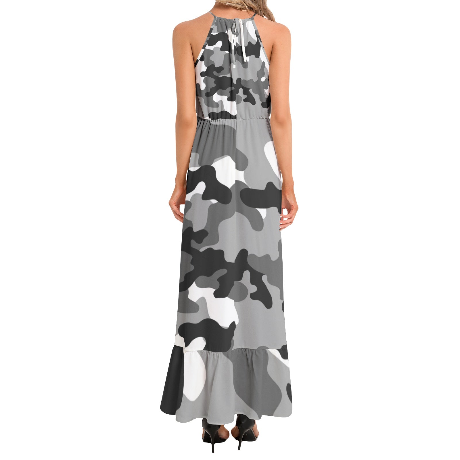 This Camo Maxi Dress features a stylish gray, black, and white camouflage pattern and a flattering ruffle hem. Made from high-quality materials, this dress will keep you comfortable and on-trend. Perfect for any occasion, it's a must-have for any fashion-forward wardrobe.
