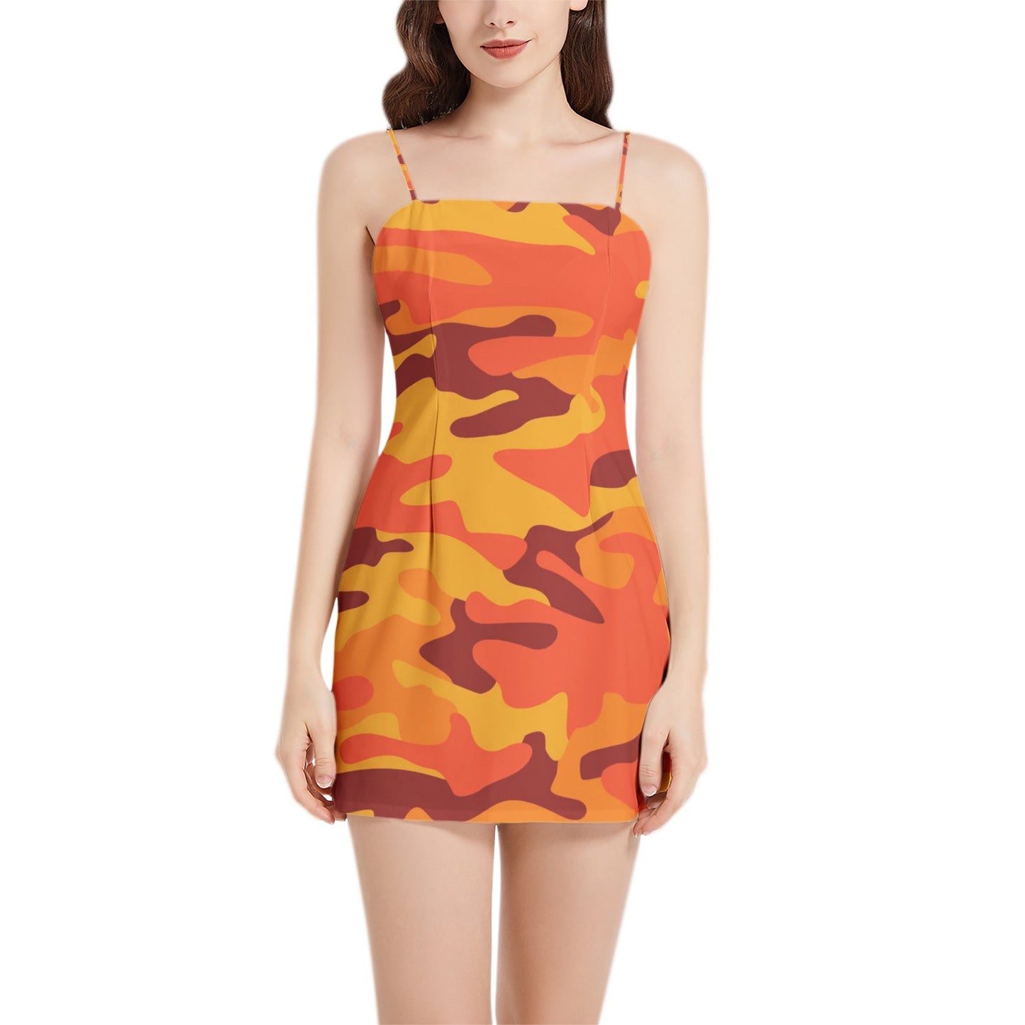 Stay on-trend with our Camo Mini Dress in a bold Orange & Red Camouflage print. Featuring spaghetti straps and a fitted silhouette, this dress is perfect for any casual occasion. Made with high-quality fabric for a comfortable and stylish look.