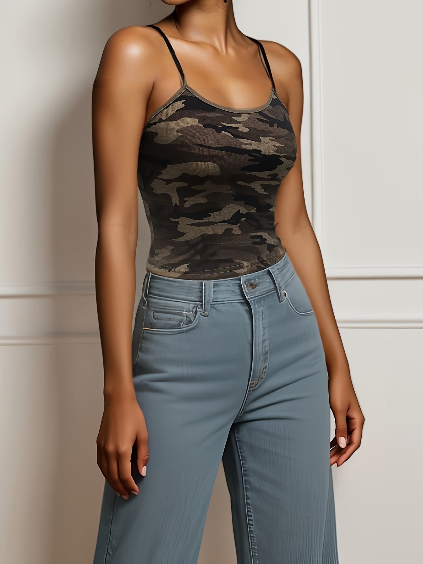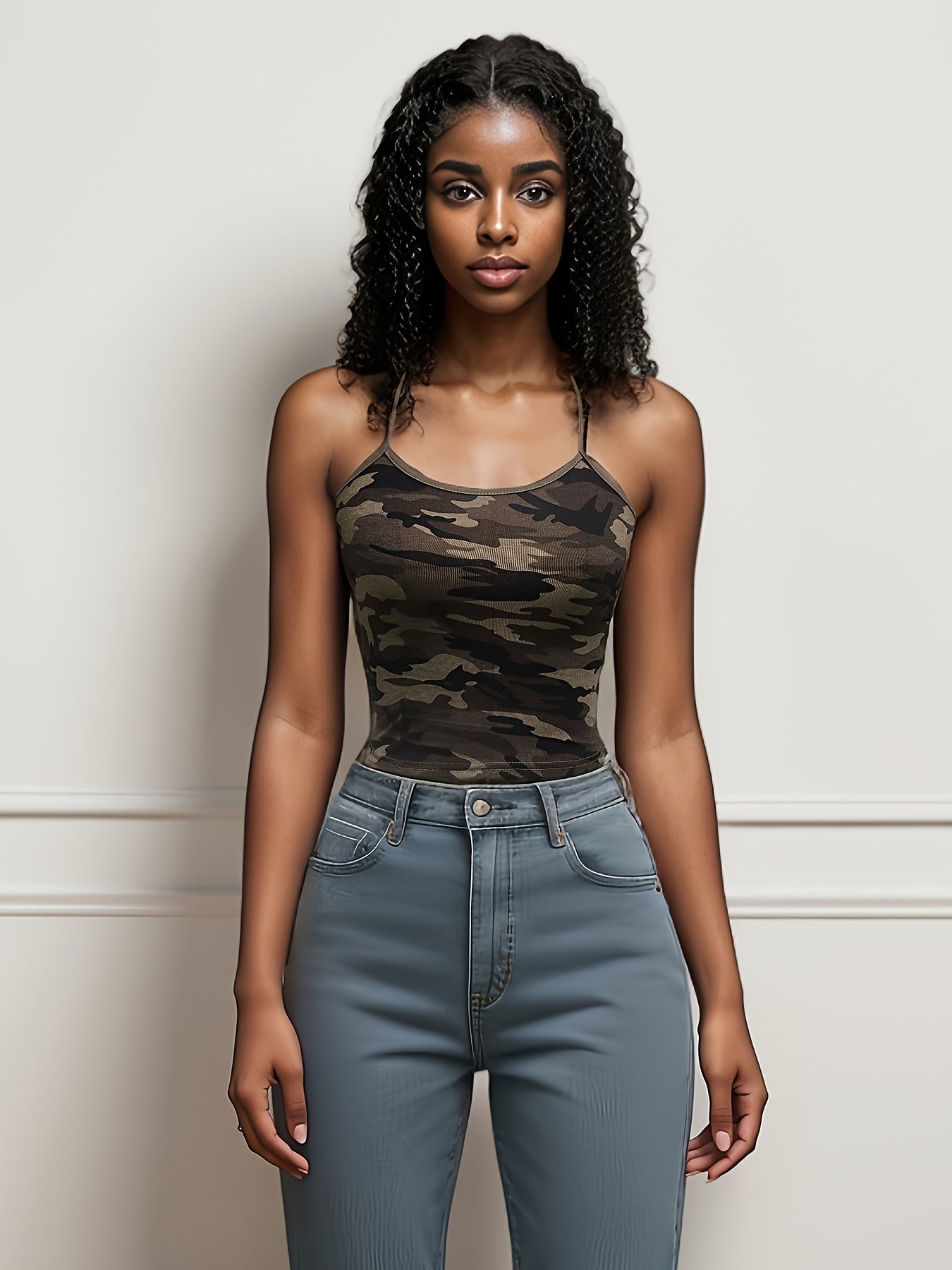 Camo Print Knit Crop Top for Women | Off-Shoulder Sleeveless Tank