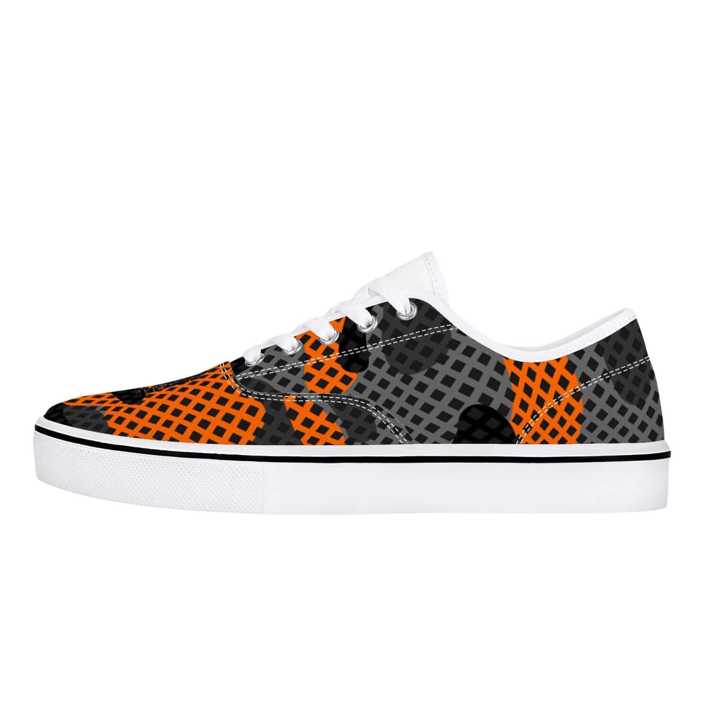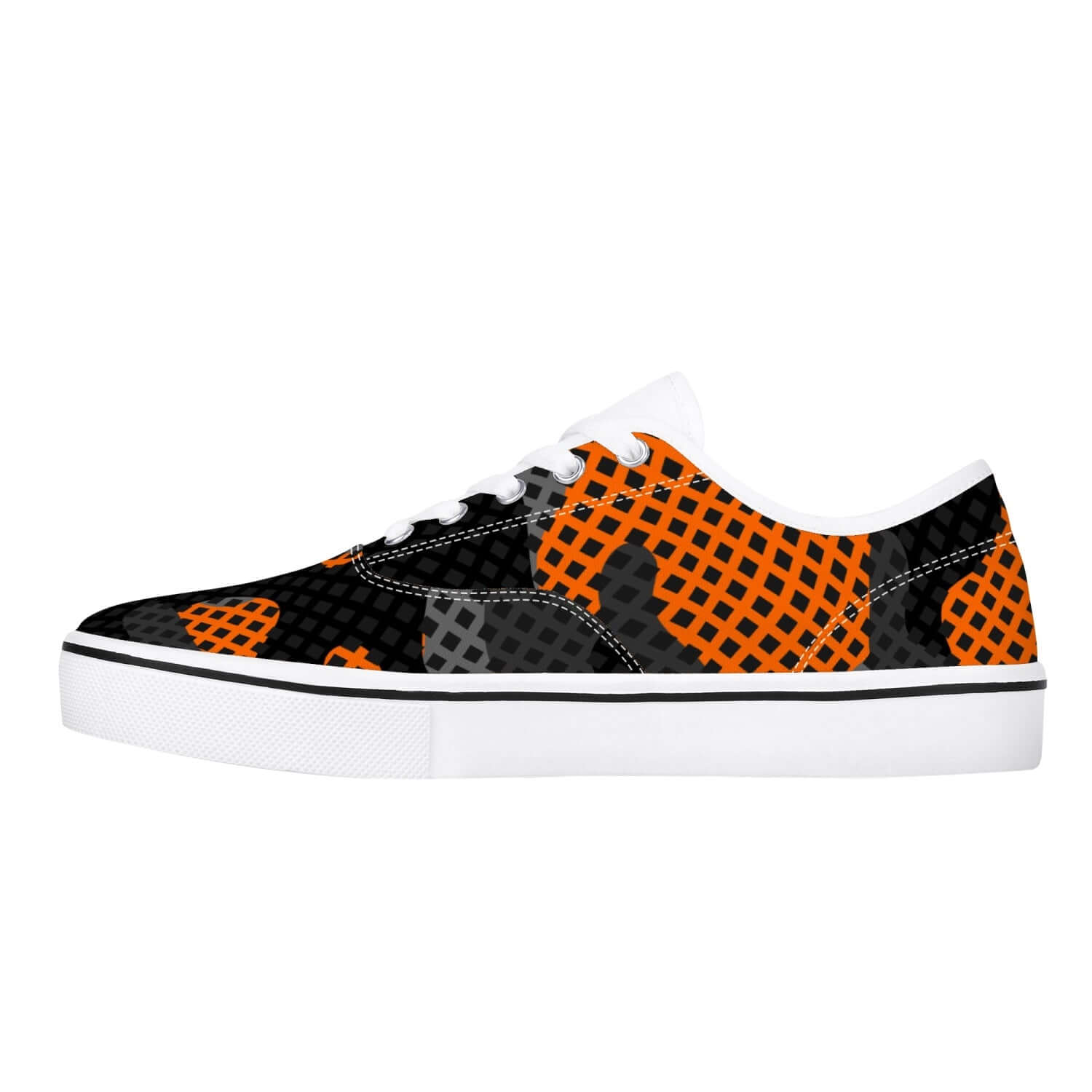 Stand out on the streets with these Camo Skate Shoes in a vibrant orange and black pixel camouflage pattern. Designed for maximum comfort and durability, these shoes are perfect for skating, walking, or any streetwear occasion. With a unique camo design, you'll be sure to turn heads and make a statement.